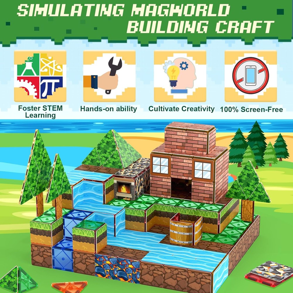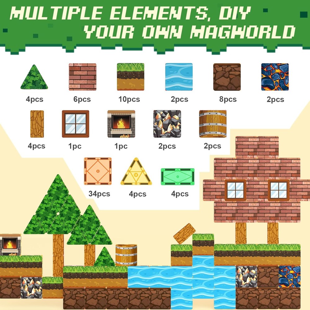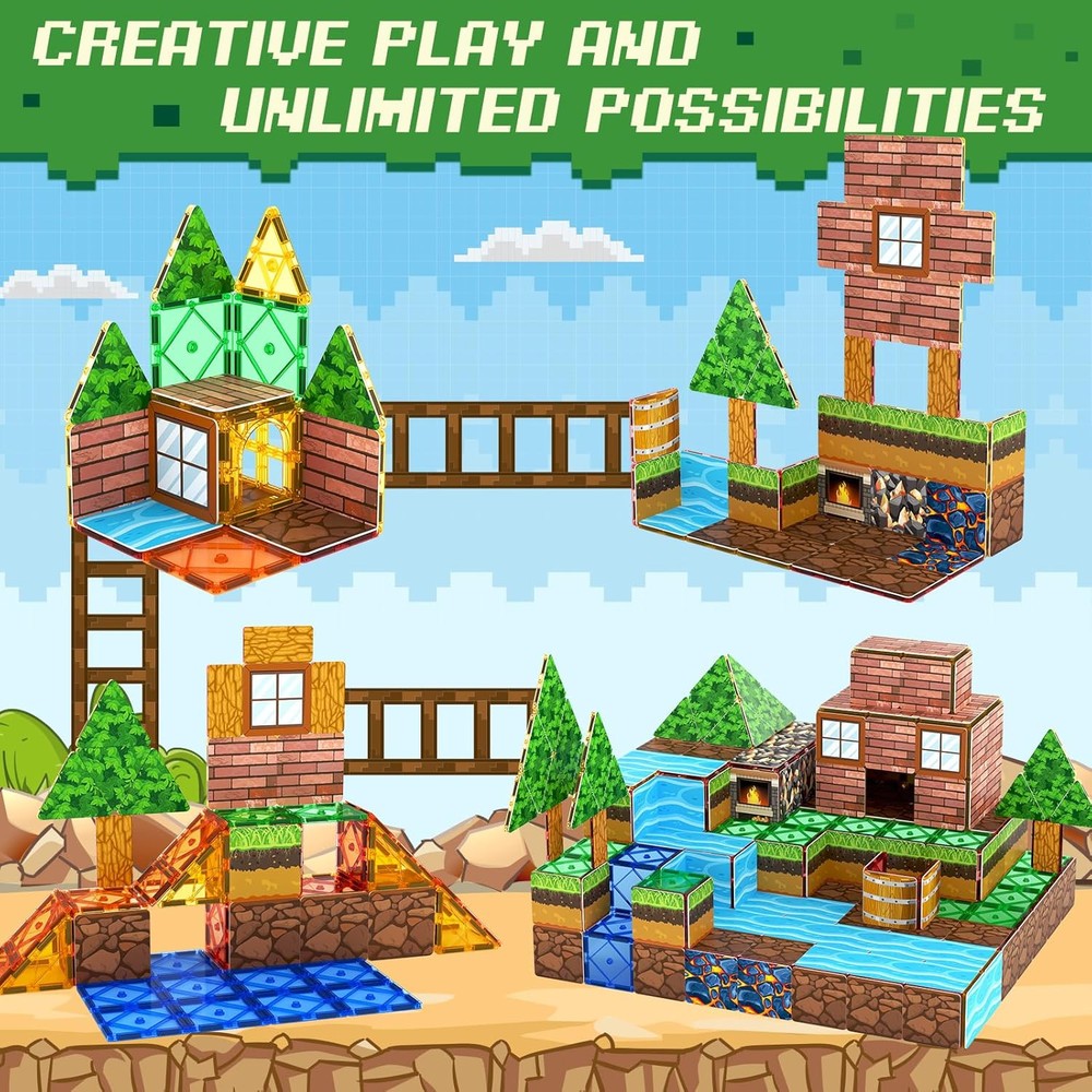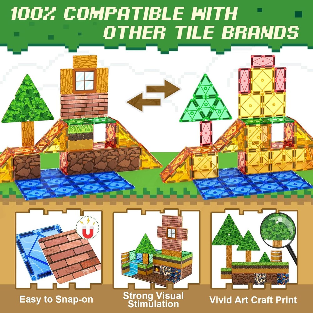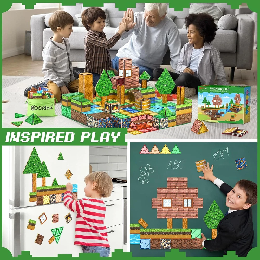 Magnetic Building Blocks Stimulate Mine Magworld Building Craft 84PCS Magnetic Tiles Toppers Construction Game Playset Kids Toys Learning Sensory Toys Gift for Age 4-6, 5-7, 8-12 Boys Girls Gamers Product Details Product Dimensions: 9.84 x 6.1 x 2.76 inches Item Weight: 3.74 pounds Item model number: CTB-84 Manufacturer recommended age: 36 months - 8 years Manufacturer: Gooidea 【GAME INSPIRED MAGWORLD BUILDING CRAFT】 Nurture kids’ imagination and creativity with this stimulating magworld building craft magnetic tiles playset - featuring designs like grass, crown, gold ore, red bricks, and more, these highly detailed toppers are easy to snap-on magnetic tiles, you can piece together 2D scenes on fridges or doors, and create 3D simple buildings on anywhere you want. Just get off screens, let’s mine, build, and explore … 【ENHANCE MAGNETIC TILE PLAY】 Vivid crafted toppers are 100% compatible with all the major magnetic tiles brands. Perfect for combining with magnetic toy collection to expand the universe of magworld building. Say green magnetic tiles can be crown or grass, while blue pieces can be water, river or ocean, orange and red pieces can be fire or autumn sense … Kids will never run out of unique and creative ideas on how to set it up for their imaginary world. More pieces, more possibilities. 【QUALITY AS TOP PRIORITY】 For kid's toys,safety is the first priority. Our magnetic tiles are made of Food-Grade ABS plastic, every piece is shaped with smooth edges, and the toppers are made from premium PVC material, foam and magnetic iron, wipeable and waterproof. Unlike disposable paper tapes, our toppers can be reused for years. Get more the same series playsets as your little builders mentally grow up. Game enthusiasts of any age will surely like it. 【UNLEASH KIDS CREATIVITY & IMAGINARION】 Gooidea new magworld playset is a kind of simulating building toy that gives kids a different way to enjoy the polular game. It is great for facilitating open-ended play, promoting STEM learning and spark kids’ imagination through creative play. Perfect for educational application while improving creativity and hands-on skills, 100% screen-free games and learning activities. Recommended learning toys for kids age 3+, and also sensory toys for kids with ADHD/ASDs. 【KIDS WILL REALLY DIG】 Versatility, educational and endless creative possibilities, Gooidea Magnetic Tiles Magworld Building Craft Playset makes a great gift for avid fans and games, toddlers, preschoolers, teens, boys and girls age 4-6, 5-7, 8-12 on birthdays, holidays, Christmas or any special event. Just get off screens, let’s mine, build, and explore …
