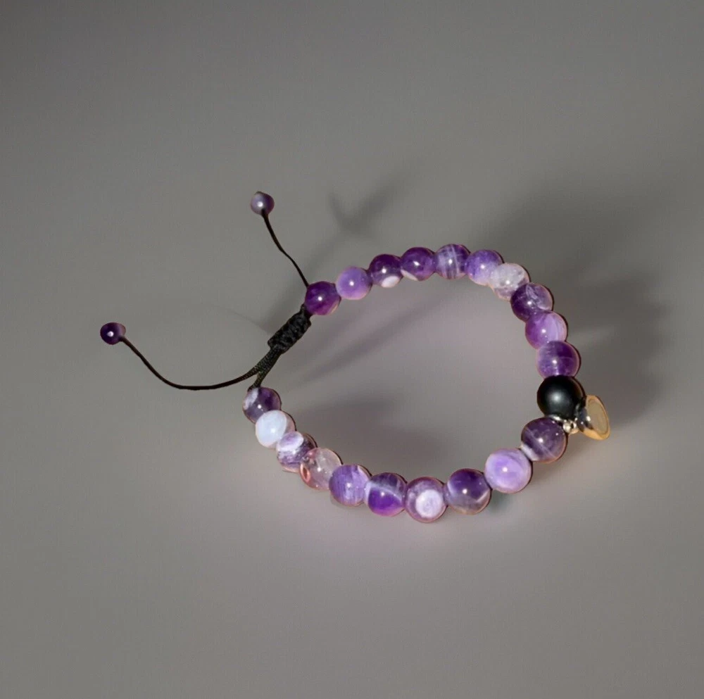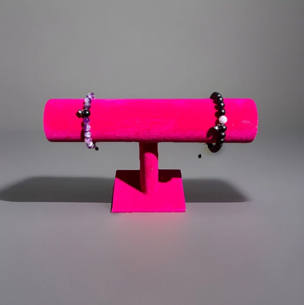 Set includes one stunning amethyst bracelet and one stylish onyx bracelet, both featuring a round gemstone with a width of 8mm. The bracelets are made of durable stainless steel and feature a magnetic closure, making them easy to put on and take off. Bracelets have adjustable rope chain which ensures a comfortable fit for all wrist sizes. New Without Tags, never worn.