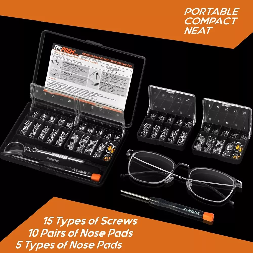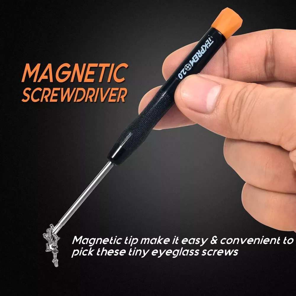 TEKPREM Magnetic Eyeglass Repair Tool Kit, Eye Glasses Repairing Screwdriver Set with Eyeglass Screws,Silicone Nose Pads,Tweezer,Small Screwdriver for Eyeglasses,Sunglasses and Nose Pads Replacement [Comprehensive Glasses Repair Kit]: All-inclusive Eye Glasses Repair Kit, featuring 15 assorted screw types, 1 small Phillips and 1 flathead screwdrivers, 10 pairs of different-sized silicone nose pads, 1 keychain screwdriver, 1 curved precision tweezer, a superfine fiber glasses-specific cleaning cloth. All these essential tools are neatly arranged within a convenient and portable plastic case, ensuring effortless storage and easy access whenever needed. [Eyeglass Repair Kit with Screws]: There are two individual 10-grid plastic boxes containing 15 varieties of eyeglass screws and 10 pairs of silicone nose pads. All the screws are securely placed in their respective grids, ensuring they remain well-organized and minimizing the risk of accidental mixing or spillage. These eyeglass screws are commonly utilized for repairing eyeglass frames, hinges, decorations, frameless designs, and for replacing nose pad screws. [Magnetic Eyeglasses Screwdrivers]: This eyeglass tool kit comes equipped with two small magnetic screwdrivers: a 2.0mm flathead screwdriver and a 2.0mm Phillips screwdriver. The magnetic tips facilitate effortless retrieval of these tiny eyeglass screws, making the process exceptionally easy and convenient. [Screw in Silicone Nose Pieces]: This kit offers a selection of 5 different types, totaling 10 pairs of silicone and plastic nose pads. Among them, you'll find 3 varieties of silicone nose pads and 2 types of plastic nose pads, available in both golden and silver-grey colors. These diverse nose pads effectively cater to a wide range of needs for eyeglass nose pad replacements, ensuring ample choices for your convenience. [Essential Precision Tweezer]: The precision curved tweezer in this kit is an indispensable tool for effortlessly picking up tiny screws or nose pads during repairs. Its pointed and sharp design ensures ease in handling, making eyeglasses repair a smooth process. Thanks for Shopping with us!!!