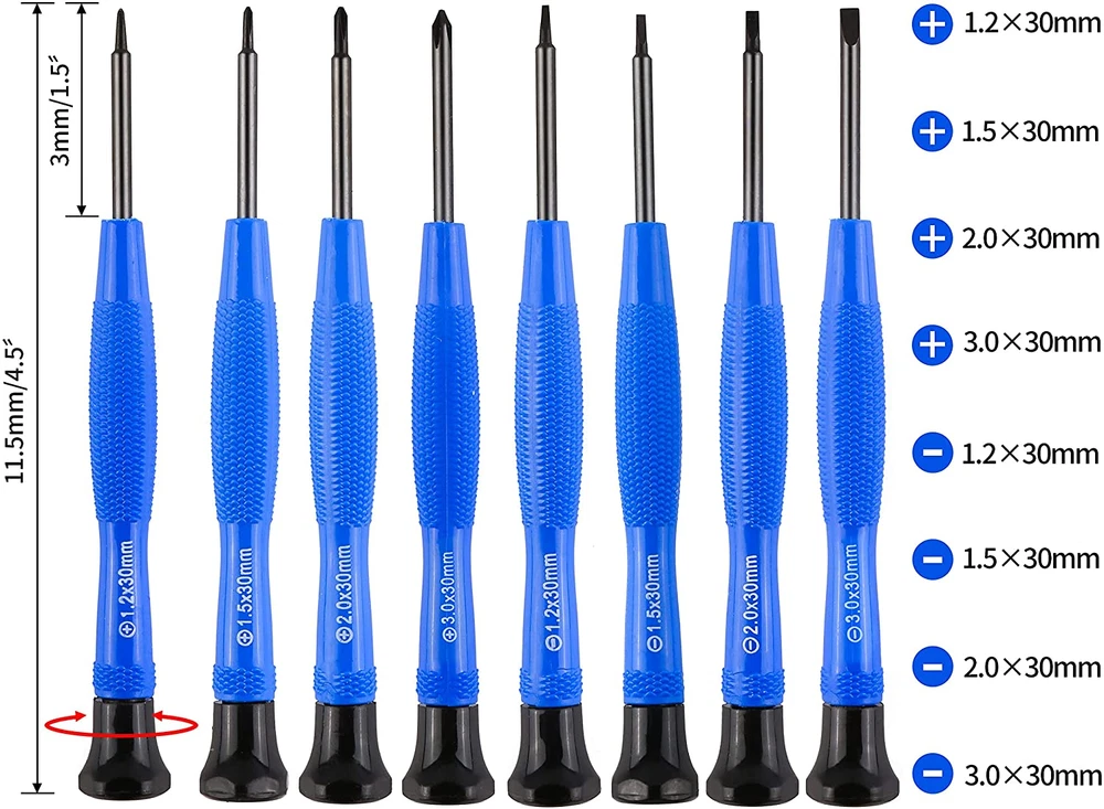 π Complete & Exquisite Eyeglass Repair Kit: Our eye glass repairing kit includes 4pcs Phillips and 4pcs Flathead magnetic screwdrivers, 16 sizes of tiny eyeglass screws, 14 pairs of eyeglass nose pads(7 different sizes), 1 curved tweezer, 1 micro screwdriver, washers, nuts, screw caps, cleaning cloth and screw box for glasses repair. With this glasses repair kit, you can repair your glasses everywhere whether you want to change nose pad or your glasses screws are aging or missing. π§‘ Useful & Comfortable Precision Magnetic Screwdriver Set: We have PH0000/1.2, PH000/1.5, PH00/2.0, PH0/3.0 Phillips screwdriver set and 1.2mm, 1.5mm, 2.0mm, 3.0mm Flathead screwdriver set in our glasses repair kit that are great for tiny screws. π Multi-functional Keychain Screwdriver: The 3 in 1 keychain screwdriver includes Phillips and Flathead screwdriver and nut holder, which is designed for eyeglasses repair, but you can also attach it to your key chain for standy applications. π Various Nose Pads & Screws : Our eyeglass repair kit is also equipped with 11/13/15/17mm different nose pads. You can choose according to your needs. Besides, 16 sizes of tiny screws can also meet your requirement. You can use the curved tweezer included in this kit to grip these tiny screws. And they are all included in our screw box, which is quite convenient to collect and carry. π Widely Applications: The Phillip and Flathead screwdriver covers a wide range of works and repairs in our daily life. This repair tool kit can used for eyeglass, sunglasses, watches, clocks and those small electronics with tiny screws. Product Description Flexible with Swivel Cap It is equipped with flexible swivel cap, which is convenient to hold in hand and freely turn with swivel cap, good for long time use. Complete Screwdriver Set Our eye glass repairing kit includes 4pcs Phillips and 4pcs Flathead screwdriver, which are PH0000/1.2, PH000/1.5, PH00/2.0, PH0/3.0 Phillips screwdriver set and 1.2mm, 1.5mm, 2.0mm, 3.0mm Flathead screwdriver set. Non-slip Handles The handle of the screwdriver set is made of plastic, which is non-slip when using. You don't need to worry about falling it down easily.