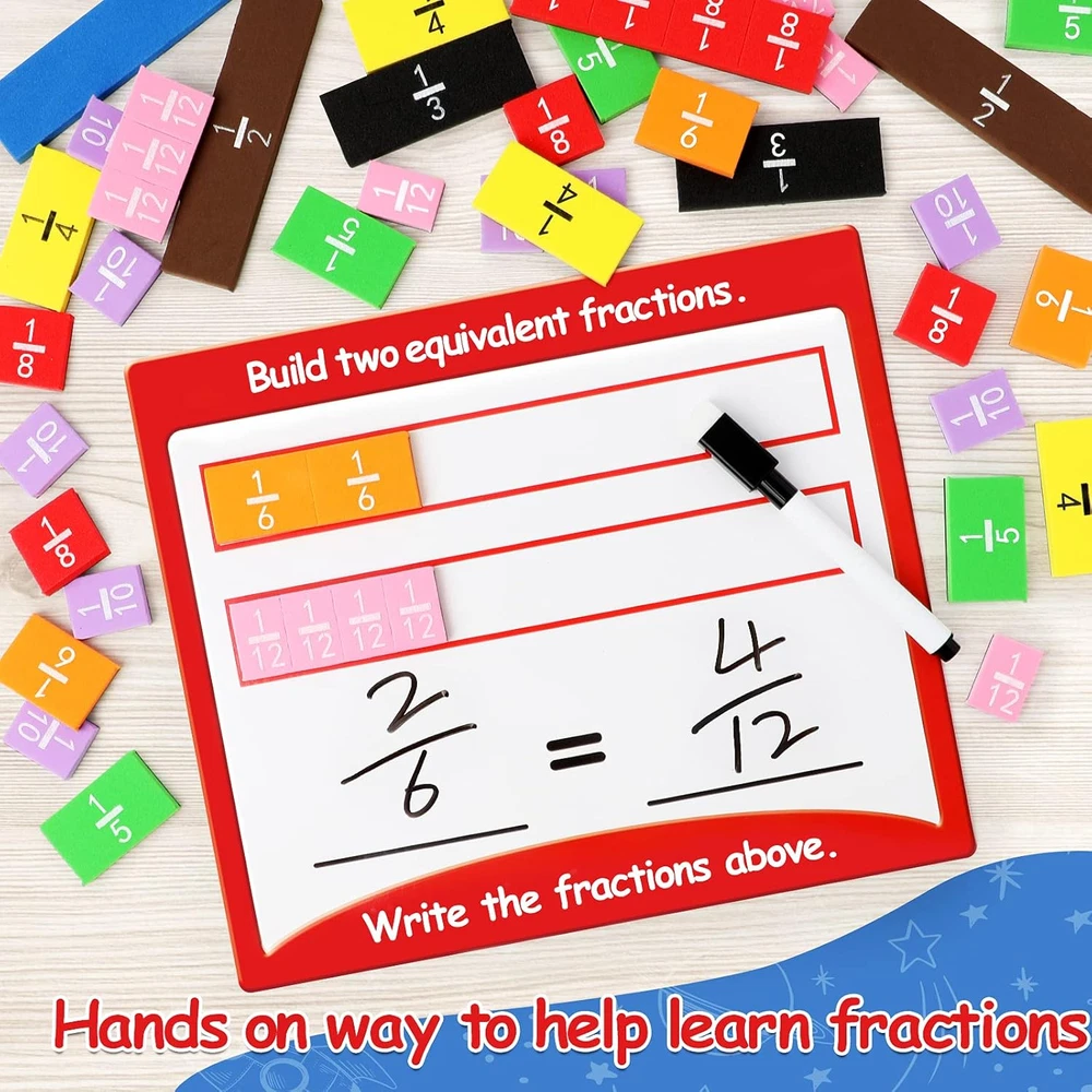 Build Math Skills: Our set is filled with engaging activities to help students master simple fractions! The fun, hands-on and interactive approach allows parents to teach with multiple modalities! Explore Equivalencies: Our set includes 102 easy-grip foam pieces representing both circle and bar fractions, plus 14 activity cards that prompt children to build a variety of fractions from halves to twelfths. Students simply combine fraction pieces to cover the shaded area of circles on the cards, then write corresponding fraction equations in the write & wipe space below. EVA Material: All place value counting blocks are made of EVA foam, flexible enough to not hurt kids’ tiny hands, water washable and fadeless. The back side adopts soft magnetic rubber, easily attached to any iron objects like refrigerator. Demonstration Ready: Rainbow segments are based with magnets, easy access for whiteboard demonstration. Bright color catches students’ attention and makes the fraction easy to be distinguished. Full circle measures 3.5" in diameter and full rectangular piece measures 9.5" in length. Master Fractions with Ease:Torlam Magnetic Fraction Tiles and Circles are a great educational toy for children, parents, teachers and educators. Perfect for learning at school or homeschooling! These fraction math manipulatives make learning fractions easy and fun for elementary (k-3) school students. Product description Proportionally-sized for easy learning Help students visualize parts of a whole and explore concepts of equivalency in a highly concrete way! Math Manipulatives Encourage children to use the manipulatives to practice fraction skills on their own! Demonstrate fraction equations Keep track of fraction values with the color-coded, rainbow circle pieces. Kids can use pieces to calculate addition and multiplication equations.