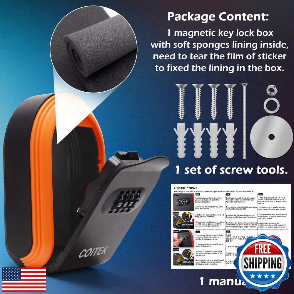 Magnetic Key Holder with Lock,Magnetic Key Box with Combination Lock Hidden Under Car, Key Safe Box with 5 Strong Magnet Secure 4-Digit Combination with Resettable Code(Orange) Features 5Pcs Strong Magnetic Design :Magnetic key lock code box equipped with 5 strong magnet, securely attached to your car, firmly grip any metal surface,5P magnet more durable than others. it will firmly stick to your car even if you were on the road at high speed or rough terrain. Passwords Secure Combination Lock:Waterproof Magnet Key Lock Box is designed with a secure combination lock,you can set passwords to protect your key or other stuff, secure 4-digit combination can provide you 10,000 possible combinations,ensuring your stuffs are safe hidden. Large Capacity : Our magnetic key box with lock can not only store car keys, but also can store your stuff, such as USB drive,watch,cash and mores. large capacity meet your multiple storage requirements How To Use:The car window key safe lock box has 2 ways for using, one way is magnet any metal surface(the manual includes,intrduct you can update passwords)Firstly need to pre-set with 0-0-0-0, you can reset your new custom 4-digit code in simple steps;another way is wall mount,you can use your screwdriver to remove the magnet ,then fixed to the wall or board by screws. Waterproof and Durable:Our magnetic key holder under car are made of premium new zinc alloy material and anti-oxidation coating, corrosion resistant and anti-oxidation. it's not easy break and deform. waterproof effect is better than your imagination.It's convenient to store your stuff,free your hands, providing a key lock box for your car,never have to worry about your keys going anywhere. Please not: Please check manual before reset your password Important:If you forgot passwords, you need is the Phillips screw driver off most pocket knives and this thing just swings open. Meanwhile,if you don't need the screws of fully exposed from the outside,you just plug the exposed screw holes with glue Shipping Free & Fast Shipping: We offer free shipping to most of the USA with a normal delivery time of 3-7 days. However, due to the current situation, additional delivery time (up to 3 weeks) may be required for some items. Alternative Carriers: We may use alternative carriers (e.g., USPS, FedEx, UPS) to ensure your package arrives safely and on time. Due to the use of multiple carriers, we are unable to provide a tracking number automatically. Handling Time: Orders are processed and shipped within 1-2 business days of receiving cleared payment. Shipping Restrictions: Shipping to Alaska, Hawaii, Puerto Rico, Guam, and other US territories may incur shipping charges or delivery restrictions. Please contact us before ordering, or your order can be refunded/cancelled. State Restrictions: Certain items may not be shipped to California due to state regulations. Contact for Tracking Updates: If you require tracking updates or have any concerns about the delivery of your order, please feel free to contact us, and we will be happy to assist you. Return Policy 30-Day Hassle-Free Returns: If you are not completely satisfied with your purchase, you can return the item for free within 30 days of receiving it for a full refund or exchange. Easy Return Process: Contact us, and we will provide you with a prepaid return shipping label and detailed instructions. No Restocking Fee: There are no restocking fees for returns. However, the buyer is responsible for return shipping costs if the return is not due to a seller's error. Refund Processing: Refunds will be processed within 1 business day of receiving the returned item in its original condition. Payment We accept all major credit cards, PayPal, and Apple Pay for your convenience. Your payment information is secure and encrypted to ensure a safe and seamless transaction. Please complete your payment within 3 days of purchase to avoid any delays in shipping. Feedback Your feedback is extremely important to us. We strive to provide the best products and customer service possible. If you are satisfied with your purchase, please take a moment to leave us a positive review. If you have any concerns or issues with your order, please contact us before leaving negative feedback. We are committed to resolving any problems and ensuring your satisfaction. Contact Us If you have any questions or concerns, please feel free to reach out to our customer support team. You can contact us through the eBay messaging system. We are available Monday to Friday, 9:00 am to 5:00 pm EST, and we will do our best to respond to your inquiry within 24 hours. Thank you for supporting our small family business!