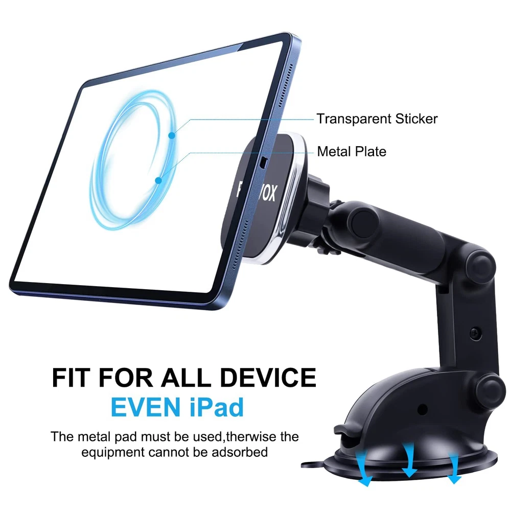 Upgraded Strong Magnetic Phone Car Mount UPGRADED STRONG MAGNETIC FORCE 8 powerful magnets holds the phone more tightly than others on the market (most are only 4 or 6!!). And you will recieve 4 metal plates that you can free choose different thickness and shape POWERFUL STRONG SUCTION CUP Bigger Sticky rubber suction cup with a dashboard pad that provide a stronger and safer magnetic phone mount. ADJUSTABLE ARM Innovative Arm Design make sure that you simply press the nodes to adjust the arms, offer you infinity viewing angles. UNIVERSAL COMPATIBILITY Suitable for iPhone Xs / Xs Max / XR / X / 8 / 8Plus / 6s , Samsung Galaxy S10/S10 Edge/ S10Plus / S9 / S9 Plus / S8 / S8 plus / S7 / S7 edge, Note 9 / 8, etc. Metal Plates Usage Note 1. These metal plates cannot work with MagSafe. 2. Without the phone case, please put the metal plate on the phone's back. 3. With the phone case, please put the metal plate on the phone's back or the phone case's back; 4. These metal plates are only for SMOOTH flat surfaces, not for liquid silicone cases,leather cases,heavy cases or uneven case surfaces. Magnetism Won't Affect Signal Reception Phone holder car magnetic configured the Strongest N52 magnet, and it won't affect the reception of the phone signal in any way. Upgraded Magnetic Force: 8 powerful N52 magnets hold the phone much more tightly than others on the market (most are only 4 or 6!!). And you will recieve 4 metal plates that allow you free choose different thickness and shape. Powerful Strong Suction Cup: Magnetic phone car mount with nano-silica gel pad with ultra sticky adhesive make it mounting firmly on Dashboard or Windshield even with your car on the bumpy of roads and with the heaviest of smart phones. Easy to Use: Loose screw of the magnets. Connect Magnets with rotating ball. Tighten the screw. Clean the adhesion surface and wipe dry. Metal plate sticks to the phone surface. Finally place the phone on the phone holder for car magnetic. Infinite Viewing Angle: Phone holder car magnetic with innovative Arm Design make sure that you simply press the nodes to adjust the arms, offer you infinity viewing angles. Also phone holder car magnetic can be rotated 360 degrees through swivel ball head in any orientation (horizontal or vertical), giving you the ideal viewing experience. Compatibility & Worth-Free Replacement: This magnetic phone mount is compatible with all phones, tablets and case. Universal compatibility iPhone14 Pro Max/14 Pro/14 Plus/14/13 Pro Max / 13 Pro /13 / 13 / mini / 12 / 12 Pro / 12 Pro Max / iPhone 11 / iPhone SE / Xs / Max / XR / X / 8 / 8Plus / 6s , Samsung Galaxy S10/S10 Edge/ S10Plus / S9 / S9 Plus / S8 / S8 plus / S7 / S7 edge, Note 9 / 8, etc. Buy with confidence as every product we offer comes with lifetime replacement from .