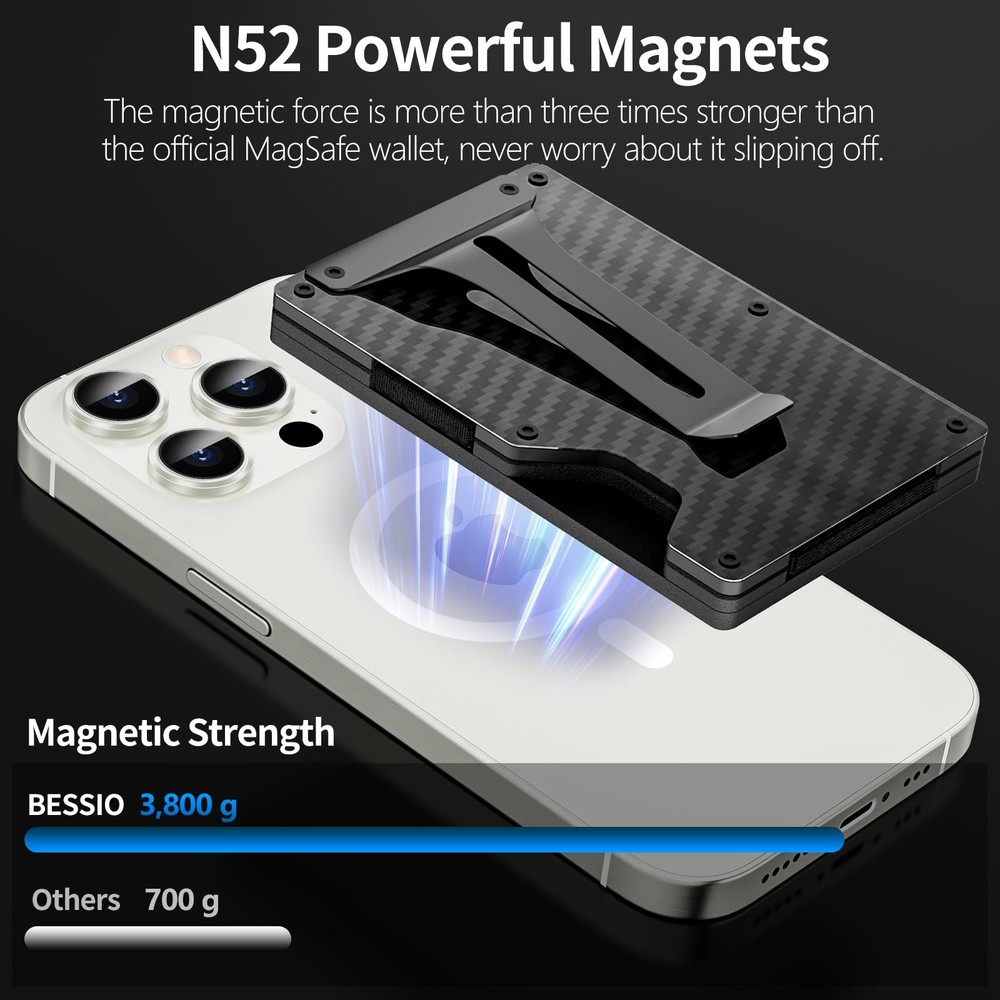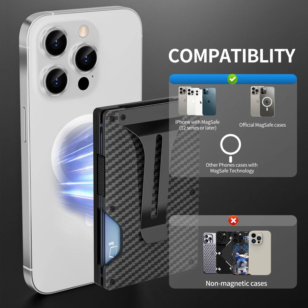 Description Introducing our airtag wallet men – the epitome of style, efficiency, and cutting-edge design! Say goodbye to the era of bulky wallets and welcome a new age of sleek minimalism. This wallet with airtag holder is tailor-made for the latest iPhone models, including the iPhone 15 Pro Max/15 Pro/15 Plus/15, iPhone 14 Pro Max/14 Pro/14 Plus/14, iPhone 13 Pro Max/13 Pro/13/13 Mini, iPhone 12 Pro Max/12 Pro/12/12 Mini. What sets our apple wallet apart is its powerful N52 magnet, ensuring a secure and stylish attachment to the back of your iPhone. No more slipping concerns – it seamlessly stacks on Mag Safe-compatible cases, adding a touch of magnetic sophistication to your everyday style. Stay ahead of the curve with our wallet phone case's integrated AirTag holder, allowing you to effortlessly track its location using the "Find My" app. This fusion of technology and fashion ensures you stand out in any crowd (AirTag not included). Security meets elegance with built-in RFID blocking technology, transforming your wallet for men slim minimalist into a high-tech fortress for your cards. Protect your personal information from electronic theft while enjoying the practicality that defines minimalist living. Crafted from aerospace-grade aluminum alloy, our apple magsafe wallet is a testament to durability and sophistication. Despite its ultra-slim profile, it comfortably accommodates 15 cards and 9 bills, delivering spacious functionality without compromising on style. Upgrade your accessory game and make a statement with a metal wallets for men that blends quality, technology, and the essence of true minimalism. 【Magnetic Phone Wallet】Say goodbye to bulky wallets!Features a sleek and compact design, crafted for efficiency and style, design of iPhone 16 Pro Max/16 Pro/16 Plus/16, iPhone 15 Pro Max/15 Pro/15 Plus/15, iPhone 14 Pro Max/14 Pro/14 Plus/14, iPhone 13 Pro Max/13 Pro/13/13 Mini, iPhone 12 Pro Max/12 Pro/12 /12 Mini. 【Powerful Magnetic Force】Now upgraded with a powerful N52 magnet! Easily adheres to the back of your iPhone, securely in place. Say goodbye to slipping worries. This airtag wallet perfectly stacks on Mag Safe-compatible cases, adding a touch of magnetic elegance to your style. 【RFID Blocking Wallet】 Magnetic wallet for iphone MagSafe serves as a fortress for your cards, featuring built-in RFID blocking technology to safeguard your bank cards from electronic device theft. It ensures the security of your cards without compromising practicality, providing peace of mind for your privacy. 【Airtag Compatibility】Our metal Wallet comes with an integrated AirTag holder. Effortlessly track your mag safe wallet's location using the "Find My" app, achieving the perfect blend of technology and fashion. Its modern design ensures you stand out in the crowd. (Note: AirTag not included.) 【High Quality & Minimalism】Precision-crafted from aerospace-grade aluminum alloy, our iphone wallet redefines durability and sophistication. Despite its ultra-slim profile, it comfortably accommodates 15 cards and 9 bills, delivering spacious functionality without compromising on sleekness.