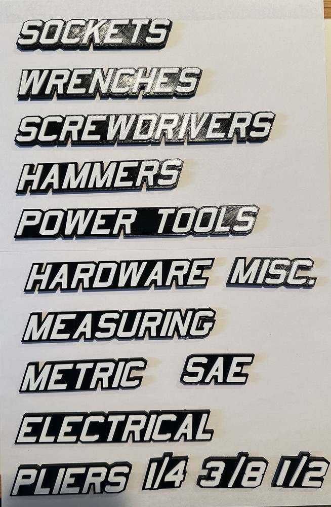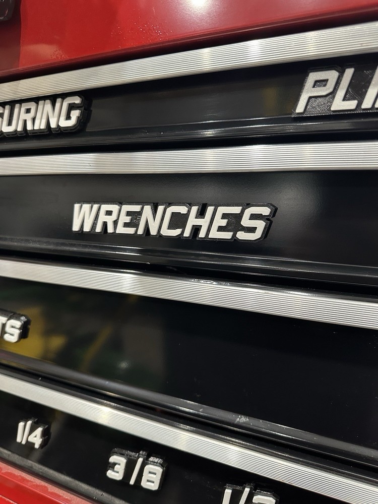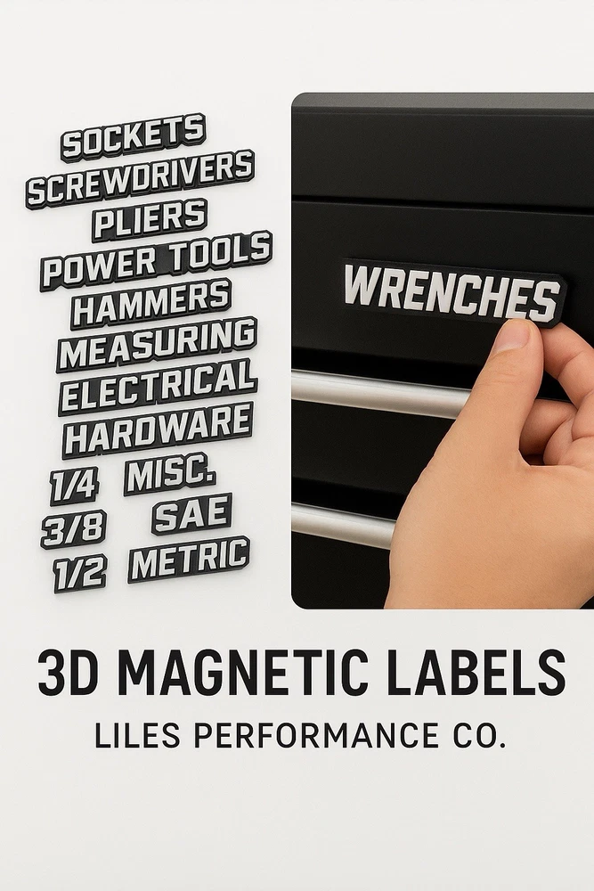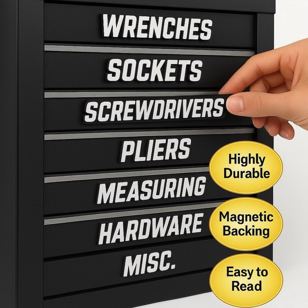 Premium 3D Toolbox Drawer Labels β Magnetic Raised Letter Tags β Set of 15 Organize your workspace with style and precision. These premium 3D magnetic toolbox labels are designed for serious mechanics, technicians, and DIYers who want fast drawer identification and a clean, professional look. Made with durable, high-quality materials, these labels feature bold, raised white lettering on a textured black base for superior visibility and rugged appeal. π§ Included Labels (15 Total): β’ Tool Types: Wrenches, Sockets, Screwdrivers, Pliers, Power Tools, Hammers β’ Organization: Electrical, Measuring, Hardware, Misc. β’ Sizes & Categories: 1/4, 3/8, 1/2, SAE, Metric π§² Features: β’ Magnetic Backing: Strong and secure hold on steel drawer fronts β’ 3D Raised Letters: Easy-to-read from any angle; bold professional look β’ Durable Construction: Resistant to shop grime, oils, and daily use β’ No Adhesive Needed: Installs and repositions in seconds without damage π Dimensions: β’ Height: 1in β’ Thickness: .18in β’ Length: Varies by label (1.5 to 8.5 inches) π§° Perfect For: β’ Tool chests β’ Rolling cabinets β’ Workbenches β’ Home garages or professional shops Proudly made with attention to detail. Elevate your toolbox today with labels that match the quality of your tools. π¦ Ships fast and securely β ready to upgrade your toolbox!