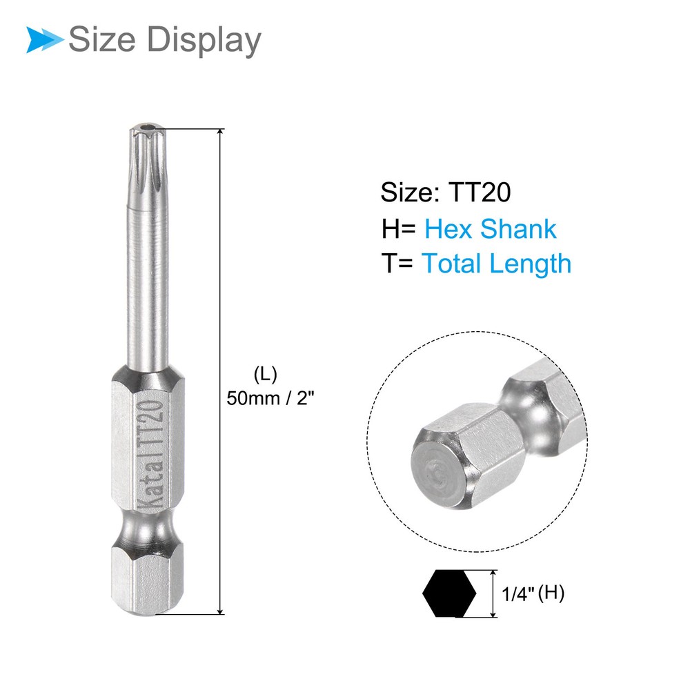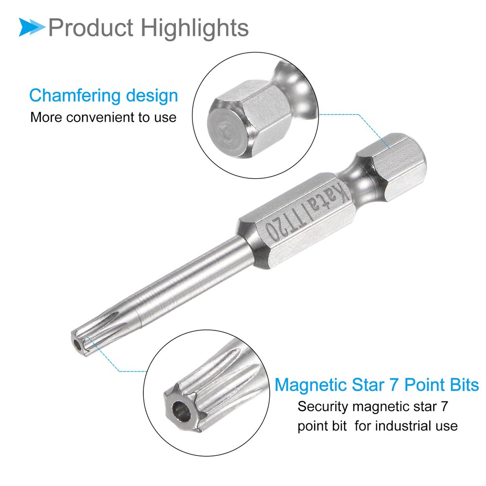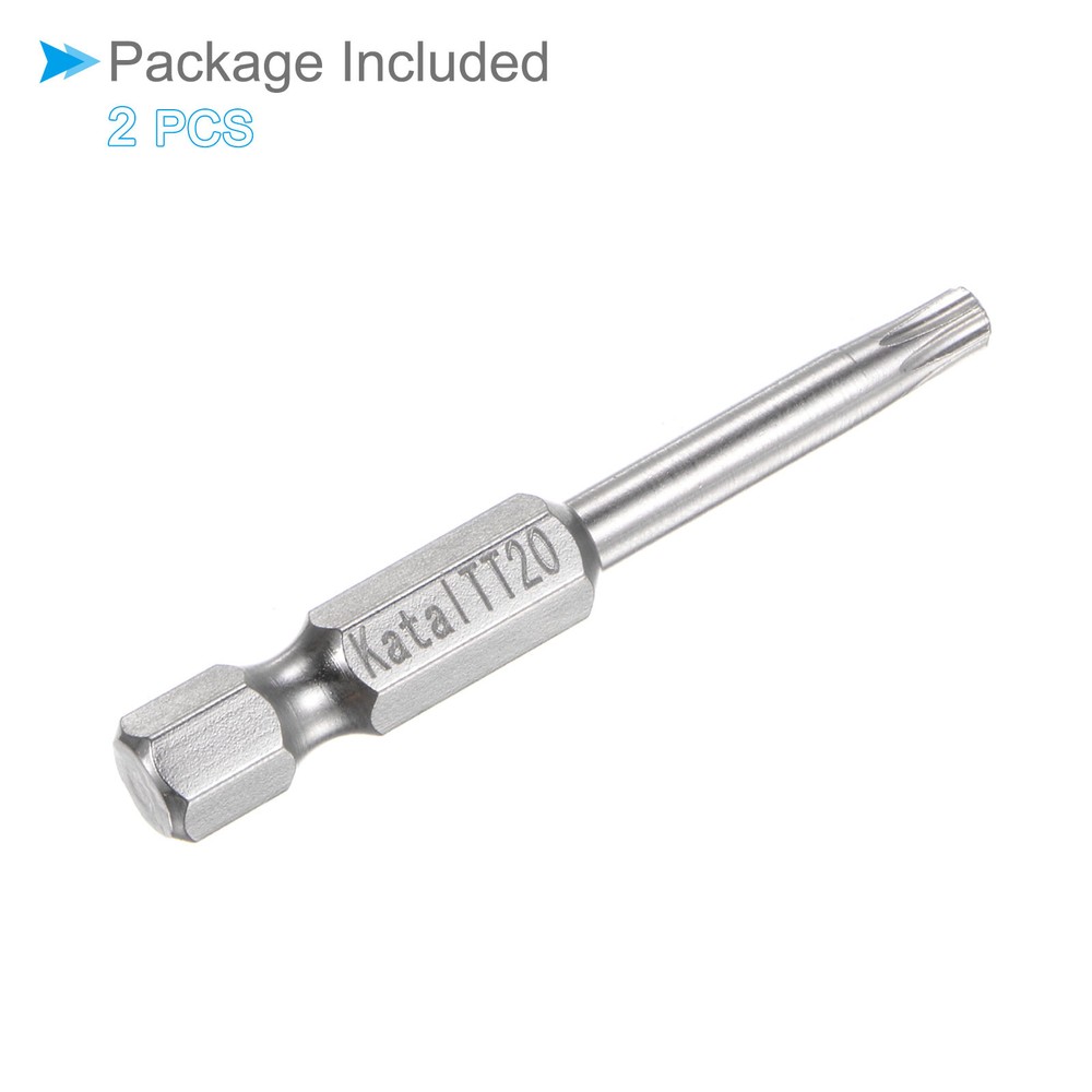 Document Attributes:* Material: S2 Alloy Steel* Size: TT20* Hex Shank: 1/4"* Total Length: 50mm / 2"What Is Included:* 2 Pieces x Magnetic Security BitApplications & Features:--- Screwdriver bits set can be used in furniture installation, car maintenance, electronic factory, office installation, kitchen installation, etc.--- The magnetic bit tip can hold the screw securely before installation and after removing the screw to improve efficiency.--- Security bits are made of S2 alloy steel, with good toughness, the surface of the security torx bit set is nickel plating treatment for good anti-rust and wear-resistant and durability, and is suitable for industrial use.Useful Tips:--- Do not turn the screws with mismatched sizes to avoid damage to both the screw and the drill. Magnetic Star 7 Point Bits TT20 S2 Steel 7 Point Torx Screwdriver Bits 2pcs Attributes: * Material: S2 Alloy Steel * Size: TT20 * Hex Shank: 1/4" * Total Length: 50mm / 2" What Is Included: * 2 Pieces x Magnetic Security Bit Applications & Features: --- Screwdriver bits set can be used in furniture installation, car maintenance, electronic factory, office installation, kitchen installation, etc. --- The magnetic bit tip can hold the screw securely before installation and after removing the screw to improve efficiency. --- Security bits are made of S2 alloy steel, with good toughness, the surface of the security torx bit set is nickel plating treatment for good anti-rust and wear-resistant and durability, and is suitable for industrial use. Useful Tips: --- Do not turn the screws with mismatched sizes to avoid damage to both the screw and the drill. Hot Item Payment 1.We accept eBay payment . 2.Payment must be received within 7 business days of auction closing. Shipping 1.We ship to your eBay or Paypal address. Please make sure your eBay and Paypal address is correct before you pay. 2.Items will be shipped within 1-3 business day when we received payment. 3.Delivery time depends on destination and other factors. Description Policy Magnetic Star 7 Point Bits TT20 S2 Steel 7 Point Torx Screwdriver Bits 2pcs Attributes: * Material: S2 Alloy Steel * Size: TT20 * Hex Shank: 1/4" * Total Length: 50mm / 2" What Is Included: * 2 Pieces x Magnetic Security Bit Applications & Features: --- Screwdriver bits set can be used in furniture installation, car maintenance, electronic factory, office installation, kitchen installation, etc. --- The magnetic bit tip can hold the screw securely before installation and after removing the screw to improve efficiency. --- Security bits are made of S2 alloy steel, with good toughness, the surface of the security torx bit set is nickel plating treatment for good anti-rust and wear-resistant and durability, and is suitable for industrial use. Useful Tips: --- Do not turn the screws with mismatched sizes to avoid damage to both the screw and the drill. Hot Item Payment 1.We accept eBay payment . 2.Payment must be received within 7 business days of auction closing. Shipping 1.We ship to your eBay or Paypal address. Please make sure your eBay and Paypal address is correct before you pay. 2.Items will be shipped within 1-3 business day when we received payment. 3.Delivery time depends on destination and other factors.