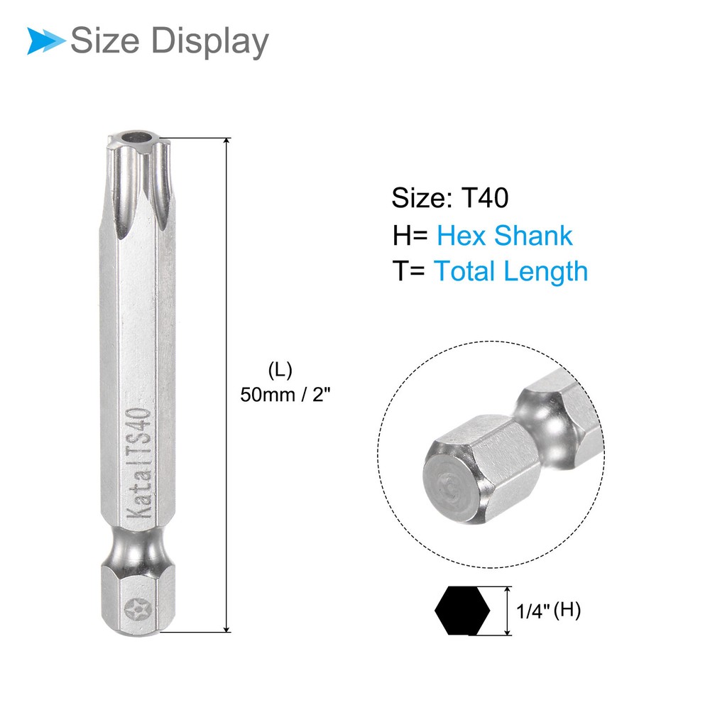 Document Attributes:* Material: S2 Alloy Steel* Size: T40* Hex Shank: 1/4"* Total Length: 50mm / 2"What Is Included:* 5 Pieces x Magnetic Security BitApplications & Features:--- Screwdriver bits set can be used in furniture installation, car maintenance, electronic factory, office installation, kitchen installation, etc.--- The magnetic bit tip can hold the screw securely before installation and after removing the screw to improve efficiency.--- Security bits are made of S2 alloy steel, with good toughness, the surface of the security torx bit set is nickel plating treatment for good anti-rust and wear-resistant and durability, and is suitable for industrial use.Useful Tips:--- Do not turn the screws with mismatched sizes to avoid damage to both the screw and the drill. Magnetic Torx Bits T40 S2 Steel 5 Point Star Screwdriver Bits 5pcs Attributes: * Material: S2 Alloy Steel * Size: T40 * Hex Shank: 1/4" * Total Length: 50mm / 2" What Is Included: * 5 Pieces x Magnetic Security Bit Applications & Features: --- Screwdriver bits set can be used in furniture installation, car maintenance, electronic factory, office installation, kitchen installation, etc. --- The magnetic bit tip can hold the screw securely before installation and after removing the screw to improve efficiency. --- Security bits are made of S2 alloy steel, with good toughness, the surface of the security torx bit set is nickel plating treatment for good anti-rust and wear-resistant and durability, and is suitable for industrial use. Useful Tips: --- Do not turn the screws with mismatched sizes to avoid damage to both the screw and the drill. Hot Item Payment 1.We accept eBay payment . 2.Payment must be received within 7 business days of auction closing. Shipping 1.We ship to your eBay or Paypal address. Please make sure your eBay and Paypal address is correct before you pay. 2.Items will be shipped within 1-3 business day when we received payment. 3.Delivery time depends on destination and other factors. Description Policy Magnetic Torx Bits T40 S2 Steel 5 Point Star Screwdriver Bits 5pcs Attributes: * Material: S2 Alloy Steel * Size: T40 * Hex Shank: 1/4" * Total Length: 50mm / 2" What Is Included: * 5 Pieces x Magnetic Security Bit Applications & Features: --- Screwdriver bits set can be used in furniture installation, car maintenance, electronic factory, office installation, kitchen installation, etc. --- The magnetic bit tip can hold the screw securely before installation and after removing the screw to improve efficiency. --- Security bits are made of S2 alloy steel, with good toughness, the surface of the security torx bit set is nickel plating treatment for good anti-rust and wear-resistant and durability, and is suitable for industrial use. Useful Tips: --- Do not turn the screws with mismatched sizes to avoid damage to both the screw and the drill. Hot Item Payment 1.We accept eBay payment . 2.Payment must be received within 7 business days of auction closing. Shipping 1.We ship to your eBay or Paypal address. Please make sure your eBay and Paypal address is correct before you pay. 2.Items will be shipped within 1-3 business day when we received payment. 3.Delivery time depends on destination and other factors.