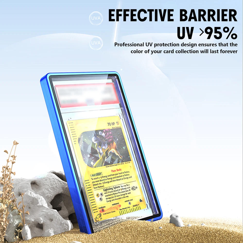 Graded Cards Protector Stackable Magnetic Trading Cards Case for BGS/PSA Slabs Usage and purchasing tips: 1. Please remove the Blue protective film on both sides of the glass before use. Due to the difference between different monitors, the picture may not reflect the actual color of the item. 2. If you want a protector for CGC Slab, please choose the one with PSA specification. 3. For PSA Graded Card Holder: Slab Size Do not exceed 135 x 80 x 7.5 mm(5.31 x 3.15 x 0.30 inches) For BGS Graded Card Holder: Slab Size Do not exceed 131 x 84 x 9 mm(5.16 x 3.31 x 0.35 inches) Superior Protection: The graded card protector features a metal frame and high aluminum glass, offering robust protection against scratches and UV rays to keep your cards in pristine condition. Magnetic Closure and Stackable Design: The magnetic closure securely holds your cards in place, while the stackable design allows for efficient storage and organization of your collection. Versatile Compatibility: This protector meets PSA/BGS/CGC grading standards and is suitable for a wide range of cards, including sports cards (baseball, football, hockey, basketball), and MTG cards, BGS/PSA/CGC cards. Multi-Color Bumper Case: Available in various colors, the bumper case adds an element of personalization while ensuring comprehensive protection for your valuable graded cards. Exceptional Customer Service: We are committed to providing you with the best shopping experience possible. If you have any questions or concerns about our products, compatibility, or anything else, our dedicated customer service team is here to assist you every step of the way. Your satisfaction is our top priority. Product Description: Material:Aluminum,alloy and glass Color: Black/Red/Golden/Sliver/Blue/Green /Purple/Orange Pachage weight: About 74g/2.65oz Product Size:For BGS protector, is about 13.73*8.97*1.19cm(5.4*3.53*0.47inch) For PSA /CGC protector,is about 14.17*8.66*1.05cm(5.58*3.4*0.41inch) Package include: 1x Card Protector Note: 1.Due to manual measurement, there may be slight errors in product size.