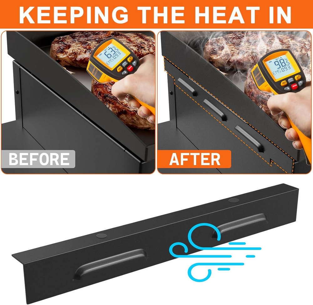 ❀Our Wind Guard Replacement parts for Blackstone 17 inch Griddle; Replacement parts for Blackstone 17 inch griddle model: 1832, 1650, 2142, 1945, 1783, 1814, 1900, 1939, 1933, 1971, 2099, 2143 and more. (Note: E Series is not included) ❀The upgraded wind shield can be securely attached to the windshield on the bottom edge of the griddle with heat-resistant magnets, providing wind protection for the 17 inch blackstone griddle, which matches the 17" blackstone flat top gas grill perfectly. No need to worry about weather changes causing the griddle temperature to drop or the flame to go out. ❀Dimensions: Back guard: 6.3'' x 1.4'' (short), side guard: 13.8'' x 1.4'' (long). Our wind guards made of high quality powder coated steel , they are durable, heat-resistant, oxidation-resistant and rust-resistant. Perfect for 17 inch blackstone griddle 1832, 1650, 2142, 1945, 1933, 1971, 2099, 2143, 1783, 1814, 1900, 1939. ❀You will get 4 wind guards, including 2 long and 2 short; Perfect for blackstone 17 inch griddle. Simply align the powerful magnet on the wind shield to the grill and it will provide efficient wind protection, help shorten the warm-up time, and allow you to enjoy the grill to the fullest. ❀BQMAX specializes in manufacturing outdoor patio supplies, we provide quality products and a hassle-free shopping experience. Fast response within 24 hours, shop now and know for yourself. Product Description Update Wind Guards for Blackstone 17 inch Griddle Update Wind Guards for Blackstone 17 inch Griddle Replacement parts for Blackstone 17 inch griddle model: 1832, 1650, 2142, 1945, 1783, 1814, 1900, 1939, 1933, 1971, 2099, 2143 and more. (Note: E Series is not included) Dimensions: Back guard: 6.3'' x 1.4'' (short), side guard: 13.8'' x 1.4'' (long). Material: Porcelain Steel Easy installation The upgraded wind shield can be securely attached to the windshield on the bottom edge of the griddle with heat-resistant magnets, providing wind protection for the 17 inch blackstone griddle. Made of high quality materials Our wind guards made of high quality powder coated steel , they are durable, heat-resistant, oxidation-resistant and rust-resistant. Perfect for 17 inch blackstone griddle. Comprehensive protection Simply align the powerful magnet on the wind shield to the grill and it will provide efficient wind protection, help shorten the warm-up time, and allow you to enjoy the grill to the fullest. Updating the Grill Perfect matches for 17" blackstone flat top gas grill perfectly. No need to worry about weather changes causing the griddle temperature to drop or the flame to go out. Accessories for Blackstone 17" Griddle Add to Cart Customer Reviews 4.4 out of 5 stars 184 4.1 out of 5 stars 4 4.3 out of 5 stars 27 5.0 out of 5 stars 1 4.5 out of 5 stars 411 4.2 out of 5 stars 140 Price $20.69 $ 20 . 69 — $18.99 $ 18 . 99 — $20.69 $ 20 . 69 $59.49 $ 59 . 49 Dimension 6.3'' x 1.4'', 13.8'' x 1.4'' / / 12 Feet Connect Hose / / Material Porcelain Steel Cast Iron 100% Brass 100% Brass Heavy duty 600D polyester Heavy duty metal Fit for Blackstone 17" Grill ✔ ✔ ✔ ✔ ✔ ✔ Fit for Blackstone 1650 ✔ ✔ ✔ ✔ ✔ ✔ Easy Installation ✔ ✔ ✔ ✔ ✔ ✔