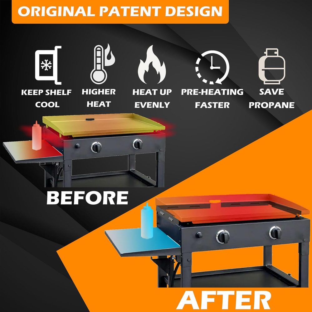 WELL HEAT MANAGEMENT: LimeCare heat shields do a great job on reducing the heat that the side shelves are exposed to. Besides, these wind guards are also good at heating the cooking area more evenly, maintaining flames and shortening pre-heating time on windy/coldy days. Saving propane is another bonus. AMERICAN PATENT: This is ORIGINALLY DESIGNED wind guard, which is different from the old version that hanging on griddle. The biggest advantage is the compatibility with Blackstone grill accessories and griddle itself. Perfetly fit with lid, side table, warming rack, rear grease cup and so on. EASY TO USE: Simply put and remove them on the bottom edges of griddle with build-in strong magnets in minites with no tools or effort. Dark color also makes it look more natually with Blackstone griddle as a whole. PREMIUM QUALITY: Heavy duty of powder coated carbon steels make these Blackstone grilling accessories more heat-resistant, oxidation rersistant, corrosion resistant and rust-proof. They are also easy to clean. It will be a great grilling gifts for men. PERFECTLY FIT: LimeCare wind blocker is compatible with majority of Blackstone 28 inch griddle (Culinary Series and E-Series NOT included): 1554 │1565 │1818 │1820 │1836 │1841 │1863 │1866 │1868 │1899 │1923 │1984 │2006 │2102 │2122 │2149 │2151. Back guard (shorter) : 15.7'' x 1.4'', side guard (longer): 16.9'' x 1.4''. Product Description Black color makes it look more natually with Blackstone griddle as a whole Compatible with Blackstone Griddle Accessories and Parts, such as side sheild, hard cover, hood/lid, rear grease cup, caddy etc Better appearance with Blackstone Griddle as a whole Black color wind guards make it look more natually with Blackstone griddle. They look almost like they were original installed at the factory Key points Color: Black Material: Carbon steel with rust-proof surface Installation Method: Megnetic attachement Installation Position: Bottom edge of side and back of griddle Package included: 2 longer side wind guards and 2 shorter back wind guards Size: 15.7'' x 1.4''(back guard, shorter), 16.9'' x 1.4''( side guard, longer) Left side with side shelf Compitable with side shelf: Side shelf won't be too hot while grilling. Simply attach wind guards to the side bottom after removing side shield. back side with rear grease cup Perfectly match with rear grease cup: Zero contact when you're taking rear grease cup out or putting it back. .