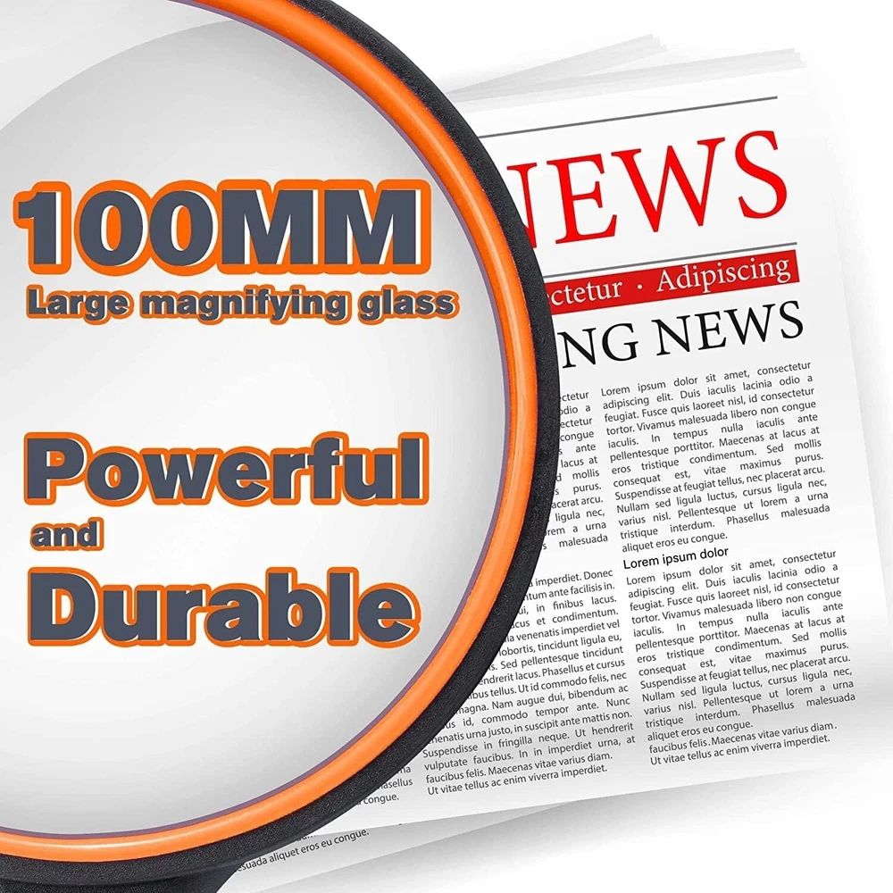 Magnifying Glass 10X Handheld Reading Magnifier with Cleaning Cloth-100MM Large Magnifying Lens with Non-Slip Soft Handle for Seniors Book Newspaper Reading and Kids Nature Hobby Exploration Description: Brings so much fun for kids nature exploration and helps seniors reading the fine prints. Rubbery frame to ensure the glass lens staying perfect. Non slip soft and long rubber handle offers a great reading experience. ENLARGE THE WHOLE WORLD - Brings so much fun for kids nature exploration and helps seniors reading the fine prints.