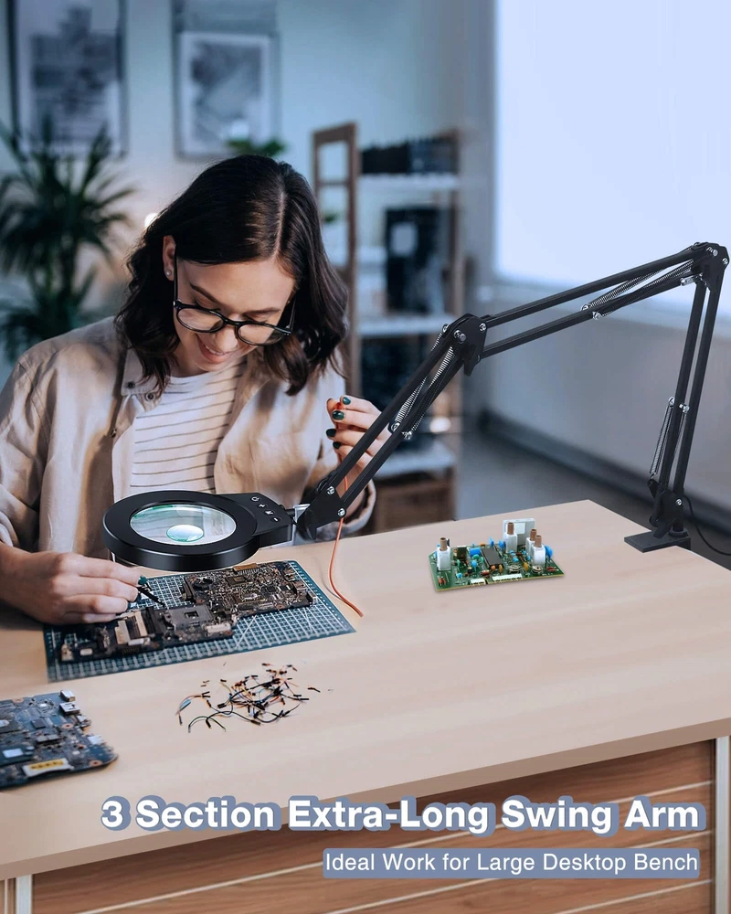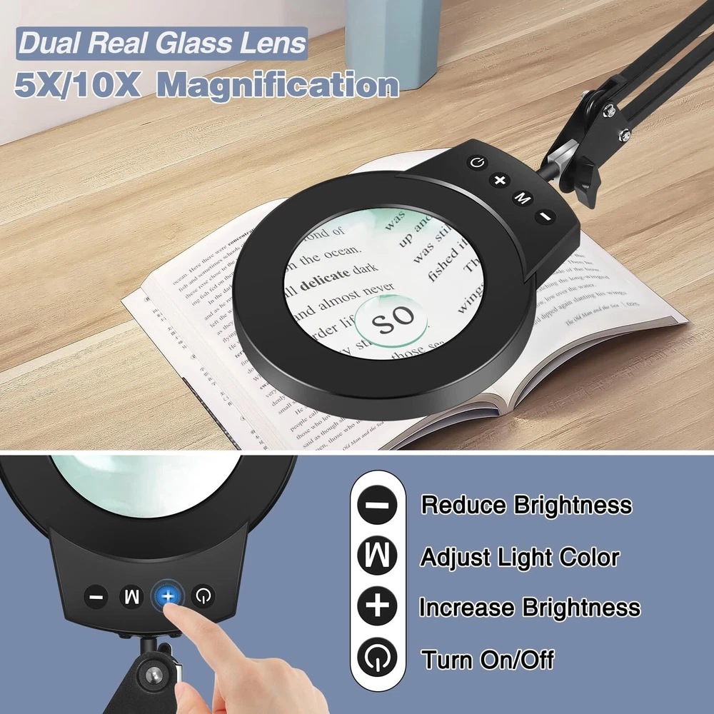 ๐๐น๐ฒ๐ฎ๐ฟ ๐ฉ๐ถ๐ฒ๐ ๐๐ถ๐ด ๐ ๐ฎ๐ด๐ป๐ถ๐ณ๐ถ๐ฒ๐ฟ ๐๐ถ๐๐ต ๐๐ถ๐ด๐ต๐ ๐ฎ๐ป๐ฑ ๐ฆ๐๐ฎ๐ป๐ฑ: 10X&5X magnification real glass lens is a game-changer for enthusiasts in crafting, offering crystal-clear, distortion-free views to capture even the small details, enhancing accuracy and satisfaction in every DIY project 50 ๐๐ฟ๐ถ๐ด๐ต๐ ๐๐ถ๐บ๐บ๐ฎ๐ฏ๐น๐ฒ ๐๐ถ๐ด๐ต๐ ๐๐ถ๐๐ต ๐ ๐ฎ๐ด๐ป๐ถ๐ณ๐ถ๐ฒ๐ฟ: with 4 convenient head touch-countrol buttons to effortlessly control 5 color modes+stepless dimming +lighting memory function. Offering superior convenience over traditional wire-controlled adjustments. 108 upgraded light beads are 30% brighter than other ordinary desk mount magnifying lamps, ensuring the perfect illumination for any environment or your task ๐ข๐๐ฒ๐ฟ๐ต๐ฒ๐ฎ๐ฑ ๐๐ถ๐ด๐ต๐ฒ๐ฟ ๐ ๐ฎ๐ด๐ป๐ถ๐ณ๐ถ๐ฒ๐ฟ ๐๐ฎ๐บ๐ฝ ๐ณ๐ผ๐ฟ ๐๐ฎ๐ฟ๐ด๐ฒ ๐ช๐ผ๐ฟ๐ธ๐๐ฝ๐ฎ๐ฐ๐ฒ :Featuring a 3-section extra-long swing arm, task light lamp offers flexible adjustment allows you to zoom in on deep details without moving whole lamps.you also can use it as a desk lamp for home office or fill light for your video because long flexible arms Hands Free ๐ฆ๐ฎ๐๐ฒ ๐ฌ๐ผ๐๐ฟ ๐ฆ๐ฝ๐ฎ๐ฐ๐ฒ ๐๐น๐ฎ๐บ๐ฝ: newly magnifier light clamp is capable of horizontal, vertical, side clamping, and handstand clamping. It will firmly secure the light stand to any type of workbench. Can swing it around out of the workdesk, but when you need more light and detail, swing it back out; no need to occupy your extra tabletop or bench space ๐ข๐ฝ๐๐ถ๐บ๐ถ๐๐ฒ๐ฑ ๐๐น๐น๐๐บ๐ถ๐ป๐ฎ๐๐ถ๐ผ๐ป ๐๐ผ๐ฏ๐ฏ๐ ๐๐ฒ๐๐ธ ๐๐ฎ๐บ๐ฝ : Tailor-made for a wide range of precision tasks, our standing lighted magnifier excels in crafting, reading, sewing, jewelry making, electronics repair, puzzle,educational projects, beauty treatments, and collectible examination, enhancing your focus and accuracy. Simple installation by check the list video ๐๐๐ฒ-๐๐ฟ๐ถ๐ฒ๐ป๐ฑ๐น๐ ๐๐ถ๐ด๐ต๐๐ฒ๐ฑ ๐ ๐ฎ๐ด๐ป๐ถ๐ณ๐ถ๐ฒ๐ฟ ๐ช๐ผ๐ฟ๐ธ ๐๐ฎ๐บ๐ฝ: Emulate the benefits of natural sunlight with multiple color modes, ensuring your eyes are protected during prolonged periods of concentration. This thoughtful design reduces glare and strain, making for a more enjoyable crafting, reading, or repair experience