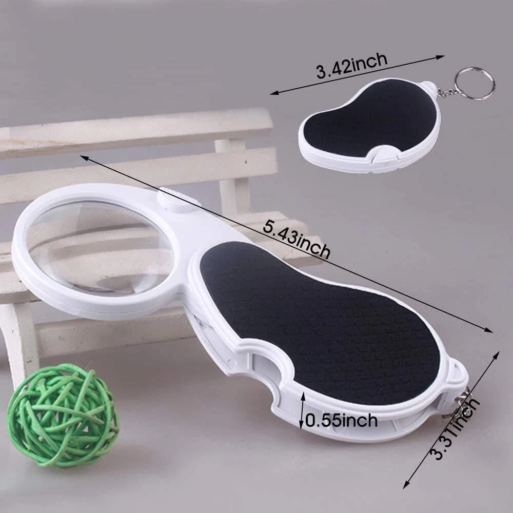 【Pocket Magnifier Folding Design】 the magnifying glass for reading is mini size with keychain,can be put into the wallet, shirt and pants pocket,etc 【Loose Reading】 the 5X magnifying lens is perfect for student field survey, jewelry identification, office, printing and manufacturing, elderly reading, antique appreciation 【High Definition Optical Lens】 the 5X lens of our pocket magnifying glass with light has high transparency and small dispersion coefficient, and the image clarity is good in the entire field of view, and the enlarged edge is clear. Our pocket magnifying glass protects your vision double-layer lenses, does not hurt the eyes 【Auto Flip LED Light】 Light AUTO turns on when flipped open to 150°~ 180. Two CR1620 batteries power included can last for many hours 【Non-slip Handle】 black leather handle, rough anti-slip design, neat and beautiful pocket magnifying glass with light.