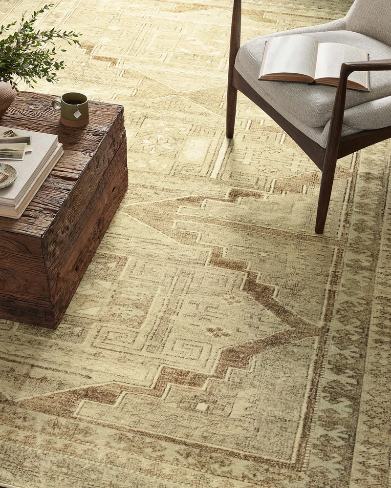 The Sinclair Collection for Magnolia Home by Joanna Gaines x is power-loomed of polyester, including 58% Global Recycling Standard (GRS) certified recycled polyester (made from recycled plastic bottles), certified by Control Union 1171944. Sinclair area rugs have incredible softness and durability comparable to classic power-loomed rugs, while also reducing waste in their production. This collection is also machine-washable, making it an ideal rug in high-traffic living rooms, hallways, entryways, and children’s rooms. The design features antique motifs with intricate details and slight distressing, creating a sophisticated, storied feel. The Sinclair Collection is a machine-washable area rug that’s power-loomed from recycled plastic into soft, durable polyester with a thicker pile than most washable rugs. How to wash: Any rug size 5' x 7'6"" or smaller, including all runners, can fit into a home washing machine that’s 3.4 cubic feet or bigger; The 7'6"" x 9'6"" rug requires a washing machine at least 4.8 cubic feet; The 8'6'' x 11'6"" size requires a commercial washing machine with at least an 80-lb. capacity; Wash in cold water, delicate cycle, with mild detergent, and no bleach; hang or lay flat to dry. The color of the rug is influenced by your environment, lighting, and time of day; ordering an 18"" x 18"" sample is recommended for color reference. The design features antique motifs with intricate details and slight distressing for a sophisticated feel. Magnolia Home by Joanna Gaines x is a rug and pillow collaboration between the celebrated Magnolia co-founder and the award-winning, family-owned textile company.