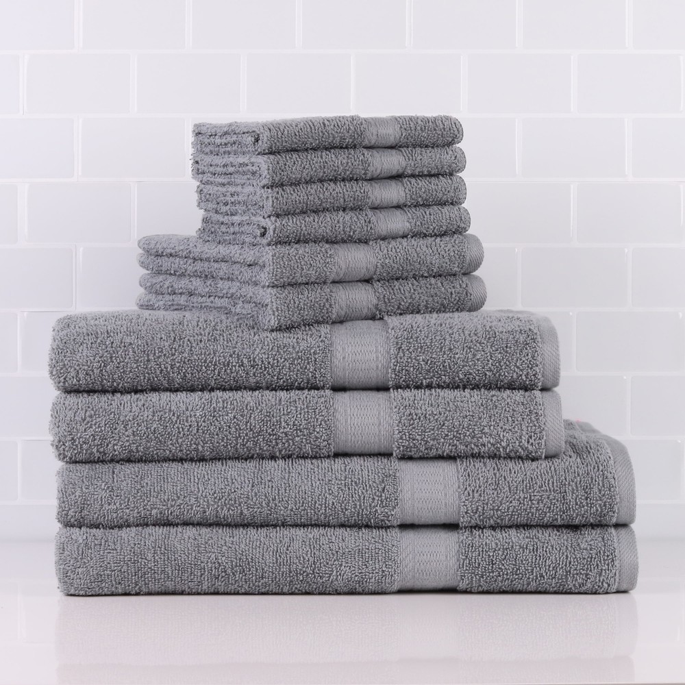 Refresh your linen closet with the durable yet incredibly soft and absorbent Mainstays Basic Solid 10-piece bath set. Crafted using quality yarns these linens are easy care machine washable and ideal for everyday use. The Mainstays Basic Solid 10-piece bath sets are 100% cotton and are available in several colors. Each set is Oeko-Tex Standard 100 Certified and comes with (2) 30 in. by 60 in. bath sheets, (2) 27 in. by 52 in. bath towels, (2) 16 in. by 26 in. hand towels, and (4) 12 in. by 12 in. washcloths. Complete your collection with a coordinating stripe bath towel or mix and match your colors to create a different atmosphere and color pallet in your bathroom. Whichever look you prefer, the Mainstays Basic Solid 10-piece bath set is sure to please. Mainstays Basic Solid 10-Piece Bath Set, Grey Machine Washable Oeko-Tex Standard 100 Certified Ultra soft and absorbent Fits any bathroom decor with a several mix and match colors to choose from. 100% Cotton Bath Towel Measures: 52 in. by 27 in. Bath Sheet Measures: 30 in. by 60 in. Hand Towel Measures: 16 in. by 26 in. Wash Cloth Measures: 12 in. by 12 in. For best use, wash separately before first use. Perfect for Hair/Pool/Gym Multipurpose Quick Drying Light and Soft Towels