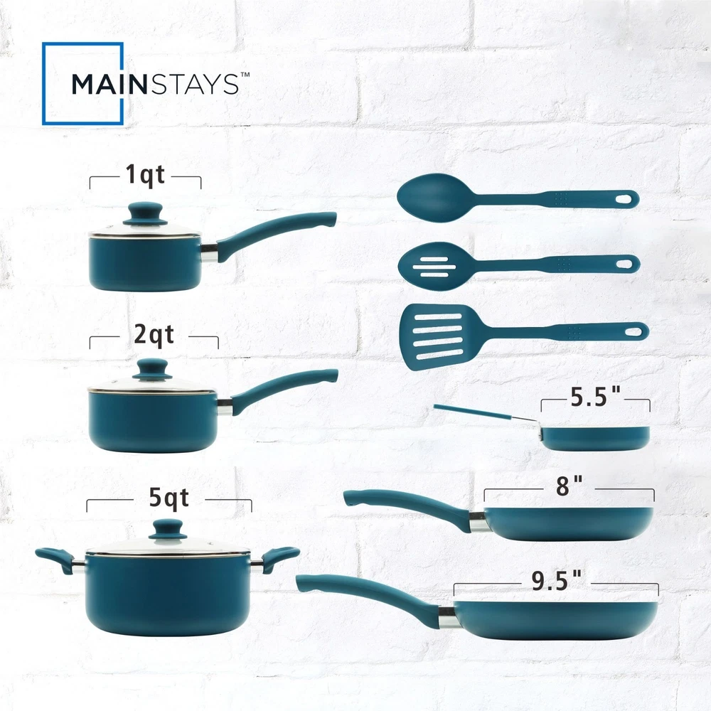 Product details Ideal for everyday use at home, this Mainstays ceramic 12 pieces set corsair includes pans and kitchen utensils that can fulfill your everyday cooking needs at home. It is also ideal as a considerate and valuable gift to your close friends and family. The interior is coated with 2 layers of PPG Customized ceramic coating, which makes cooking and clean-up easy. The pans heat quickly and evenly due to the aluminum body, so this set will help you save time cooking as well. Cool, soft-touch handles provide a comfortable grip., while the outside color of this set will offer a bright pop of color to your kitchen. Mainstays Classic Collection 12 Piece Nonstick Aluminum Alloy Cookware Set, Blue Aluminum body for fast and even heating Riveted handles for a strong connection Suitable for all cooktops except induction Nonstick ceramic coating for easy cooking and cleanup Includes essential pans and kitchen utensils for versatile cooking