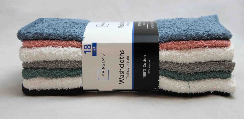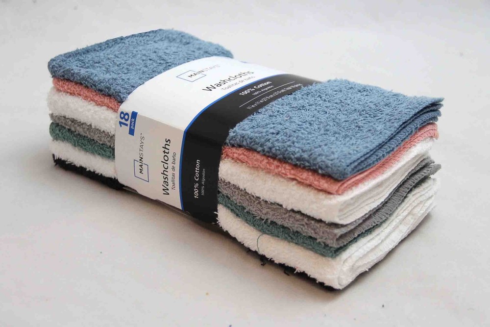 Enhance your daily routine with the Mainstays 18-Pack Washcloths in Multi Colors . Made from soft cotton, these washcloths are gentle on your skin and clean well. The white color fits any bathroom style. Use them for washing your face, body, or around the house. They’re also great for travel, gym bags, or guest bathrooms. These washcloths stay soft and absorbent after many washes. The over edges stitches edges help prevent fraying . They’re machine washable. Whether you need extra washcloths at home or a simple gift, the Mainstays 18-Pack Washcloths in Multi Colors offer great value and durability. 100% cotton Ring Spun, Absorbent, Machine wash warm, tumble dry low. Wash before use, Color: Blue, Do not bleach or iron. Washcloths are available in an 18-pack count. For all age Group
