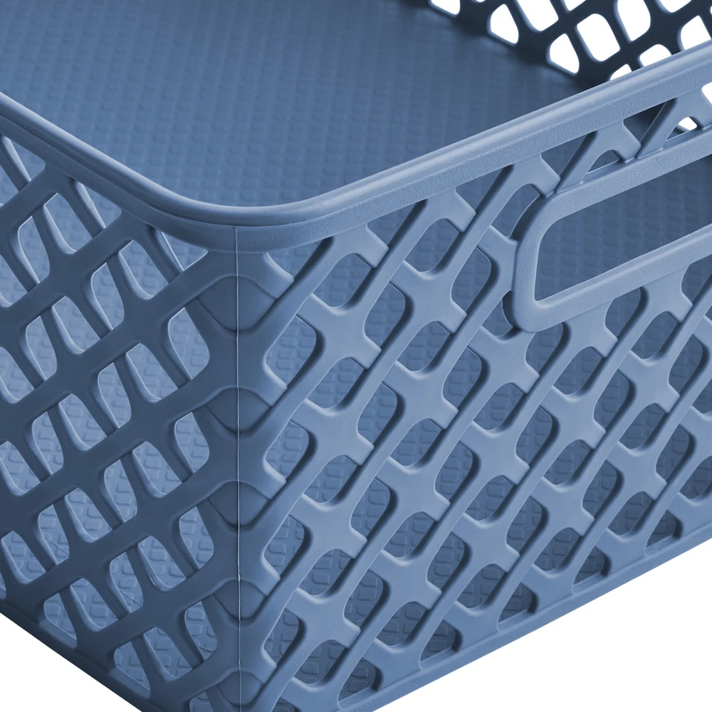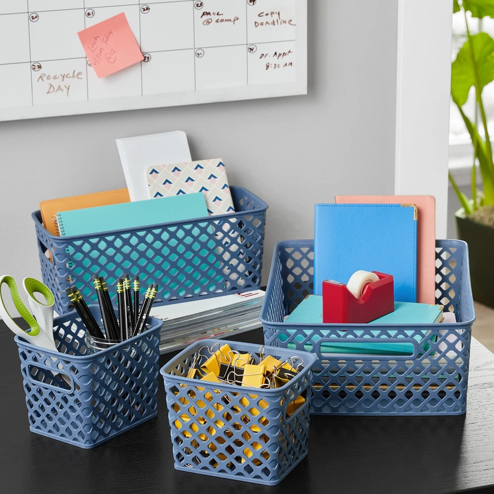 This Mainstays 4-Piece Moonlight Blue Decorative Trash Can Set fits in anywhere and provides plenty of space and storage for the items you need to keep on hand without taking up too much room. Perfect for the bedroom, kitchen, or closet. These baskets provide seamless storage that will make your house or apartment feel more organized. Convenient storage bins that are durable and will last you years of use. From toy storage in a child's bedroom to tool storage in the garage, and everything in between, you can easily organize your space with these baskets. You can use this portable storage basket to store as many items as you want. Set includes: (1) Medium Decorative - 14 x 11.6 x 5.3 inches; (1) Long Decorative - 13.6 x 5.5 x 5.1 inches; (2) Mini Medium Decorative Baskets 6.7 x 5.5 x 5.1 inches Features two cut-away handles for easy transport of stored items. Can be used individually or together for maximum versatility. The mesh design allows light and air to pass through, helping to inhibit mold growth. Even on a high shelf, it lets you see what's stored. Easy care, just wipe clean with warm water and mild detergent as needed. Set of 4 Medium basket dimensions: 14 x 11.6 x 5.3 inches Narrow basket dimensions: 13.6 x 5.5 x 5.1 inches Mini basket dimensions: 6.7 x 5.5 x 5.1 inches Color: Moonlight Blue