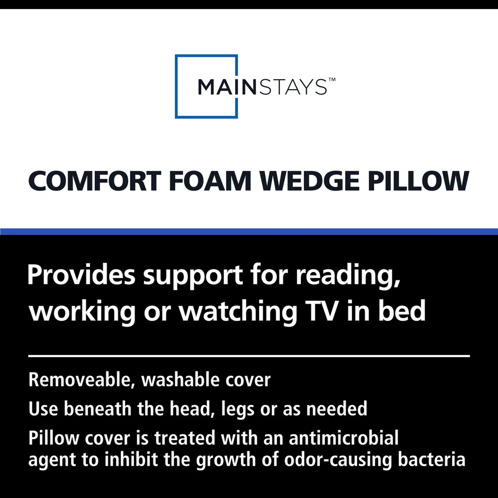 The Comfort Foam Wedge Pillow provides support for reading, working or watching TV in bed. Made with premium high-density support foam, the Comfort Foam Wedge Pillow is the perfect combination of comfort and support. This multi-position wedge pillow helps support an adult upright posture while relieving pressure on the upper back muscles. Sleeping at an angle helps drain fluid from the sinuses and open up the airways. This helps relieve chest congestion so you can breathe easier. It's ideal for elevating your legs to improve circulation. Pillow is Hypoallergenic Made with Premium High-Density Support Foam Ergonomic shape and customizable support to suit your needs Sit upright, reclined or elevated The antimicrobial treated white pillowcase is also removable and machine washable Sit upright while reading or watching TV Lying at an angle helps breathe easier and reduces acid reflux and snoring. Elevating your legs helps improve circulation