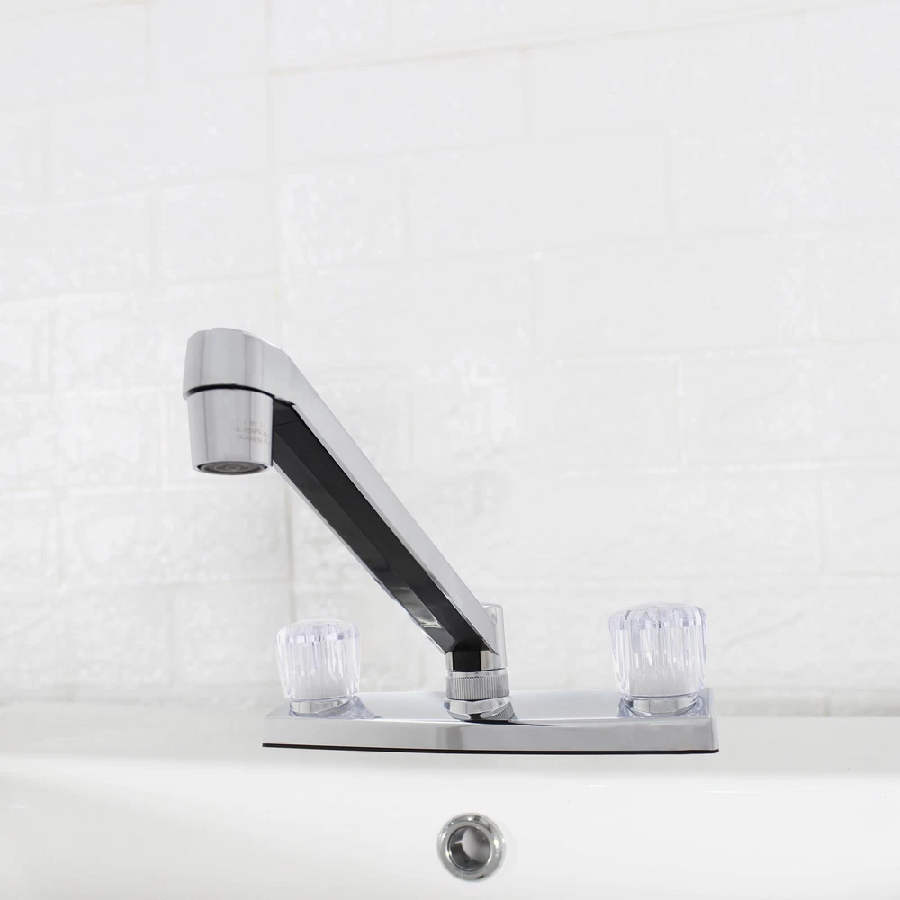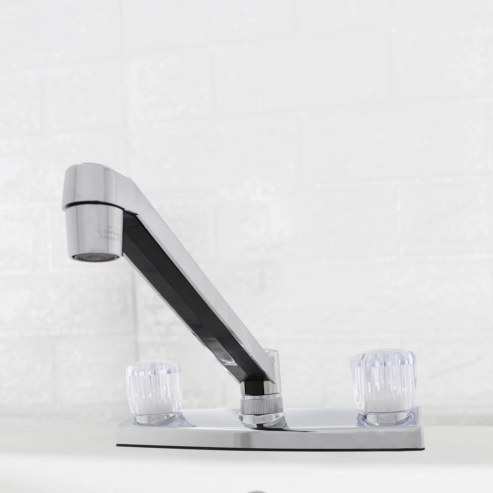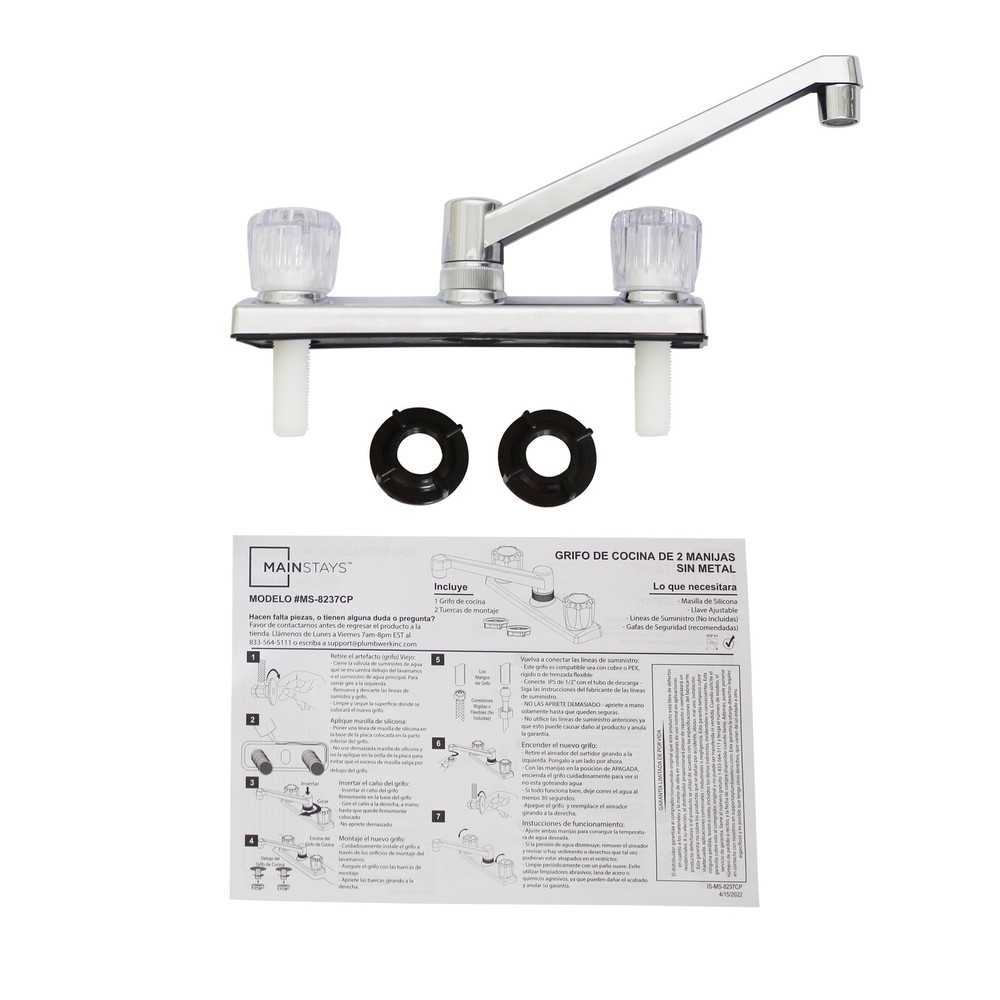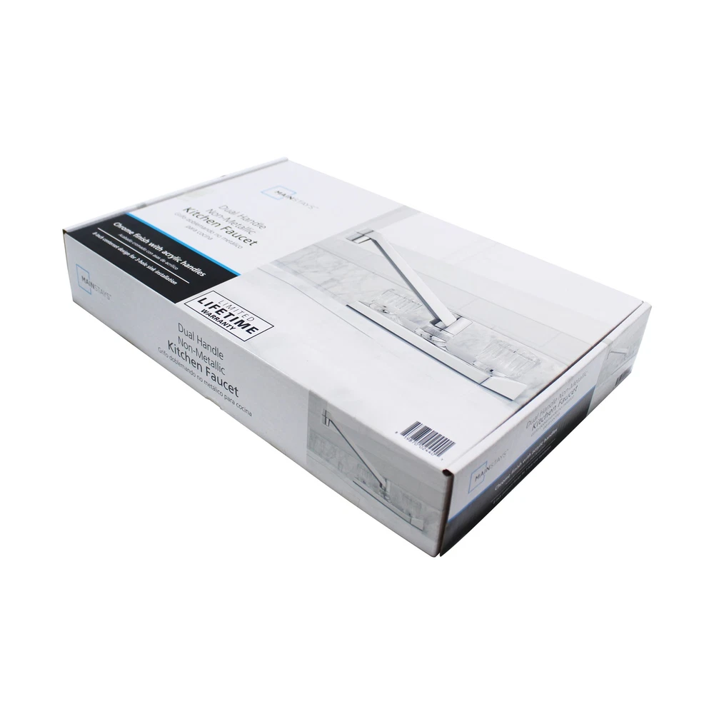 This Mainstays Non Metallic Double Acrylic Handle Kitchen Faucet with Chrome Finish is a simple way to add style to your kitchen. This faucet is made with beautiful acrylic handles, making it easy to fit any kitchen aesthetic. This faucet is designed to be installed in a 3-hole (4-inch centerset) kitchen sink. This faucet is covered by a Limited Lifetime Warranty. Clean periodically, but avoid use of abrasives cleaners, steel wool, or harsh chemicals. Mainstays Non Metallic Double Acrylic Handle Kitchen Faucet Handles: Double acrylic handles Holes for Installation:1 or 3 hole 4-inch installation Kitchen faucet High spout Flow rate (GPM): 1.80 Cartridge Type: Washerless Cartridge Complies with NSF SKU: MS-8237CP