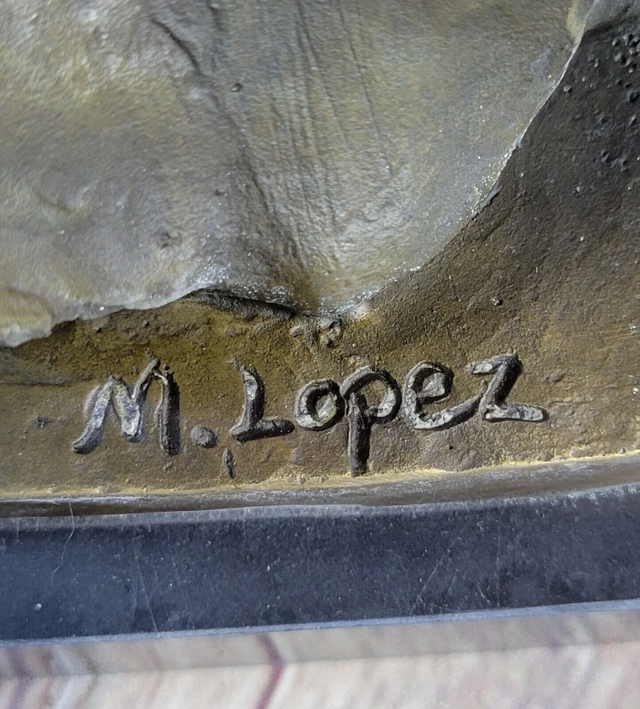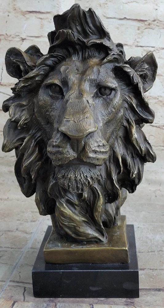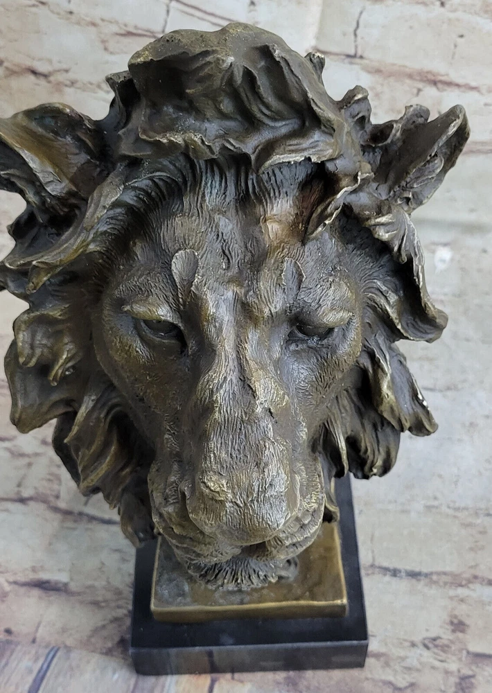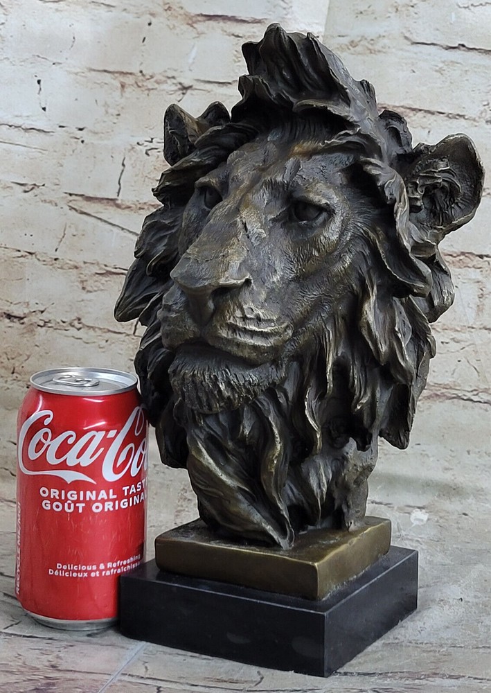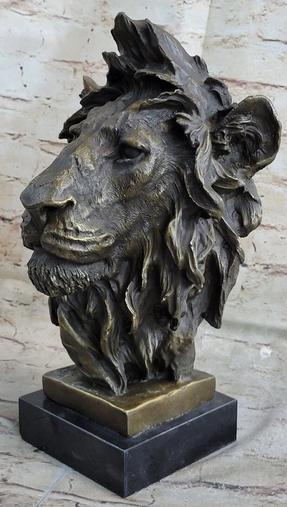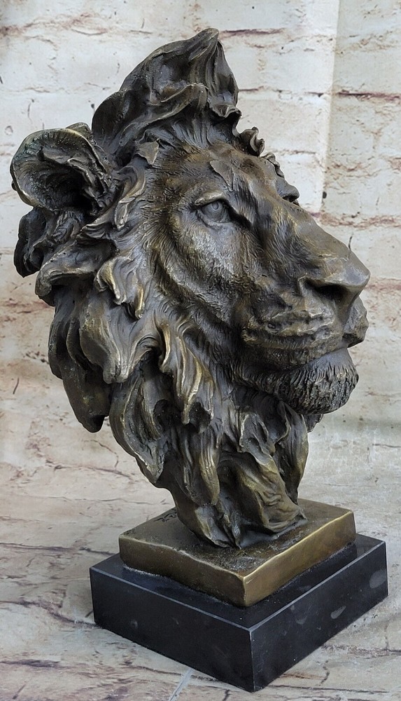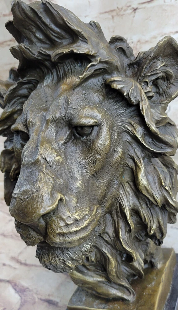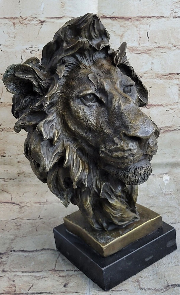 Large African Male Lion Bust Bronze Marble Sculpture Statue Decor Figure Gift NR Large African Male Lion Bust Bronze Marble Sculpture Statue Decor Figure Gift NR Condition : This sculpture is in perfect condition. Bronze Dimensions with Marble Base: Height 12" X Width 7" Marble Dimensions:6" X 5" Height without base:11" Weight:15 LBS Inventory:18FDW0418481 Prepare to be captivated by the mesmerizing presence of this stunning Lion Bust Sculpture. With its piercing eyes and commanding expression, this bronze masterpiece exudes an air of intimidation and regal authority. Expertly handcrafted, the sculpture skillfully captures the majestic essence of the lion, the noble lord of the jungle and savannah. The lion's proud face emerges from the twists of deadwood that form its base, creating a captivating contrast between strength and nature. Its unmovable stance and striking gaze leave a lasting impression, evoking a sense of awe and respect. Cast using the ancient "Lost Wax Method," this bronze sculpture showcases meticulous craftsmanship and attention to detail. Mounted on a sleek black marble base, this extraordinary sculpture features a two-tone brown patina, enhancing its timeless beauty and adding depth to its lifelike appearance. The sculpture bears the signature of renowned artist Miguel Lopez, a testament to its authenticity and artistic value. Invite the power and magnificence of the lion into your space with this remarkable bronze sculpture, a true masterpiece that will command attention and admiration. Art Deco African Lion Bust Wildlife Bronze Sculpture Statue Home Decoration Sale Video will open in a new window Using the eBay App? Paste link into a browser window: [isdntekvideo] Shipping Terms : Most of our items are shipped via USPS (United States Postal Service) mail or UPS. Most orders are shipped within 24-48 hours of purchase. Please be aware that not all items are available for USPS shipping due to size and weight. We do ship to Hawaii, Alaska, Canada, Puerto Rico, APO/AE, and U.S. Virgin Islands, however, an additional charge may be required. Please contact us before making any purchases in these areas. For Non-USA customers, you may be responsible for all duty, tax, brokerage fees that may be due upon delivery (shipping costs cover freight charges only). We also ship internationally. Please refer to the "Shipping and Handling" chart for the rates for each area. Payment : We accept just about any form of payment. PayPal, Master Card, Visa or American Express credit cards. Money orders, cashiers checks, and even personal or business checks. For governmental institutions, we will also accept a purchase order. Please understand that for personal or business checks we have to wait for the check to clear (usually 7 days) before shipping. Condition : New Detailed Hand Crafted Hot Cast Bronze Satisfaction Guaranteed. This is Stock Photo, Slight Color Variation!! Listing and template services provided by inkFrog