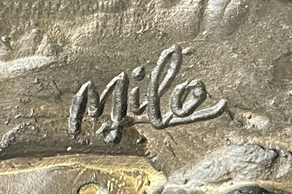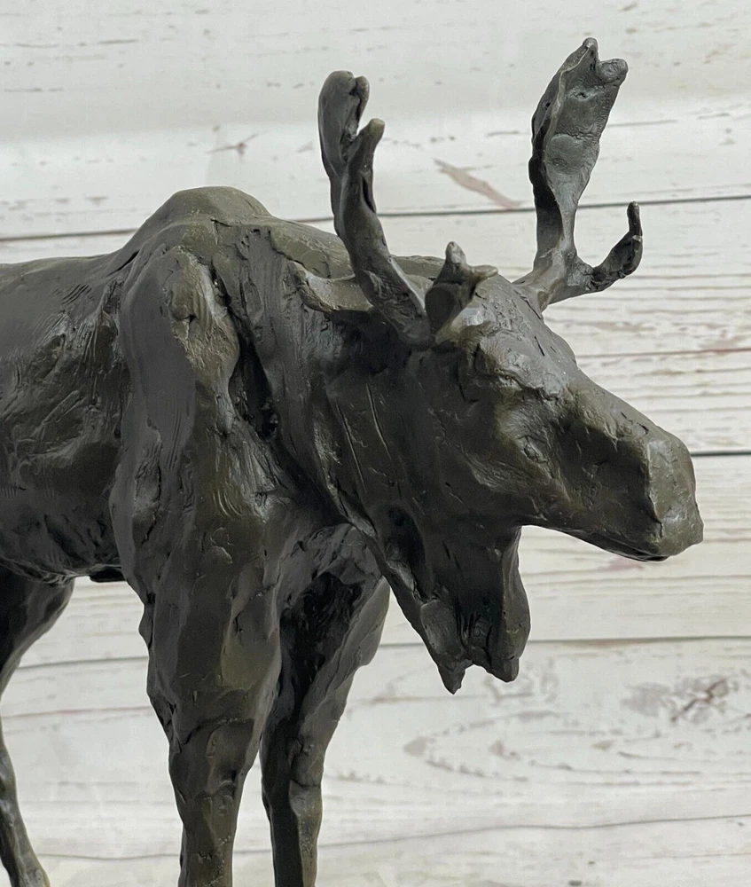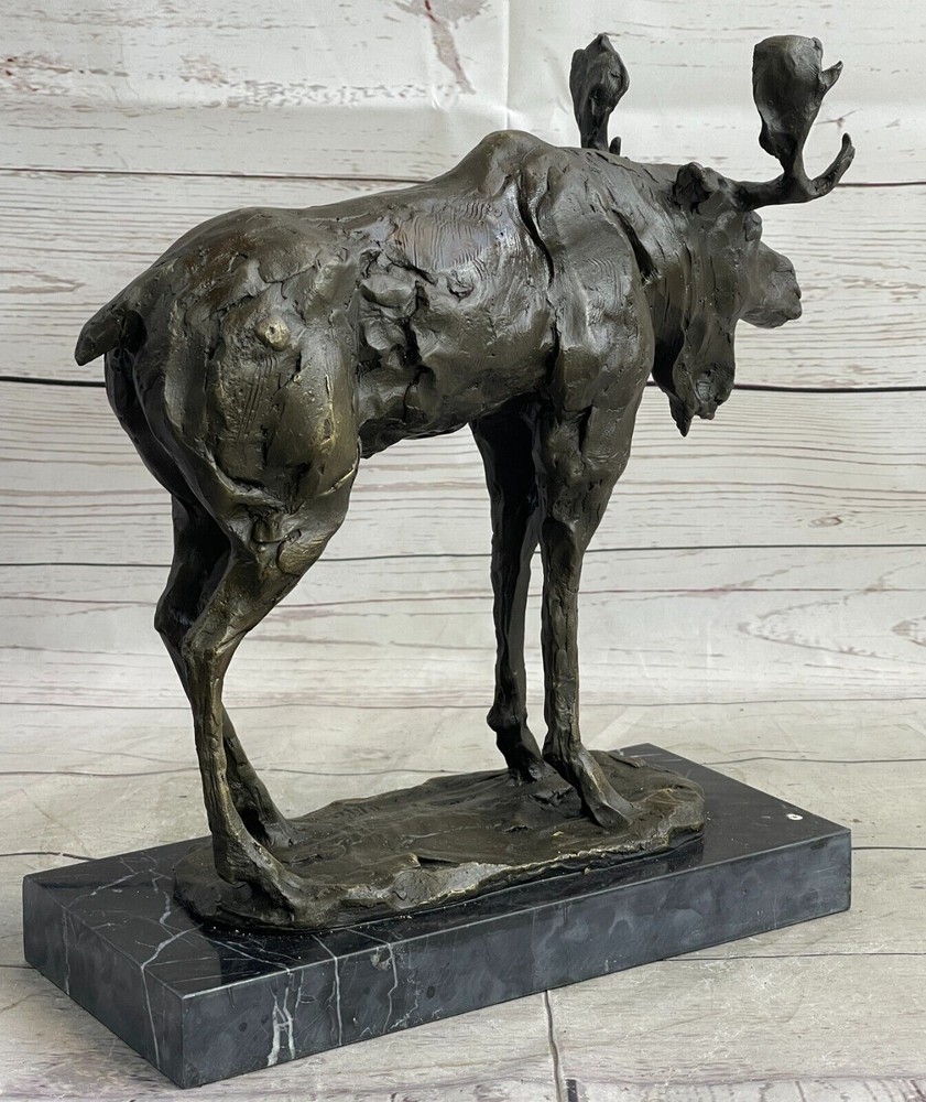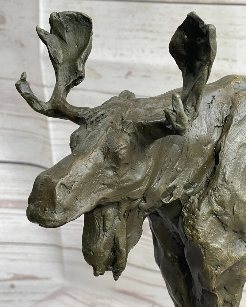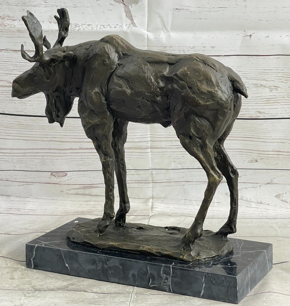 Condition : Thisnbsp;sculpture is in perfect condition. Bronze Dimensions with Marble Base: Height 12" X Width 12" Marble Dimensions:10" X 5" Height without base:11" Weight:15 LBS Inventory:54K1666037 Behold the captivating portrayal of the wilderness in the form of a bronze sculpture titled "Majestic Moose." This remarkable piece captures the essence of a male moose in its natural habitat, standing still and vigilant as it surveys its surroundings for signs of predators, sustenance, and perhaps a potential mate. With intricate attention to detail, this sculpture depicts the impressive stature of the moose, which stands as the largest species within the deer family. The moose, known as the North American moose or the Eurasian elk in Europe, is characterized by the distinctive palmate antlers of its males. Solitary by nature, these majestic creatures briefly break their solitude during the mating season, which occurs in September and October. The sculpture elegantly captures the moment of stillness in the deep forest, where the bull moose stands with an aura of majesty, breaking the silence with its resonant grunts that can carry for up to 500 meters. This artwork pays homage to the cultural significance of the moose in Native American lore, symbolizing attributes such as headstrong determination, unstoppable resilience, longevity, and integrity. The abstract and unrefined texture of the sculpture's surface adds a tactile dimension to the artwork, enhancing its visual impact and evoking a sense of connection with the natural world. Crafted using the timeless lost-wax casting method, the bull moose sculpture features a rich brown patina finish that further accentuates its lifelike appearance. Resting upon a black marble base and bearing the signature of the esteemed artist Milo, this sculpture is a tribute to the wilderness and the enduring spirit of the majestic moose. Handmade Bronze Sculpture Statue Moose Musuem Quality Masterpiece Figurine www.bronzhaus.com Video will open in a new window Using the eBay App? Paste link into a browser window: [isdntekvideo]