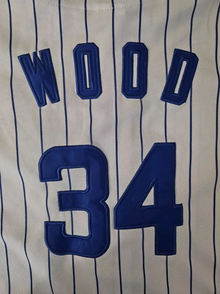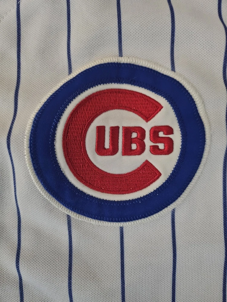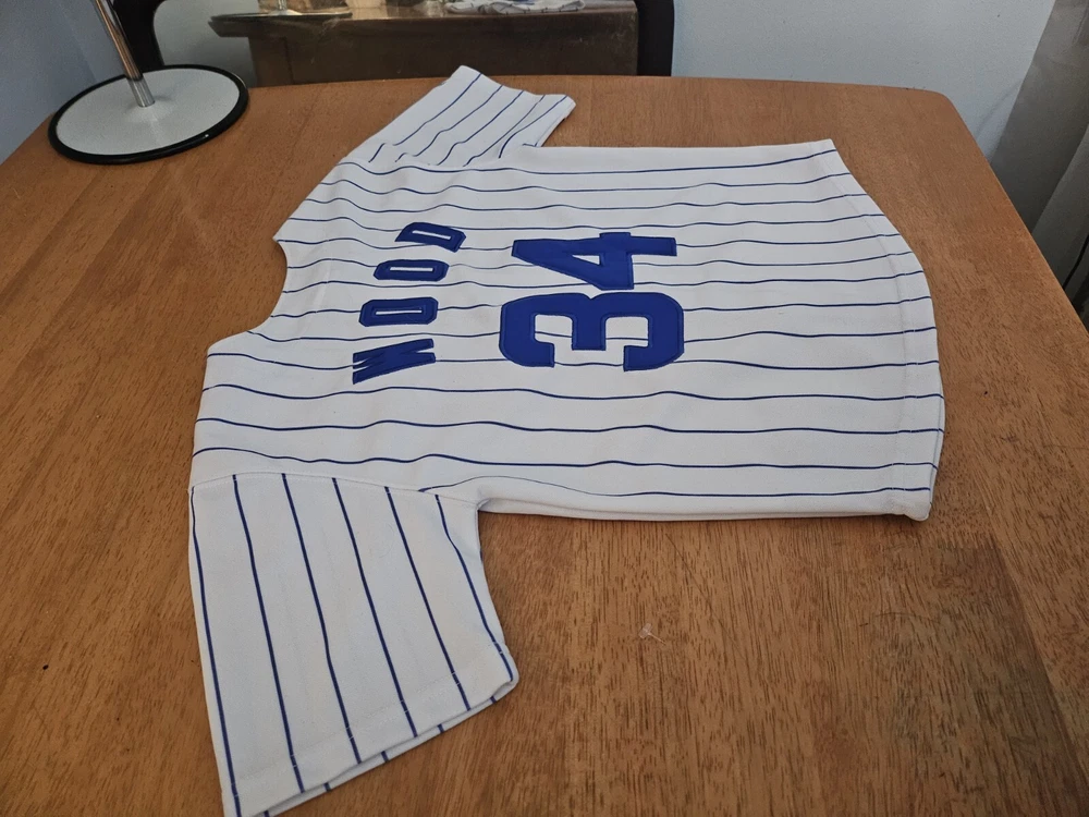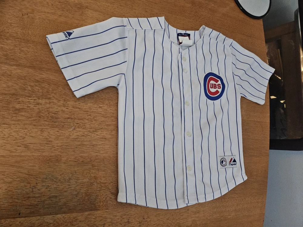 Show your support for the Chicago Cubs with this officially licensed Majestic jersey featuring Kerry Wood's #34. Made for boys in size small, this white jersey is perfect for fans of the Major League Baseball team. The jersey is embroidered with the team's pinstripe design and is perfect for wearing to games or for everyday wear. Don't miss out on the chance to own this piece of fan apparel!