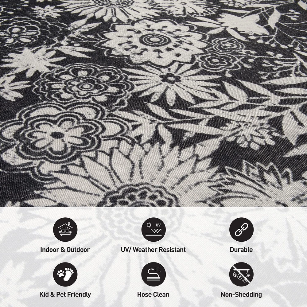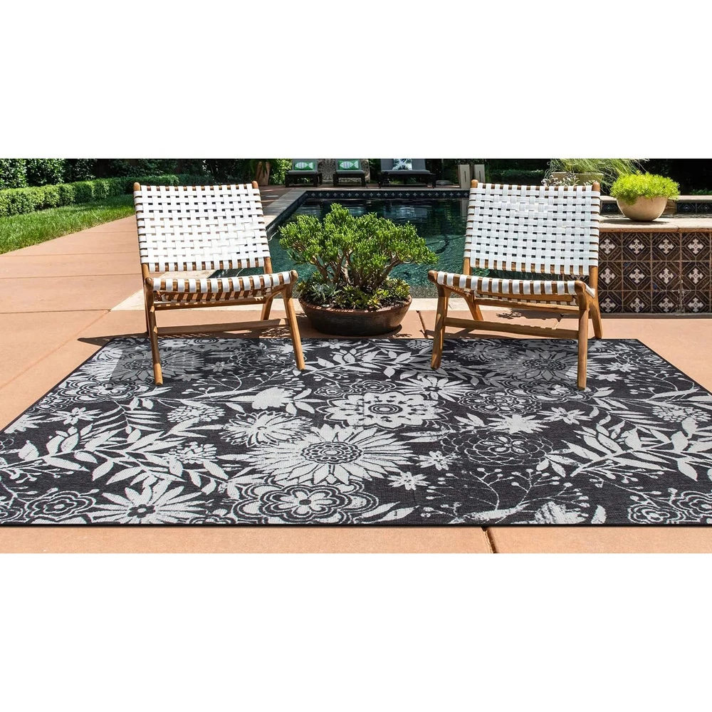 Experience the comfort, durability and versatility of this flatwoven rug inside or outside of your home.This rug is Machine made in Egypt, by using 100% nylon. The floral tropical palm pattern add visual glare to any space. Machine made, 100% Nylon pile for long lasting quality.Durable Indoor/outdoor rug. Low profile flat weave weather resistant construction. Stain Resistant, fade Resistant and no shedding,easy to clean and maintain.Available in a variety of area rug sizes: area rugs 8x10, area rugs 5x7, runner rugs 2x7. Indoor/Outdoor rugs designed with resilience against everyday wear-and-tear, this rug is kid and pet friendly and perfect for high traffic areas of your home such as patio, deck, backyard,balcony,screened-in porch, living room, dining room, bedroom, entryway,office, nursery, kid's room, playroom, dorm room, study, or home office. Easy Care: These stain resistant rugs are easy to maintain. When spills and accidents occur, blot the stains, rinse with a hose, sweep or use a leaf blower to remove dirt. Please Note: The digital images and product dimensions are as accurate as possible. Due to differences in computer monitors, some rug colors may vary slightly. Lengths and widths may vary from the published dimensions. We do our best to provide you with an exact measurement, but please be advised that some variation exists. Patterns may vary slightly according to shape and size selected.