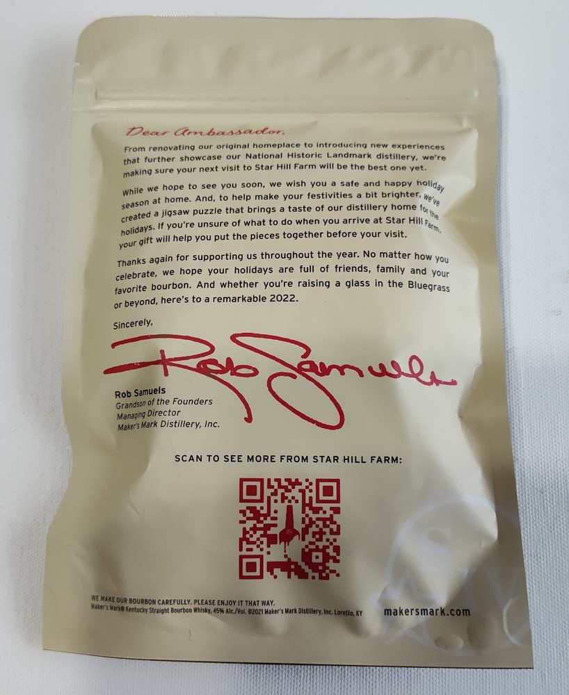This Makers Mark 2021 Ambassador's Christmas Gift is a must-have for any Bourbon Whiskey fan. The multi-color puzzle features a unique design showcasing the distillery's theme, making it a perfect addition to any collection. It is an original piece of advertising merchandise and created in 2021, making it a great gift for any occasion. The puzzle is made by Maker's Mark and is not modified in any way.