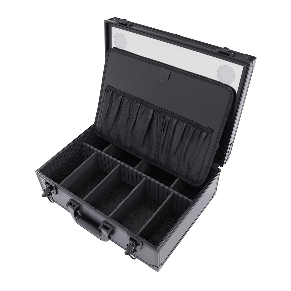 Makeup Bag with Mirror LED Light Travel Makeup Case Cosmetic Box Organizer Black Large Makeup Train Case Jewelry Box Cosmetic Artist Organizer w/ Light & Mirror Description As a qualified professional makeup case maker, we not only consider its beauty but also a lot of details for consumers. We go out to do makeup without a mirror and the cosmetics are not convenient to carry, so we designed a product that integrates makeup storage and an intelligent makeup mirror. Come check our products out! Key Features High-quality Materials: This product is made of high-quality PVC and aluminum alloy, which is strong, durable, and not easy to deform. The PVC material is fireproof . Beautiful Appearance: The black color, as well as the classic design, makes it look beautiful. Adjustable Color and Brightness: You can adjust the cold light, warm light, and natural light as well as the infinite brightness through the touch screen switch on the mirror to meet your preferences and needs. Large Storage Space: The size of this product is 16.5*11.8*5.9inch and it comes with adjustable dividers, allowing you to customize the layout to place your makeup essentials. Meanwhile, the compartment bag can hold a lot of cosmetic brushes, eyeliners, eyebrow pencils, etc. High Safety: The built-in charge protection system automatically limits current when fully charged, so you don't have to worry about overcharging. You can also use the light while charging it. Long Endurance: The battery has a capacity of 2000mAh and can last for 3-5 hours on a full charge, making this product suitable for outdoor use without frequent charging. Strong Load-bearing Capacity: The thickened materials and rectangular structure make it have a strong load-bearing capacity of 7kg/15lbs, so you can feel free to put most of your cosmetics on your business trip or travel. Convenient to Carry: The size of this product is 16.5*11.8*5.9inch and it only weighs 3kg/6.6lbs, so it's lightweight and compact. Meanwhile, the top handle makes it easy for you to carry. A Good Gift: The beautiful appearance and good practicality make it a good gift for professional makeup artists, beauty masters, and traveler lovers. Easy to Clean: The surface of this product is smooth and flat, which is easy to clean. You just need to wipe it with a wet rag. Guaranteed Customer Service: We aim to provide quality products and services. If you have problems, please feel free to contact us. We will reply and solve the problem for you as soon as possible. Details USB Slot: It comes with a USB slot, so you can charge it using a charger and mobile power supply. It's perfect for makeup artists to use outdoors. LED Light: The 6 LED lights on the mirror can enhance the view and make your makeup clearer. Meanwhile, LED light can save you a lot of electricity. The soft light transition technique makes the lighting very uniform. Indicator Light: The indicator light turns red when the product is charging and turns green when being fully charged, allowing you to better observe the condition of the product. Detachable Partition: You can adjust the position of the partition according to the volume and shape of the cosmetics, keeping the cosmetics in order at all times. Application It is suitable for storing cosmetics, jewelry, electronic accessories, essential oil, toiletries, shaving kit, and valuable objects in homes, hotels, beauty salons, etc. The Led lights can be applied in low-light environments. Specification Color: Black Material: PVC, Aluminum Alloy Shape: Rectangular Style: Modern Numbers of Compartments: 9 Load-bearing Capacity: 7kg/15lbs Type: Portable Light Source: LED Light Number of LED Lights: 6 Fully Charged Time: 3-5h Light Colors: Cold Light, Warm Light, Natural Light Power Type: Plug-in, Built-in Lithium Battery, Mobile Power Supply Battery Capacity: 2000mAh Color Temperature: 3500K. 4600K, 6500K Brightness: Infinitely Adjustable Operate Mode: Touchscreen Net Weight: 3kg/6.6lbs Gross Weight: 3.2kg/7.05lbs Package Size: 40.6*31.8*20cm/15.9*12.5*7.8inch Product Size: 42*30*15cm/16.5*11.8*5.9inch Mirror Size: 39*27cm/15.4*10.6inch Package Included 1* Makeup Case 1* Compartment Bag 1* Power Cord Notes Please allow the slight color difference caused by the shooting light and 1-3cm error due to manual measurement, and make sure you do not mind before ordering. Payment Delivery details Terms of sales About us Contact us Payment We accept ebay payment 。 Fees such as import duties, taxes are not included in the item price or shipping costs. These charges are the buyer's responsibility. Delivery details Shipping: 2-9 working days to: USA Terms of sales We maintain high standards of excellence and strive for hundred percent customer satisfaction. Feedback is very important to us. We hope that you contact us immediately before you give neutral or negative feedback, so that we can address your concerns. It is impossible to address issues if we do not know about them! About us Your satis faction is our ultimate goal. We work hard to earn your trust and future business. Our certified technicians have tested each item before shipping. The unit comes with 1 year limited warranty on all manufacturing defects. a) If you receive a defective item, you may return it or ask for a discount. Please contact us within 14 days after you receive the package. b) What you returned must be intact and in its original packaging as re? u. Customer is responsible for shipping costs of the returned item. c) We will cover the cost of shipping back t with the shipping rate indicated in the registration page. We will send you a new unit or refund the full payment you paid. Thank you. Contact us Business Hour Business Hour: Monday To Friday: 8:30 AM to 5:00 PM (Beijing China time) Due to time zones, our reply to your questions may not be immediately. But within above working time, we will reply your email within 24 hours. If it's non-workdays, please kindly be patient and wait till Monday. Please contact u