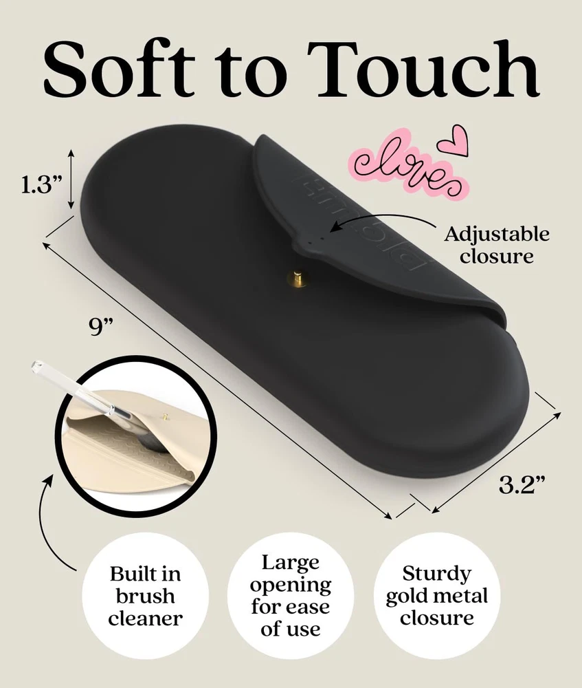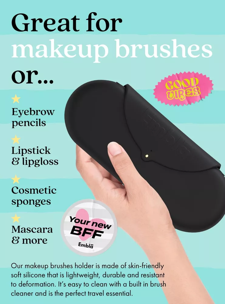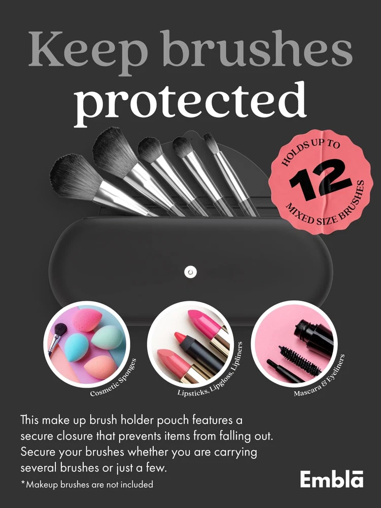 Embla Makeup Brush Holder Travel Cosmetic Case Pouch, Soft Silicone Cosmetic Bag Make Up Brushes Holder with Secure Snap Closure, Travel Makeup Brush Case, Black PROTECT YOUR MAKEUP BRUSHES with the Embla makeup brushes holder. This large makeup brush organizer measures 9 x 3.2 x 1.3 inches making it the perfect size for all your makeup brushes including foundation, concealer, powder, blush, bronzer, contour, highlighter, fan, eyeshadow, pencil, smudge, eyeliner, eyebrow, lip, kabuki, stippling, duo-fiber and lip liner brushes, mascara wands and blending sponges. SOFT TOUCH SILICONE WITH SECURE GOLD METAL CLOSURE. This makeup brushes holder is made of skin-friendly soft silicone that is lightweight, durable and resistant to deformation. The brush holder pouch also features a secure closure that prevents items from falling out and makes it easy access to your cosmetic brushes. EASY TO CLEAN WITH BUILT IN BRUSH CLEANER. Silicone cosmetic brush holder is easy to clean and rinse with a little soap and water. The inside of the case has built-in ridges, much like a brush cleaning mat, that are designed to clean your brushes. TRAVEL ESSENTIAL This makeup brush travel holder is perfect for travel, an overnight, a business trip or vacation. The cute stylish case can accommodate virtually all brush sizes yet is compact enough to keep in your carry-on luggage, toiletry bag, backpack, gym bag or purse. COLORS TO MATCH YOUR STYLE This makeup brush case comes in multiple colors including tan, black, red, blue, pink, white, purple, brown, orange and more to match your own personal style. They also make for a great gift for mom, wife, daughter, grandmother, birthdays, bridesmaids, Valentines Day, Mother’s day, Christmas, teacher appreciation and other special occasions. Description Makeup Brush Holder Travel Cosmetic Case Pouch, Soft Silicone Cosmetic Bag Make Up Brushes Holder with Snap Closure,Travel Brush Case - Black SHIPPING Domestic Buyers - We have confidence in our products, but if you are not fully satisfied please contact us within 30 days of purchase and you will get full refund. - We ship within 3 business days of payment, usually sooner - We offer FREE shipping on all orders! - We only ship to the lower 48 states, no APO/FPO addresses or PO Boxes allowed International buyers – please note: Import duties, taxes, and charges aren't included in the item price or postage cost. These charges are the buyer's responsibility. - Please check with your country's customs office to determine what these additional costs will be prior to bidding or buying. * Order Cancellation Policy ** You can return a product for up to 30 days from the date you purchased it. 1. The seller reserves the right to cancel the special case only due to eBay cancellation fee. 2. The decision of seller is the final. 3. The seller will respond to the cancellation request within 2 business days. Please wait for the result of cancellation. 4. In case the cancellation is not completed by some reasons, the buyer can follow the options below to get the refund. 4.1 The buyer can reject the item when it arrives. 4.2 The buyer can send the item back to the seller within 30 days If the buyer receives item (USA Shipment ONLY). The seller will provide the FREE return label to the buyer when the buyer opens " Return Item" case on eBay by using the reason as "Change my mind" ONLY. 5. When buyer has placed the order. The order will be processed and completed by automatic warehouse system within 5 minutes. In case that buyer sends the cancellation request after 5 minutes of placing the order, the request will be rejected. **Sending direct message to cancel the order is not allowed for every case.* Return Policy For the return case - If buyer would like to return the items for refund or replacement, please CONTACT SELLER to receive the free return label from seller. The refund or replacement will be processed with the tracking number of return label which is provided by seller only. The other ways of return which are not approved by seller will not be processed for the refund or replacement.