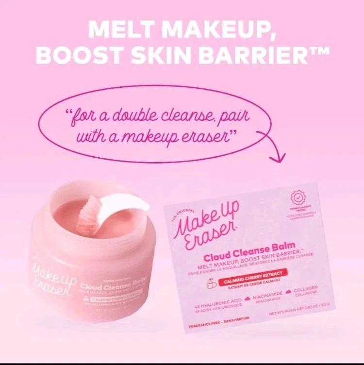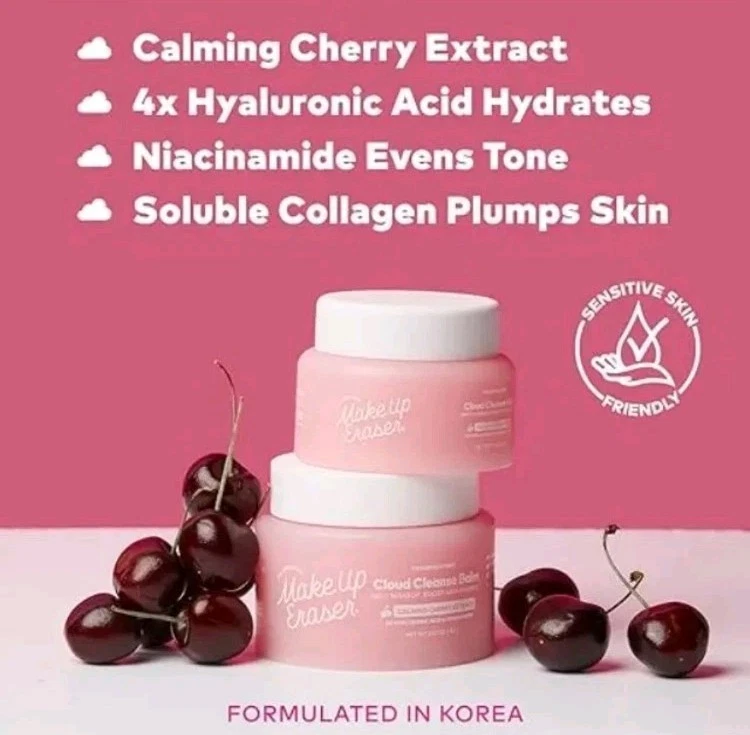 Bigger size Jar available in separate listing 💕 Erase Makeup, Treat Skin Balm-to-oil emulsifying Korean formula erases waterproof makeup, sunscreen, & impurities from pores. Dermatologist tested to be less irritating & support the skin barrier. Formulated with 27 skin conditioning agents, including: ✓ Calming Cherry Extract to calm & brighten skin ✓ 6 ferments & probiotics to support skin's microbiome ✓ 4 core types of hyaluronic acid to add & retain moisture ✓ Niacinamide to help even skin tone ✓ Soluble collagen to penetrate & plump skin This formula is non-comedogenic, fragrance-free, vegan, cruelty free, & sensitive skin friendly. PRO TIP: For a double cleanse, pair with a MakeUp Eraser. How to use: Scoop a dime-sized amount of balm into your hand. Apply to dry skin, gently massaging in circular motions, including around the eyes to remove eye makeup. Remove eye makeup. Remove with warm water or a MakeUp Eraser. • Made in South Korea • Ingredients: Ethylhexyl Palmitate, Ethylhexyl Stearate, Synthetic Wax, Polyglyceryl-2 Caprate, Polyglyceryl-4 Isostearate, Sorbitan Sesquioleate, Olea Europaea (Olive) Fruit Oil, Niacinamide, Prunus Serotina (Wild Cherry) Fruit Extract, Salix Alba (Willow) Bark Extract, Beta-Glucan, Soluble Collagen, Aureobasidium Pullulans Ferment, Bifida Ferment Lysate, Aspergillus Ferment, Bacillus Ferment, Lactococcus Ferment, Lactobacillus Ferment, Saccharomyces Ferment Filtrate, Fructooligosaccharides, Maltodextrin, Fructan, Sorbitol, Sodium Hyaluronate, Sodium Acetylated Hyaluronate, Hydrolyzed Hyaluronic Acid, Hydrolyzed Sodium Hyaluronate, Hyaluronic Acid, Hydroxypropyltrimonium Hyaluronate, Potassium Hyaluronate, Sodium Hyaluronate Crosspolymer, Eclipta Prostrata Extract, Melia Azadirachta Leaf Extract, Moringa Oleifera Seed Oil, Caprylyl Glycol, Ethylhexylglycerin