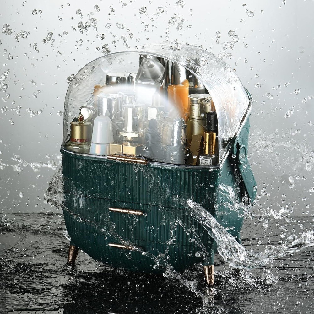 Specific Uses For Product Cosmetics, Portable Electronic Devices Material Plastic Special Feature Portable Color Mint Product Dimensions 8"D x 11.4"W x 14.4"H Shape Rectangular Package Type FFP Number of Items 2 Maximum Weight Recommendation 11 Pounds See less Number of Compartments 3 Unit Count 1.0 Count About this item Appearance and size:Makeup storage:11.4"L×8.1"W×14.4"H,brush holder:4.7"L×4.92"H.Large capacity with 2 drawers,top apartment,even a 7.5”H bottle of skincare can fit in Clear display:With a top lid you don't have to worry about dust and water stains,while the transparent feature allows you to easily find what you need. The top lid lifts upwards in a standable design,allowing you to easily access the cosmetics you need Save much space and organize well:can store 16 bottles of lotion,6 bottles of serum,4 lipsticks,3 boxes of eye shadow,3 bottles of perfume,6 boxes of loose powder and some masks.Saves space and keeps vanity organized Portable and nonslip:With Handle,carry your skincare products from the vanity to the bathroom countertop with ease by simply lifting the handle. With nonslip feet,It also remains stable on wet bathroom countertop Easier life:Making homes tidier,more organize and easier to live in order for a better home life is our vision,and we hope convey this through high quality storage products. It makes a ideal gift for your daughter, girlfriend, family and yourself