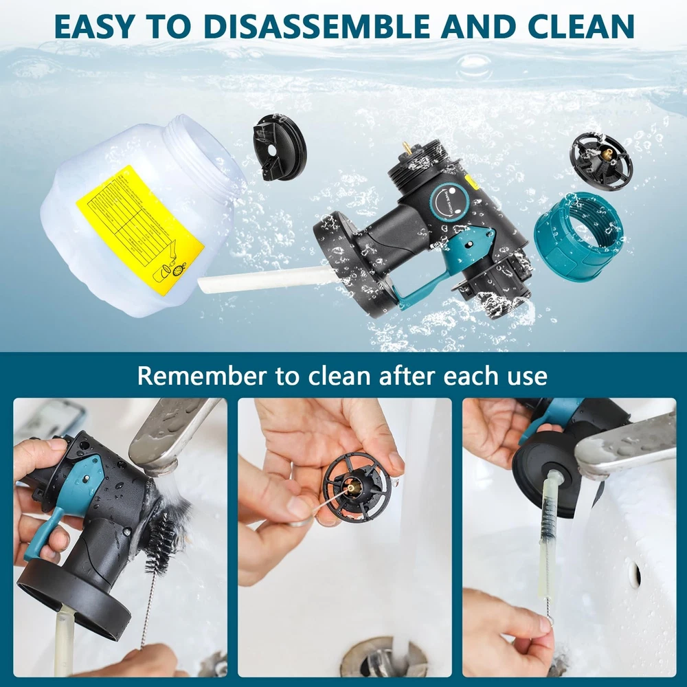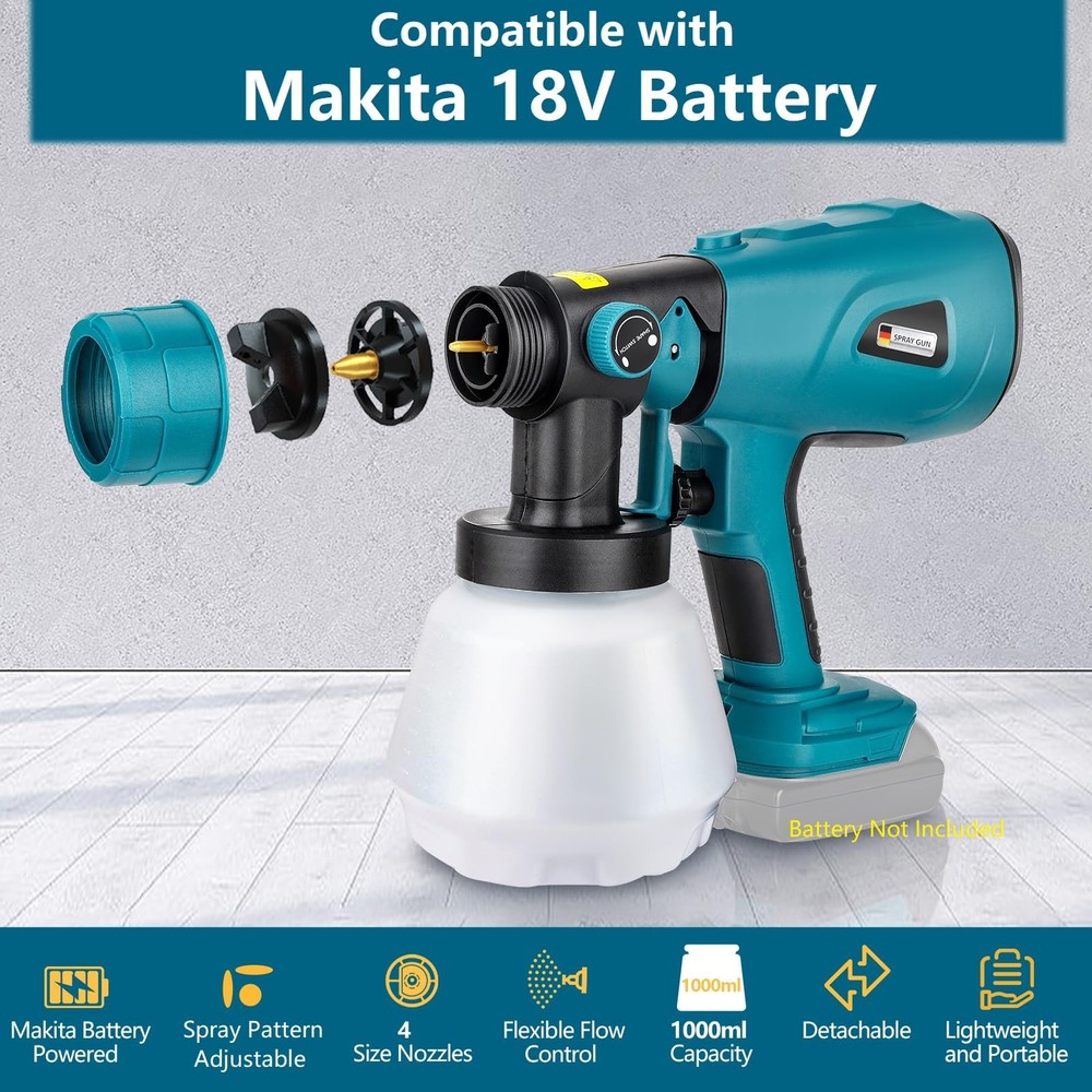 Product Features: Power: 200W Rated Voltage: 20V(Max) Motor Rated Speed: 42000rpm/min Spray Patterns: horizontal, vertical, orbicular Paint Tank Capacity: 1000 ml Applications: Suitable for wall painting, fence painting, door painting, window painting, metal painting, ceiling painting, car repairing, high-altitude operations, plant watering,etc. Care Instruction: Do not place the spray gun with the nozzle pointing upwards when it is out of use, or work upwards without releasing the switch to prevent the motor from being damaged by the backflow of paint. The spray gun should be cleaned in time after use to prevent the paint from solidifying and clogging the spray holes. Battery operated paint sprayer compatible with Makita 18v Batteries. Transform your spraying projects with ease and convenience with our wireless paint spray gun, no more worrying about cables not reaching your working area, enjoy a seamless painting experience. - Paint sprayer cordless for house painting comes with 4 copper nozzles to meet different needs, suit for painting tasks like cabinets, doors, furniture, fence, walls and other DIY projects. The copper nozzles outperform plastic in durability, clogging resistance and ease of cleaning. Nozzle sizes: 1.0mm, 1.8mm, 2.5mm(pre-installed), 3.0mm. - The paint sprayer gun equipped with 42000rpm brushless motor provides highly Efficient painting performance, faster and more convenient than brushes and rollers. - This paint sprayer gun features adjustable spray modes, horizontal,vertical and toggle the knob to adjust spray pattern from elliptic to round shape. Its adjustable flow control conveniently suit your needs. - This beginner friendly cordless paint sprayer is easy to assemble and clean, simple to operate. The suction tube can be switched for upward and downward operation. - This battery powered paint sprayer compatible with Makita 18V lithium ion batteries.(Battery Not Included). The HVLP paint sprayer built-in low voltage protection to protect your Makita battery.