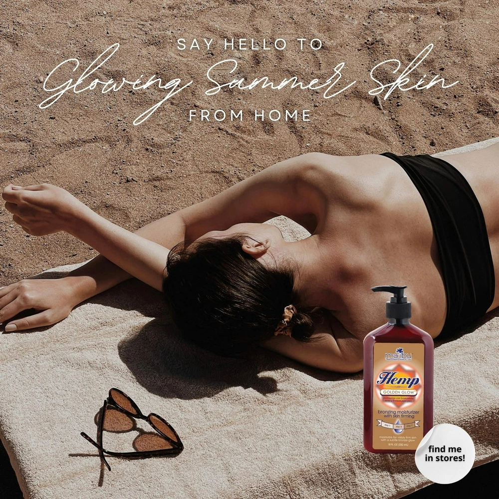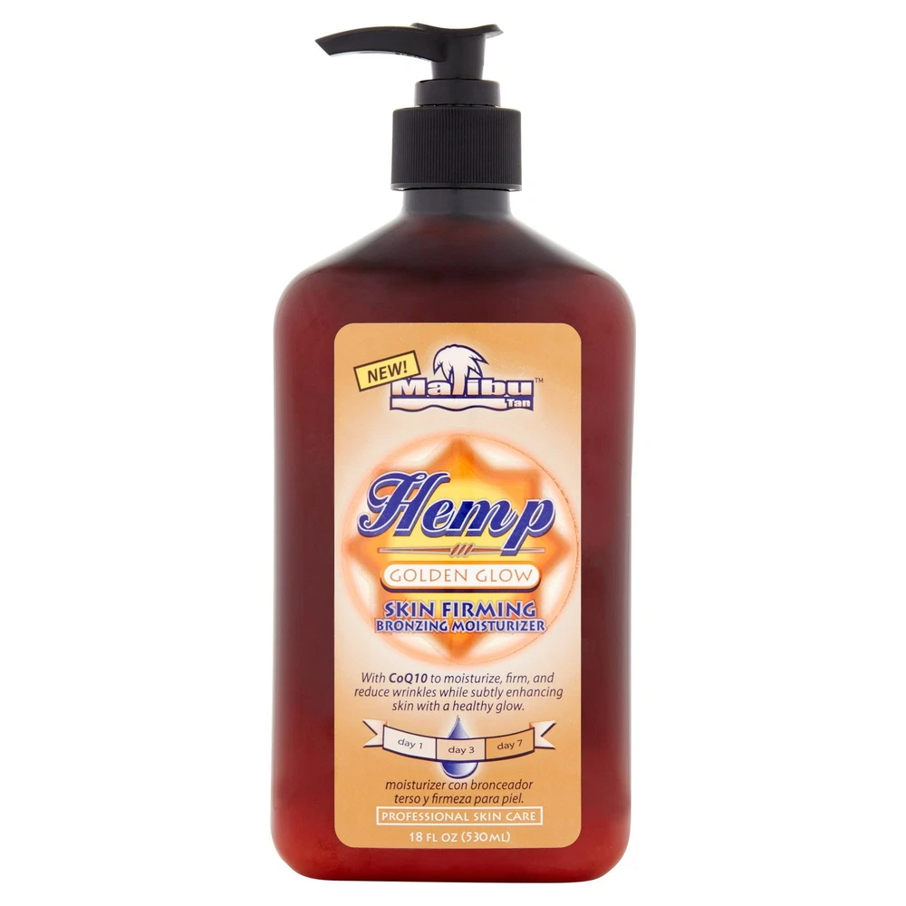 About this item Product details Elevate Your Radiance with Malibu Tan's Hemp Golden Glow Bronzing Moisturizer with Skin Firming. Infused with CoQ10, this luxurious formula indulges your normal skin in deep nourishment. Experience the transformative power of hemp, as this moisturizer is expertly crafted to enhance skin's smoothness while reducing the appearance of fine lines and wrinkles. With each application, witness your skin take on a subtle, golden glow that intensifies beautifully over time. Embrace the opulence of Malibu Tan's Hemp Golden Glow Lotion, elegantly presented in an 18-oz pump dispenser for effortless indulgence. Your path to luminous, youthful-looking skin with a flawless golden glow begins here. Firming & bronzing skin moisturizer with nature's finest moisturizer- Hemp! Malibu Tan's Hemp formula naturally hydrates skin Made with CoQ10 complex to condition appearance of skin Reduces the appearance of fine lines and wrinkles for a more youthful look Gives skin a flawless natural golden glow Malibu Tan's bronzing effect intensifies with each application Specifications Skin Care Key Benefits Ultra Moisturizing Scent Banana Strawberry Coconut Body Part Body Brand Malibu Tan Indications Stop Use Indications N/A Health Concern Skin Health Skin Care Concern Wrinkles Dryness Directions Instructions For best results, use daily. Smooth on evenly, allowing to dry before dressing. Wash hands after application. Ingredients Inactive Ingredients N/A Ingredients Water, Propylene Glycol, Coconut (Cocos Nucifera) Oil, Cetearyl Alcohol, Polysorbate 60, Isopropyl Myristate, Cetyl Alcohol, Sorbitan Stearate, Dihydroxyacetone, Glycerin, Stearic Acid, Hempseed (Cannabis Sativa) Oil, Tocopheryl Acetate, Erythrulose, Ubiquinone, Butylene Glycol, PEG-8, Bupleurum Falcatum Extract, Caffeine, Coenzyme A, Sesame (Sesamum Indicum) Oil, Jojoba (Buxus Chinensis) Oil, Sunflower (Helianthus Annuus) Seed Oil, Olive (Olea Europaea) Oil, Tea Tree (Melaleuca Alternifolia) Oil, Green Tea (Camellia Oleifera) Extract, Calendula Officinalis Extract, Cyclomethicone, Dimethicone, Sodium Gluconate, Potassium Sorbate, Diazolidinyl Urea, Methylparaben, Propylparaben, Fragrance, BHT, Citric Acid. Active Ingredients NA