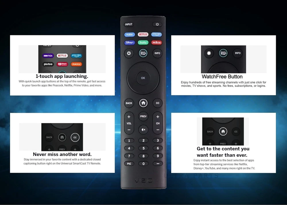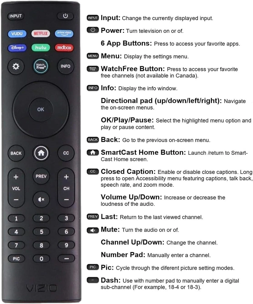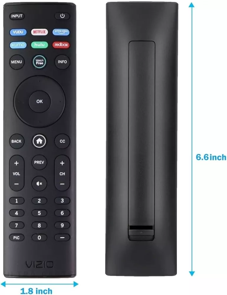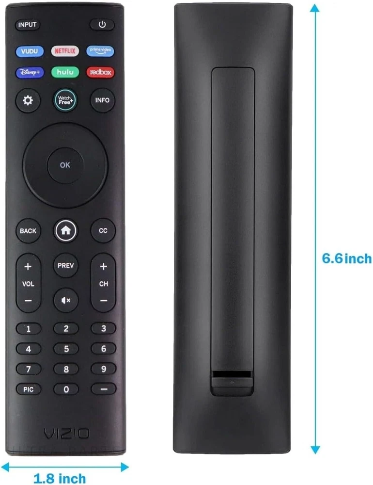 OEM Replacement Remote Control XRT140 fits for All VIZIO LED LCD HD UHD HDR Smartcast 4K 3D Smart TVs, including D-Series, E-Series, M-Series, P-Series, PX-Series, V-Series, OLED-Series with 6 Shortcut APP Keys. Compatibility: Full HD 4K-Series: VHD32M-0807 VHD24M-0810 VFD32M-0807 VFD40M-0810 VFD43M-0804 V4K43M-0801 V4K50M-0807 V4K55M-0801 V4K65M-0804 V4K70M-0801 V4K75M-0804 V4K86C-0804 D-Series: D24h-J09 D24F-F1 D24F-G9 D24H-G9 D32h-J09 D32F-F1 D32F-G4 D32H-F0 D32H-F1 D32H-F4 D39F-F0 D39F-F1 D40F-F1 D40F-G9 D43-F1 D43F-F1 D43F-F2 D43FX-F4 D48F-F0 D50-F1 D50-F501 D50F-F1 D50X-G9 D55-F2 D55X-G1 D60-F3 D65-F1 D65X-G4 D70-F3 D24F-G1 D32F-G1 D32H-G9 E-Series: E32-D1 E32H-D1 E40-D0 E43-D2 E43-E2 E43-F1 E43U-D2 E48-D0 E48U-D0 E49U-D1 E50-D1 E50-E1 E50-E3 E50-F2 E50U-D2 E50X-E1 E55-D0 E55-E1 E55-E2 E55-F0 E55-F1 E55U-D0 E55U-D2 E60E-3 E60-E3 E60-F3 E60U-D3 E65-D0 E65-D1 E65-E0 E65-E1 E65-E3 E65-F0 E65-F1 E65U-D1 E65U-D3 E70-D3 E70-E3 E70-F3 E70U-D3 E75-E16 E75-E3 E75-F1 E75-F2 E80-E3 E80-F3 E80U-DE M-Series: M50-D1 M50-E1 M55-D0 M55-E0 M55-F0 M60-D1 M65-D0 M437-G0 M507-G1 M557-G0 M558-G1 M657-G0 M658-G1 M65-E0 M65-F0 M70-D3 M70-E3 M70-F0 M70-F3 M75-E1 M80-D3 M43Q6-J04 M43Q6M-K04 M50Q6-J01 M50QXM-K01 M55Q6-J01 M65Q6-J09 M65Q6M-K04 M75Q6-J03 P/PX-Series: P50-C1 P55-C1 P55-E1 P55-F1 P55RED-F1 P65-C1 P65-C1 P65-E1 P65-F1 P75-C1 P75-E1 P75-F1 P659-G1 P759-G1 PX65-G1 PX75-G1 PQ65-F1 V-Series: V405-G9 V435-G0 V435-G1 V436-G1 V555-G1 V556-G1 V585-G1 V605-G3 V655-G9 V656-G4 V705-G1 V705-G3 V755-G4 V505-G9 V435-J01 V435M-K04 V505-J09 V505M-K09 V555-J01 V585-J01 V655-J09 V655M-K04 V655M-K03 V705-J01 V705-J03 V755-J04 OLED-series: VQD43M-0801 M55Q6-L4 M65Q6-L4 M75Q6-L4 VQP65C-84 VQP75C-84 OLED65-H1 OLED55-H1 Product Description Compatible Brand: VIZIO Smartcast 4K 3D Smart TVs Remote Feature Shortcuts. Upgrade Chip, Durable Lifespan, High Quality, and Stable Performance. Designed for easy replacement and operation. Color: Black Material: ABS Material. Stability and Safety: Better viewing experience, Easy to pair, and made from premium quality materials for long-lasting durability. Package Content: 1 x IR Remote Control (Batteries and Instruction Manual are not included).