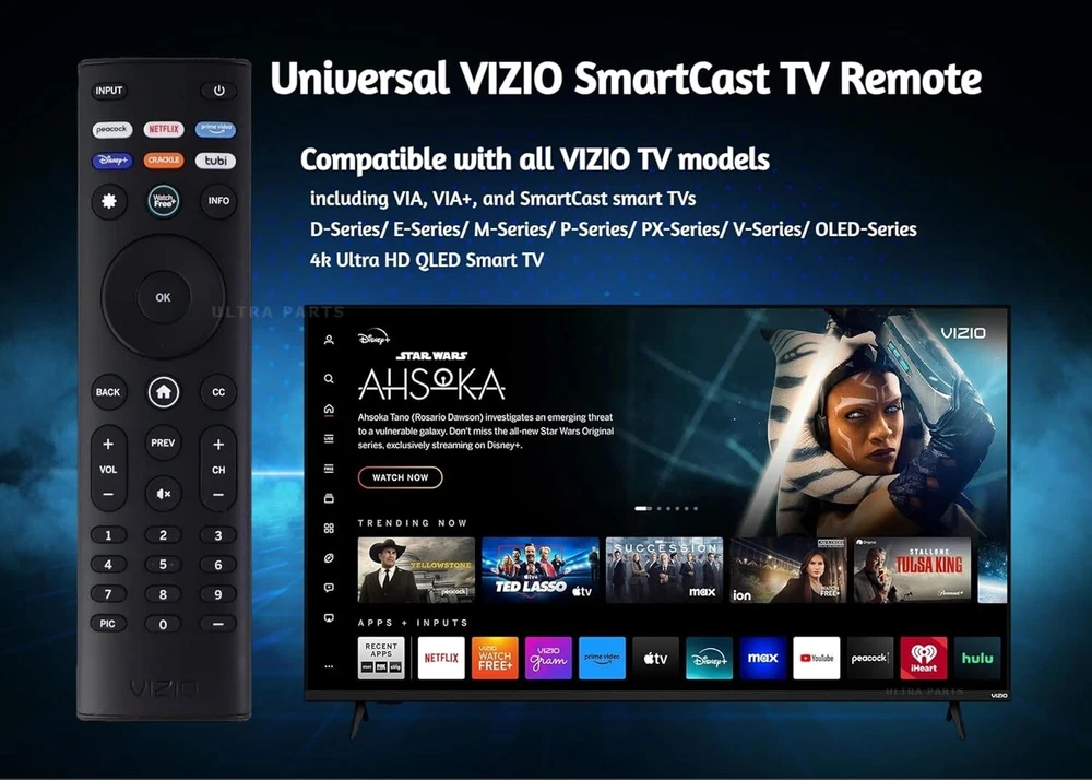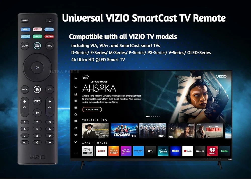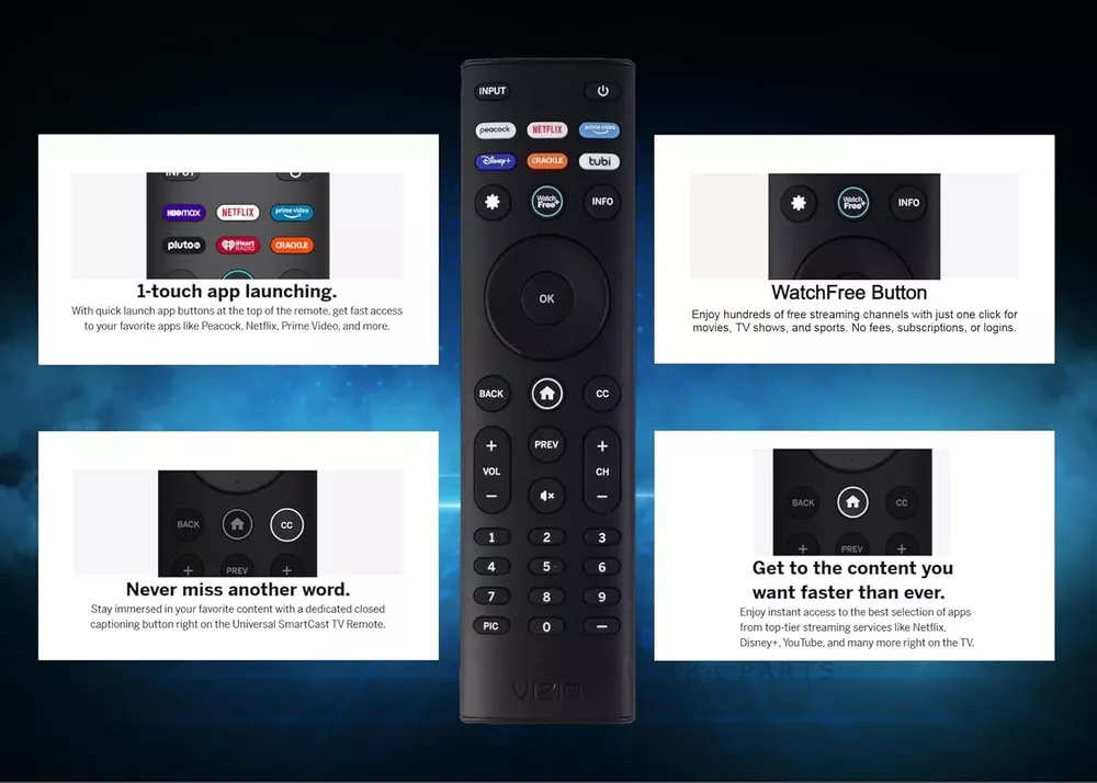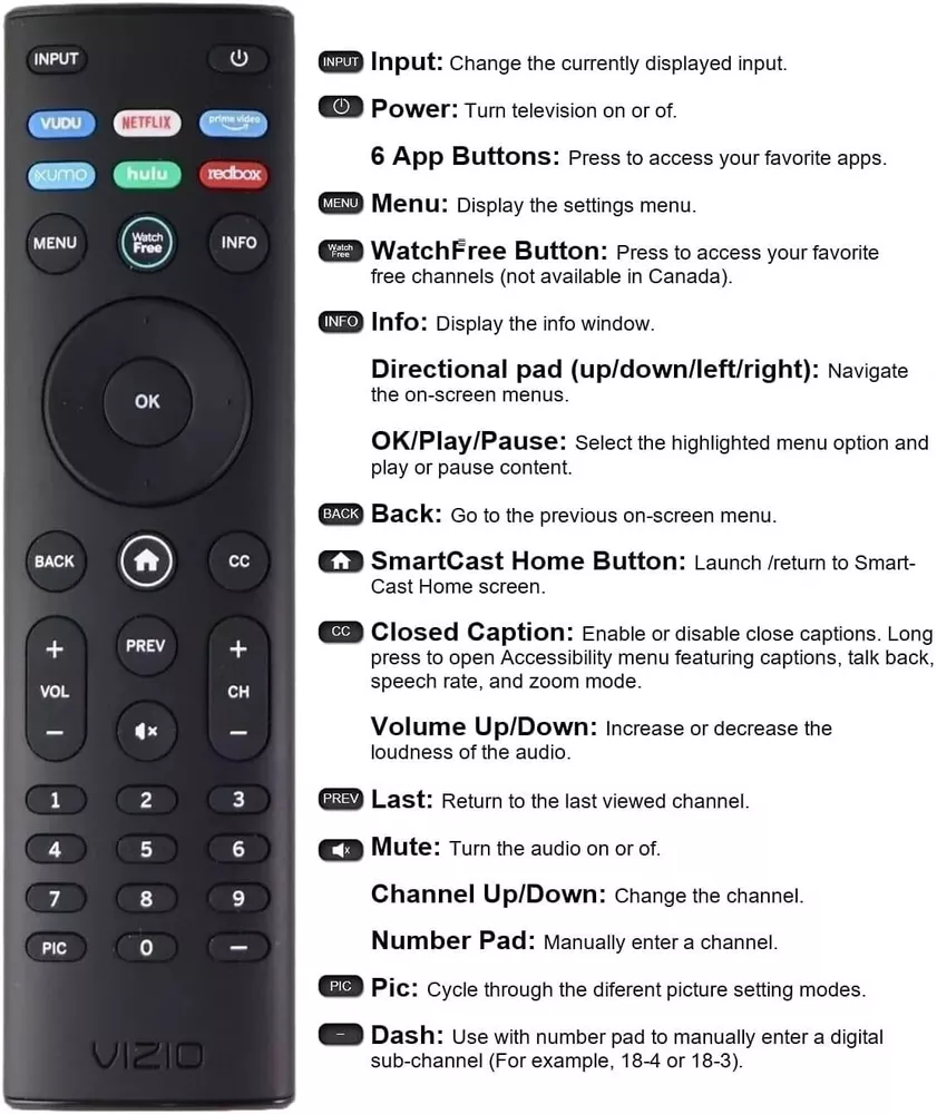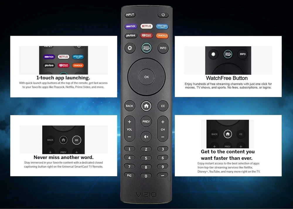 OEM Replacement Remote Control XRT140 fits for All VIZIO LED LCD HD UHD HDR Smartcast 4K 3D Smart TVs, including D-Series, E-Series, M-Series, P-Series, PX-Series, V-Series, OLED-Series with 6 Shortcut APP Keys. Compatibility: Full HD 4K-Series: VHD32M-0807 VHD24M-0810 VFD32M-0807 VFD40M-0810 VFD43M-0804 V4K43M-0801 V4K50M-0807 V4K55M-0801 V4K65M-0804 V4K70M-0801 V4K75M-0804 V4K86C-0804 D-Series: D24h-J09 D24F-F1 D24F-G9 D24H-G9 D32h-J09 D32F-F1 D32F-G4 D32H-F0 D32H-F1 D32H-F4 D39F-F0 D39F-F1 D40F-F1 D40F-G9 D43-F1 D43F-F1 D43F-F2 D43FX-F4 D48F-F0 D50-F1 D50-F501 D50F-F1 D50X-G9 D55-F2 D55X-G1 D60-F3 D65-F1 D65X-G4 D70-F3 D24F-G1 D32F-G1 D32H-G9 E-Series: E32-D1 E32H-D1 E40-D0 E43-D2 E43-E2 E43-F1 E43U-D2 E48-D0 E48U-D0 E49U-D1 E50-D1 E50-E1 E50-E3 E50-F2 E50U-D2 E50X-E1 E55-D0 E55-E1 E55-E2 E55-F0 E55-F1 E55U-D0 E55U-D2 E60E-3 E60-E3 E60-F3 E60U-D3 E65-D0 E65-D1 E65-E0 E65-E1 E65-E3 E65-F0 E65-F1 E65U-D1 E65U-D3 E70-D3 E70-E3 E70-F3 E70U-D3 E75-E16 E75-E3 E75-F1 E75-F2 E80-E3 E80-F3 E80U-DE M-Series: M50-D1 M50-E1 M55-D0 M55-E0 M55-F0 M60-D1 M65-D0 M437-G0 M507-G1 M557-G0 M558-G1 M657-G0 M658-G1 M65-E0 M65-F0 M70-D3 M70-E3 M70-F0 M70-F3 M75-E1 M80-D3 M43Q6-J04 M43Q6M-K04 M50Q6-J01 M50QXM-K01 M55Q6-J01 M65Q6-J09 M65Q6M-K04 M75Q6-J03 P/PX-Series: P50-C1 P55-C1 P55-E1 P55-F1 P55RED-F1 P65-C1 P65-C1 P65-E1 P65-F1 P75-C1 P75-E1 P75-F1 P659-G1 P759-G1 PX65-G1 PX75-G1 PQ65-F1 V-Series: V405-G9 V435-G0 V435-G1 V436-G1 V555-G1 V556-G1 V585-G1 V605-G3 V655-G9 V656-G4 V705-G1 V705-G3 V755-G4 V505-G9 V435-J01 V435M-K04 V505-J09 V505M-K09 V555-J01 V585-J01 V655-J09 V655M-K04 V655M-K03 V705-J01 V705-J03 V755-J04 OLED-series: VQD43M-0801 M55Q6-L4 M65Q6-L4 M75Q6-L4 VQP65C-84 VQP75C-84 OLED65-H1 OLED55-H1 Product Description Compatible Brand: VIZIO Smartcast 4K 3D Smart TVs Remote Feature Shortcuts. Upgrade Chip, Durable Lifespan, High Quality, and Stable Performance. Designed for easy replacement and operation. Color: Black Material: ABS Material. Stability and Safety: Better viewing experience, Easy to pair, and made from premium quality materials for long-lasting durability. Package Content: 1 x IR Remote Control (Batteries and Instruction Manual are not included).