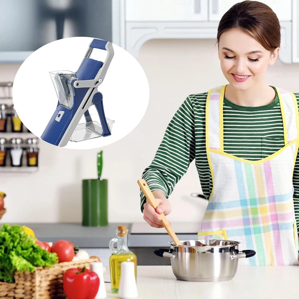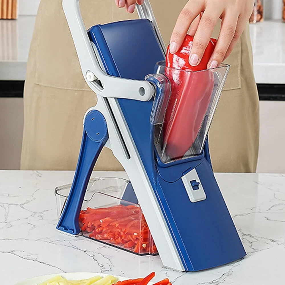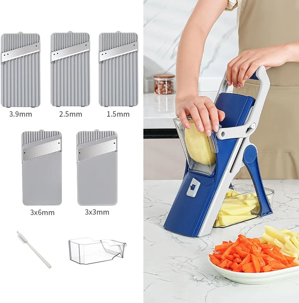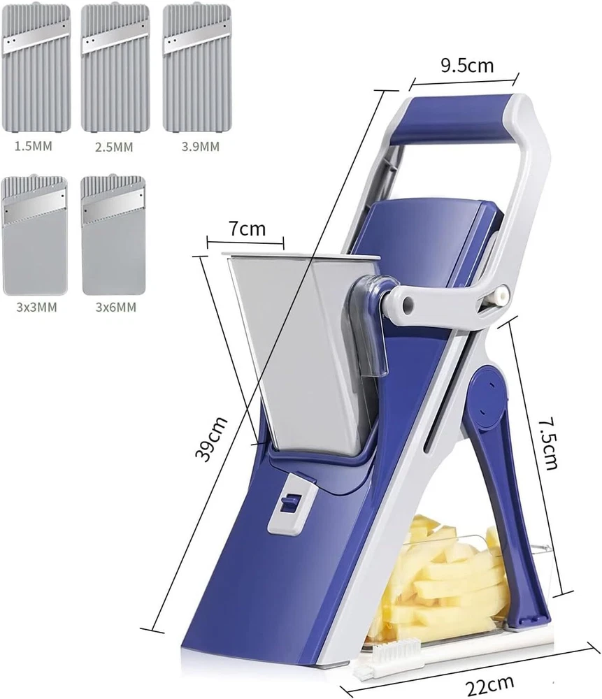 Camidy Safe Mandoline Slicer 5 in 1 Vegetable Chopper Food Potato Cutter, Potato Cutter Strips Julienne Dicer Detachable Blade Chopper for Kitchen Product Description Features Enjoy julienne, matchstick and slicing options in one vegetable slicer. Meet all your culinary needs and save time in the kitchen. Made of high quality steel, this mandoline slicer is safe, durable and sharp. Its unique design prevents accidental cuts for safety and precision. Use the included small brush to remove food residue under the tap. Be sure to air dry and keep out of the of children. The non- slip silicone pad keeps the mandolin in place while you work. Plus, its design makes it easy to cut into large containers. Prepare delicious, healthy meals quickly and easily. Avoid fast food and save space in your kitchen with this multifunctional slicer. Specification Color: Blue Material: Metal Plastic Size: As shown Package Including Packing list: 1 food slicer 1 cleaning brush 1 Storage containers About this item 【CONVENIENT OPERATE & FAST CLEAN】: Put the washed vegetables into the feeding chute, then you can cut out the shape you want, it is very easy to operate and more effortless.This vegetable slicer will be not only an essential helper in kitchen, but also great gift for wife, family and friends! 【 SAFE AND LABOR-SAVEING】 No need to touch the blade while cutting, can protect your hand from accidental damage. Compared with others, ours is safer. With lever design, which is more efficient and quick. It helps to save your much time while cooking, and makes your life and cooking time more enjoyable. 【MULTIPURPOSE 5 IN ON FOODCUTTER】Equipped with 5 sizes blades for different thickness slices 1.5mm, 2.5mm, 3.5mm or Julienne 3mm, 6mm. You could use it for salad, cucumber, onion, potato, carrot, lemon, French meat and so on. To protect the blade, please make sure that the meat should be frozen and without bones before slicing.This is a great gift for wife, husband, and someone who loves cooking etc. 【 SUPERIOR MATERIAL AND HUMANIZED DESIGN】Durable and heavy duty stainless steel blade, ABS plastic, BPA free. Comfortable and ergonomic grip makes it easier to grip, and silicone gasket helps it hard to slip while cutting. 【EASY TO CLEAN AND STORE】A cleaning brush makes it more effective to wash with flowing water. Be careful to clean the blade. With container, convenient for you to store and clean vegetables, fruit and meat. Collapsible design, the veggie chopper is easy to store and will not take too much space. You could hang it in your kitchen.
