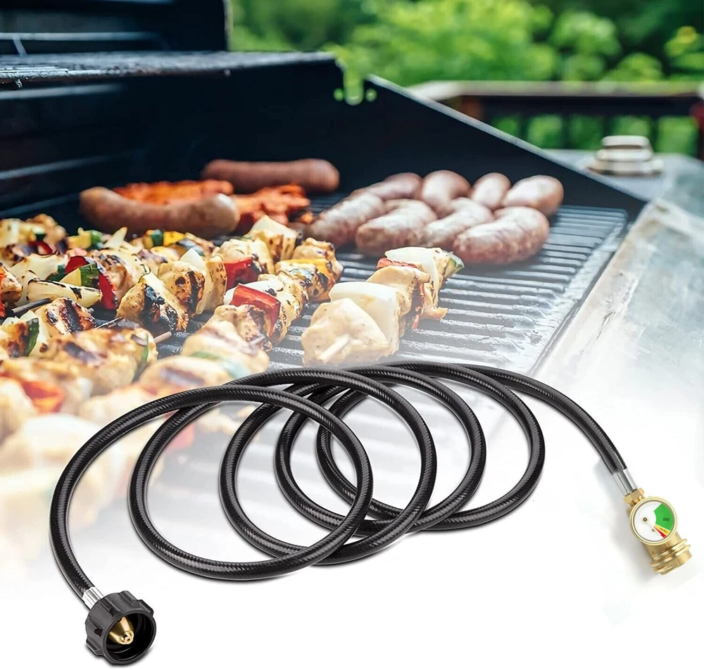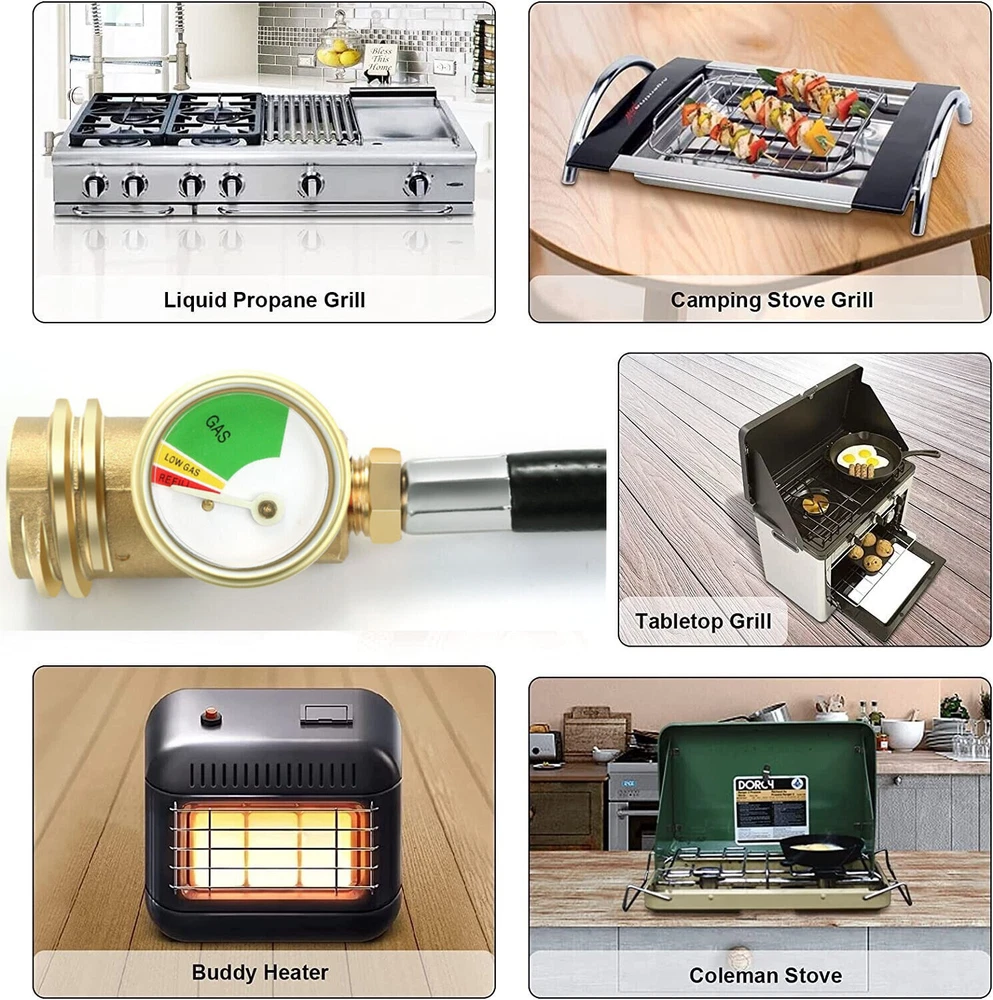 eBay 12 Feet Propane Tank Hose Extension with Gauge for Gas Grill, Heater and All Other Propane Appliances, Acme to Male QCC/POL Fittings Description UNIVERSAL- Compatible with all appliances with a QCC1 / type1 connection and up to 40 lb. propane tanks. CONVENIENCE- Come with 12 Feet long hose. You don't have to pull your propane tank out to read the dial on the gauge. More convenient than normal propane tank gauges. SAFETY- Built in leak detector to restrict flow in case of hose or grill malfunction HEAVY DUTY-100% solid brass construction withstands weather, scratching, denting and corroding. HASSLE FREE- Ready to use out of box / Fits all Propane tanks with QCC connection. Will not read levels immediately: begins working when propane is flowing Product Description Propane Tank Extension Hose with Gauget for Gas Grill, Heater and All Other Propane Appliances, Acme to Male QCC/POL Fittings 1.If you own it. You don't have to move your propane tank. You don't have to pull your propane tank out to read the dial on the gauge. More convenient than normal propane tank gauges. 2.Can I use it on a 100 lb. propane tank? Yes,It can be used with 100lb tank, yet you need an adapter with POL connection. Choose the adapter showed below. Color Coded Dial for Easy Viewing Monitors fuel level without removing the tank.No need to bend over or squint at tiny level markings. One glance at the DozyAnt's large dial will tell you whether you're in the red (empty), yellow (low) or green (sufficient). Note : This gauge will not say exactly when the propane tank will be empty, rather it gives an approximation. In hot weather the pressure increases and in cold weather the pressure decreases, therefore the same amount of Propane will show different levels on the gauge's meter Length 5 Feet 12 Feet / Male Connection Type QCC1 (Type 1) & POL QCC1 (Type 1) & POL Used with the hose for 100lb tank Female Connection Type QCC1 (Type 1) QCC1 (Type 1) Used with the hose for 100lb tank