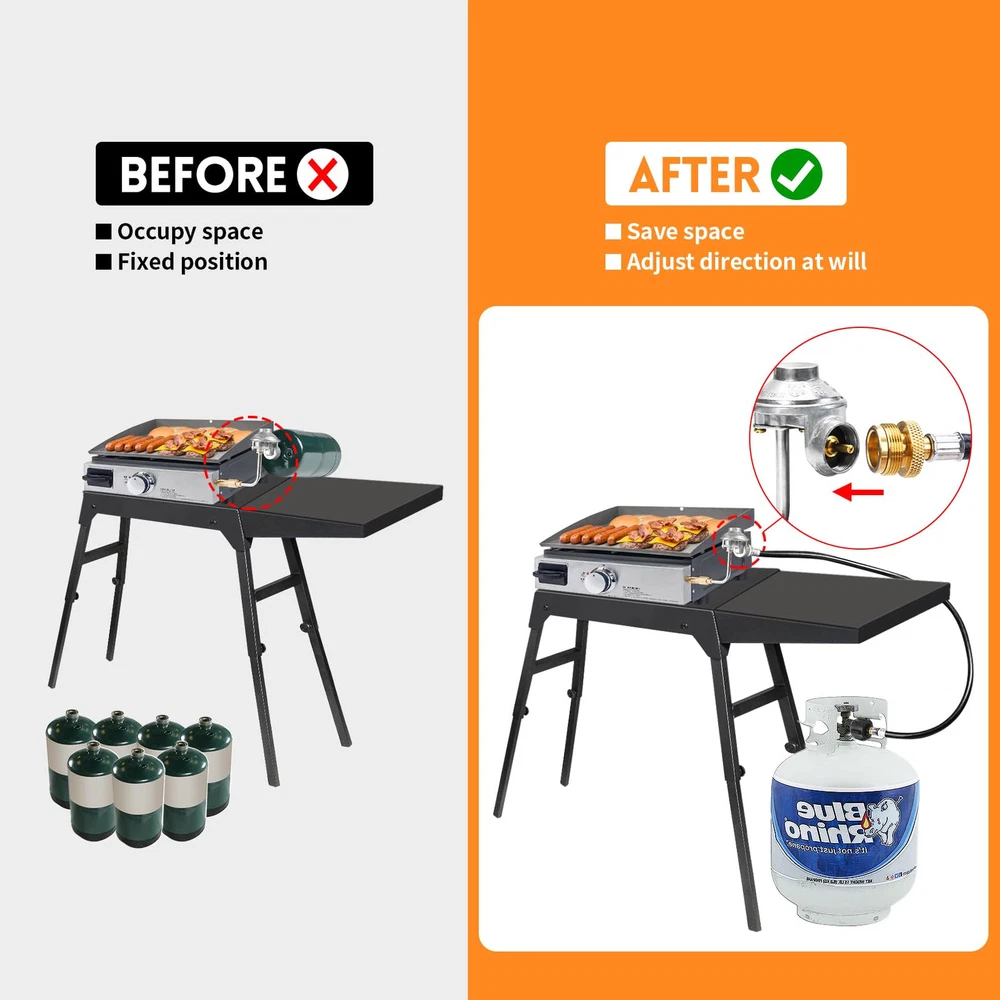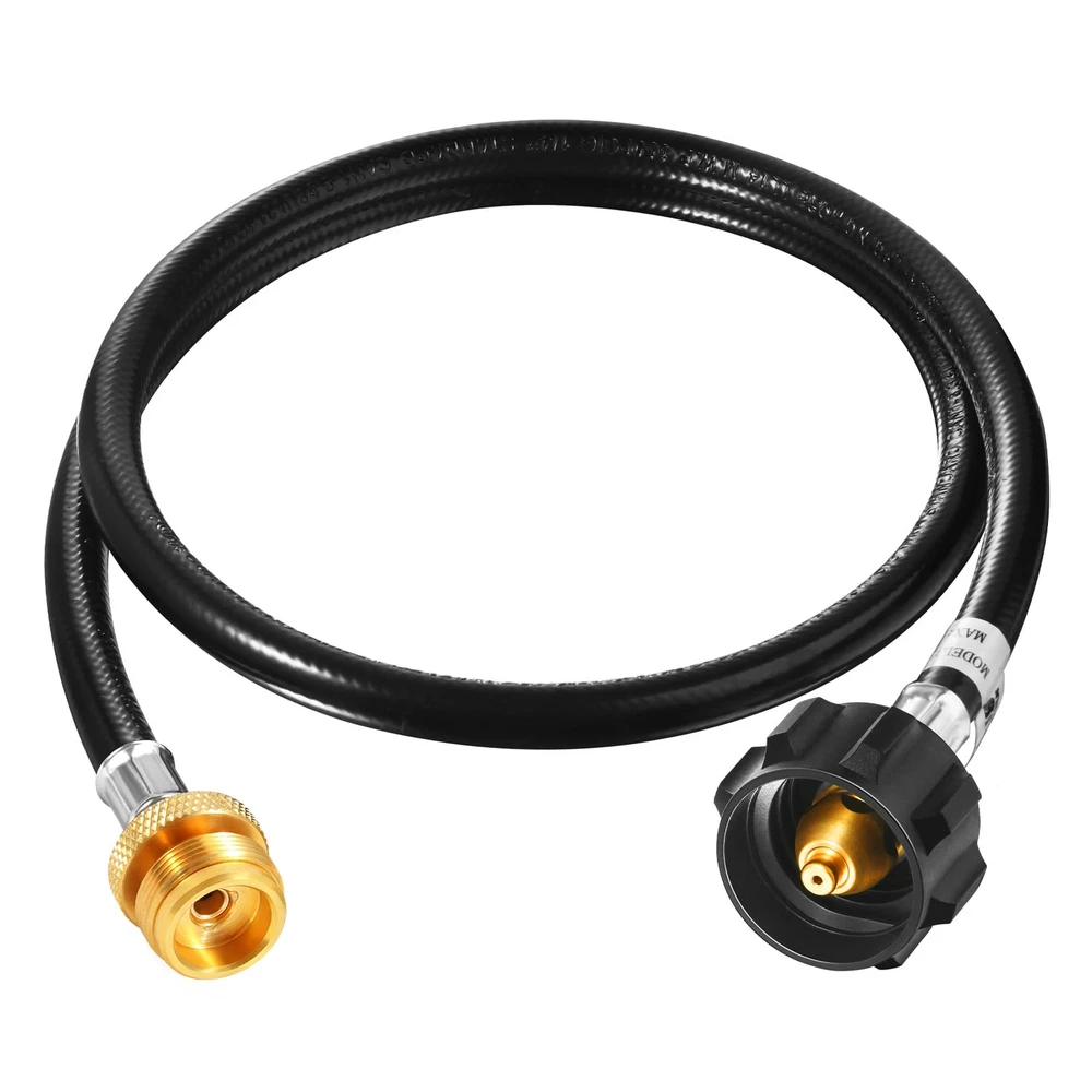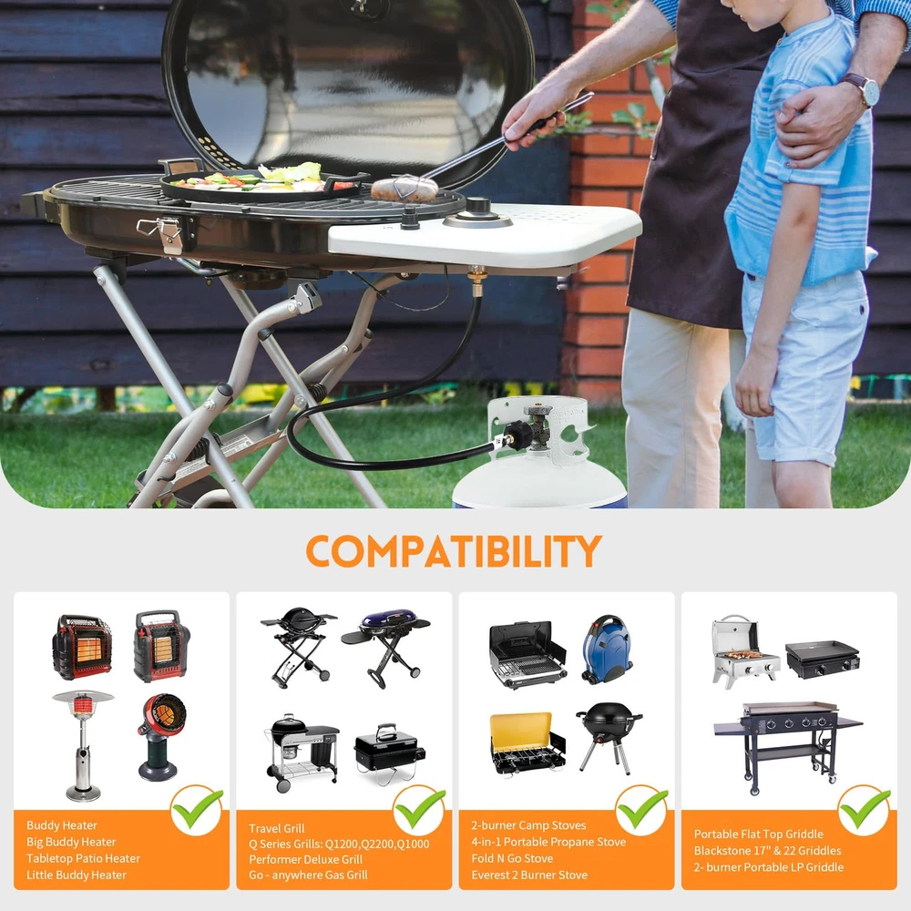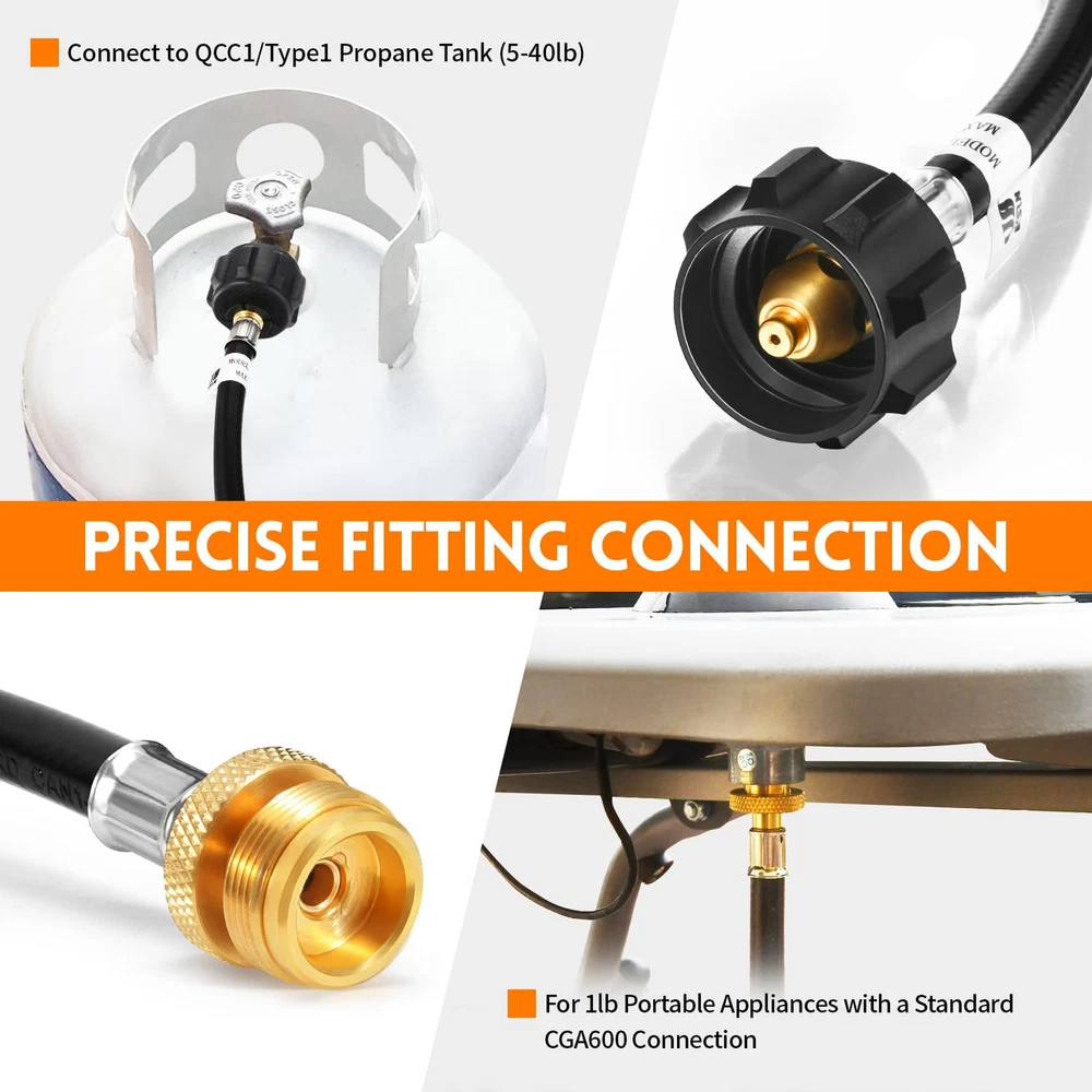 【Product Specifications】:The 4-foot propane hose is equipped with QCC1/Type1 fitting on one end and 1"-20 disposable cylinder external thread on the other. 【Save Money】:1lb to 20lb propane hose is compatible with all 1-pound portable devices, suitable for Weber Q grills, Coleman camping stoves, Blackstone 17" and 22" griddles, Buddy heaters, and more. You can reduce costs and minimize any waste associated with 1lb propane cylinders. 【Sturdy and Durable】: Propane hose is made from high-quality rubber and brass, providing enhanced durability and corrosion resistance. Its robust construction allows it to withstand harsh environments, remaining flexible even in cold winter conditions, making it ideal for portable devices. 【Easy to Install】:Propane tank adapter hose can be installed without any tools; you only need to manually tighten the handwheel end and the brass connector end of the product. With a 4-foot length, it's sufficient to connect to any portable grill or heater, so you don't have to worry about the propane hose being too long and causing wastage. 【CSA-Safety Certification】:The gas grill hose is CSA certified. If you encounter any issues during use, please contact us, and we will provide you with one year of warranty service.