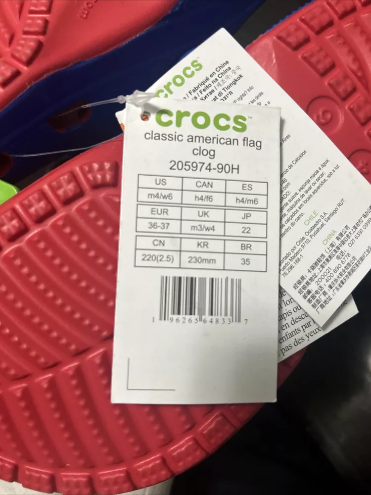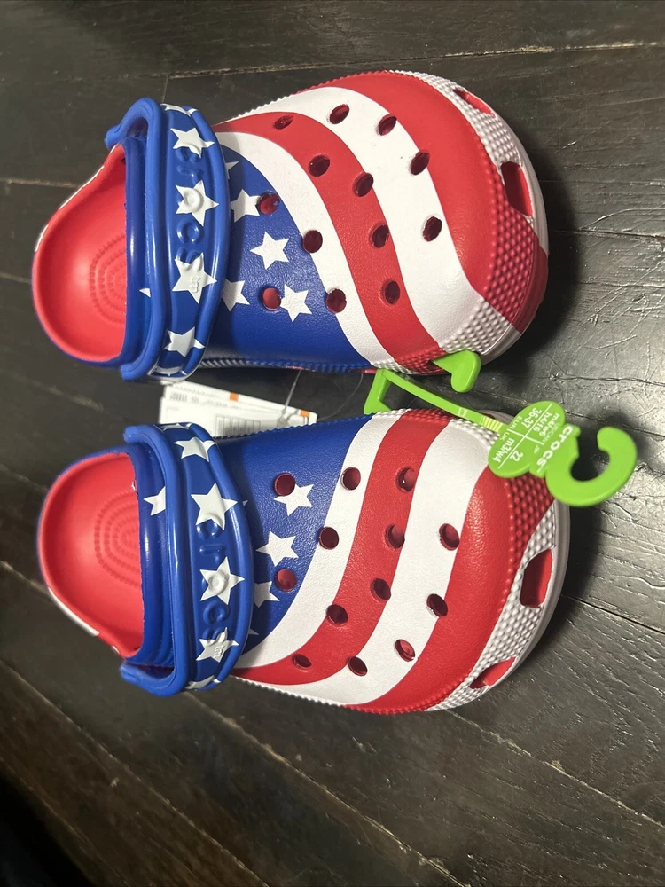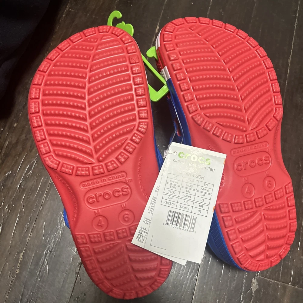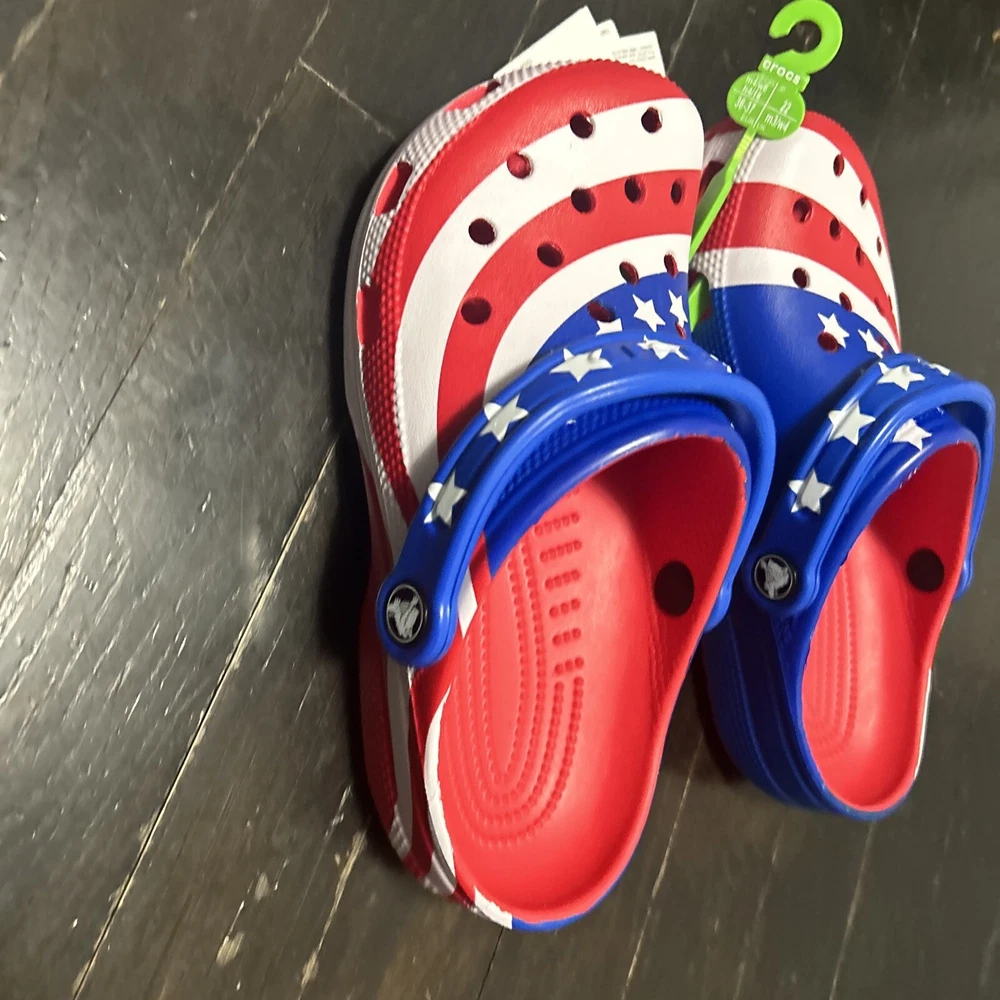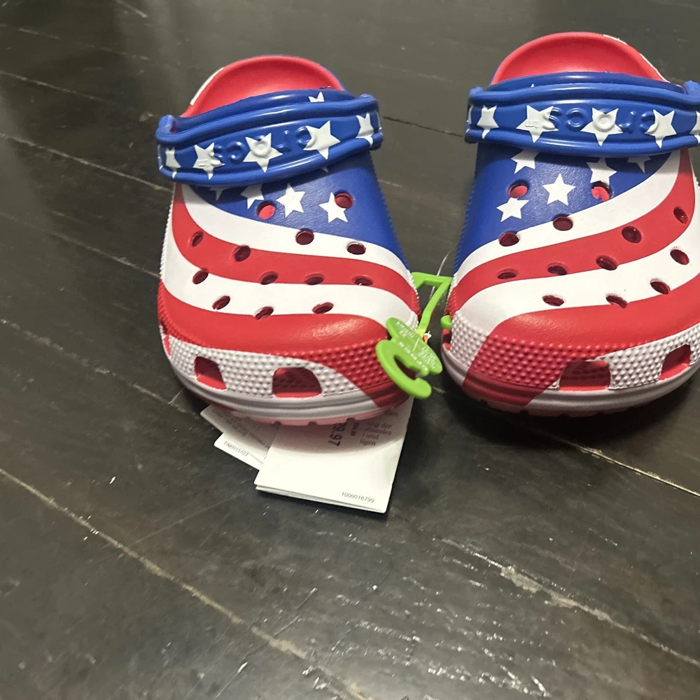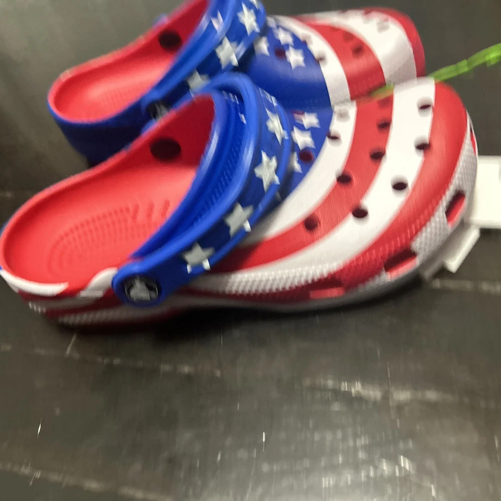 The Crocs Classic American Flag Clog is a men's athletic sandal featuring a patriotic design with a flag theme. The upper material of the sandal is described in the item details, providing comfort and style for casual wear. Perfect for those looking to add a touch of American pride to their footwear collection, these Crocs offer a unique and colorful option for everyday use.