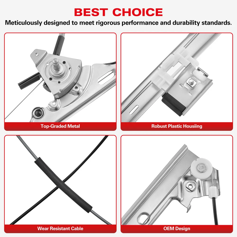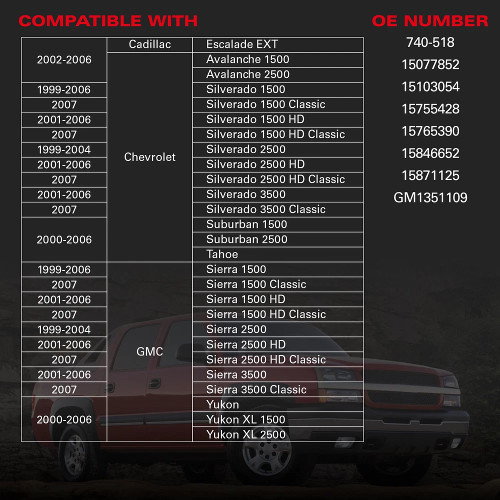 Fitment 2004-2006 Cadillac Escalade EXT 2004-2007 Chevrolet Silverado 1500 2004-2007 Chevrolet Silverado 1500 HD 2004-2007 Chevrolet Silverado 2500 HD 2004-2007 Chevrolet Silverado 3500 2004-2007 Chevrolet Tahoe 2004-2007 Chevrolet Suburban 2500 2004-2007 Chevrolet Suburban 1500 2004-2007 Chevrolet Silverado 3500 Classic 2004-2007 Chevrolet Silverado 1500 Classic 2004-2007 Chevrolet Silverado 2500 HD Classic 2004-2007 Chevrolet Silverado 1500 HD Classic 2004-2007 Chevrolet Avalanche 2500 2005-2007 GMC Sierra 3500 2005-2007 GMC Yukon XL 2500 2005-2007 GMC Yukon XL 1500 2005-2007 GMC Yukon 2005-2007 GMC Sierra 1500 2005-2007 GMC Sierra 1500 HD 2005-2007 GMC Sierra 1500 Classic 2005-2007 GMC Sierra 2500 HD Classic 2005-2007 GMC Sierra 3500 Classic 2005-2007 GMC Sierra 1500 HD Classic Details Specification Other Part Number: 15077852 MPN: A0072A0017 Superseded Part Number: 15871125, 15077852, 740517, GM1351109, 740518, WR40518 Placement on Vehicle: Front, Right Type: Window Regulator OE/OEM Part Number: 1507852/15877125 Operating Mode: Manual Surface Finish: Aftermarket Replacement Fitment 2004-2006 Cadillac Escalade EXT 2004-2007 Chevrolet Silverado 1500 2004-2007 Chevrolet Silverado 1500 HD 2004-2007 Chevrolet Silverado 2500 HD 2004-2007 Chevrolet Silverado 3500 2004-2007 Chevrolet Tahoe 2004-2007 Chevrolet Suburban 2500 2004-2007 Chevrolet Suburban 1500 2004-2007 Chevrolet Silverado 3500 Classic 2004-2007 Chevrolet Silverado 1500 Classic 2004-2007 Chevrolet Silverado 2500 HD Classic 2004-2007 Chevrolet Silverado 1500 HD Classic 2004-2007 Chevrolet Avalanche 2500 2005-2007 GMC Sierra 3500 2005-2007 GMC Yukon XL 2500 2005-2007 GMC Yukon XL 1500 2005-2007 GMC Yukon 2005-2007 GMC Sierra 1500 2005-2007 GMC Sierra 1500 HD 2005-2007 GMC Sierra 1500 Classic 2005-2007 GMC Sierra 2500 HD Classic 2005-2007 GMC Sierra 3500 Classic 2005-2007 GMC Sierra 1500 HD Classic 2004-2006 Cadillac Escalade 2004-2006 Cadillac Escalade ESV 2005-2007 GMC Sierra 2500 HD 2004-2007 Chevrolet Avalanche 1500