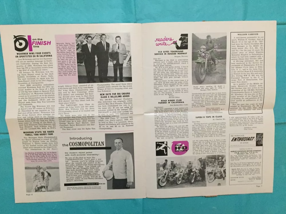 ITEM:::: This Listing is for an original March 1960 issue of HARLEY-DAVIDSON "ENTHUSIAST MAGAZINE" Motorcycle Dealer Sales Magazine..... . DIMENSIONS:::: About 9 by 6 inches and it unfolds 1 time; then there are 8 larger pages with covers.. ...... CONDITION:::: The general overall condition is G/VG ...... (Please refer to pictures & e-mail for details). ......... ABREVIATIONS:::: E=Excellent with no issues..... VG = Very Good with very lite issues..... G/VG = Good to Very Good with lite issues..... G + = Good+ with lite to moderate issues..... G = Good with moderate issues..... G - = Good- with moderate+ issues..... F/G = Fair to Good with quite a few issues..... F = Fair with many issues..... P = Poor with lots of issues..... Please let the pictures help you decide condition because they are an integral part of the description! Please e-mail with questions...... I will combine shipping & you will only pay $6.98 for shipping no matter how many items you accumulate! You can take up to 30 days to accumulate Items for combined shipping. Please drop me a note after your 1st win letting me know that you intend to wait to pay so that you can take advantage of combined shipping...... I will ship your Package to the address that you have registered on EBAY---Ergo, I will ship to the address that is on the shipping label when I print it from EBAY---Please do not ask me to ship to any other address---I will not do it! My goal is 100% satisfaction! I will refund 100% of your costs if you are not satisfied! Thanks for visiting!