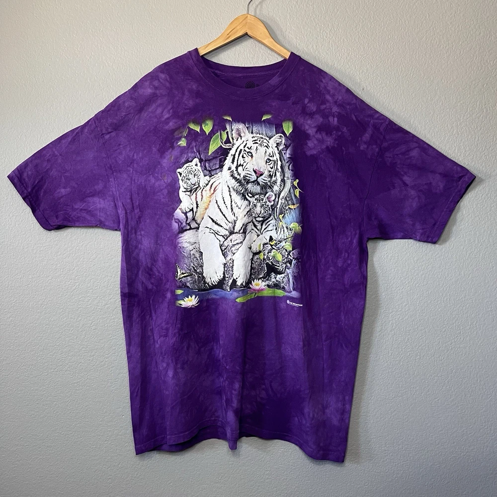 Thank you for shopping Raven's Resale. The mountain marbled purple short sleeve T-shirt. Graphic print image of a white tiger with blue eyes and cubs. •Brand-The mountain •Size-Unisex 4XL •Condition-preowned, great condition, lightly worn, no damage •Material-100% cotton Measurements taken when laid flat: •Pit to pit-28 Inches •Length-35 Inches
