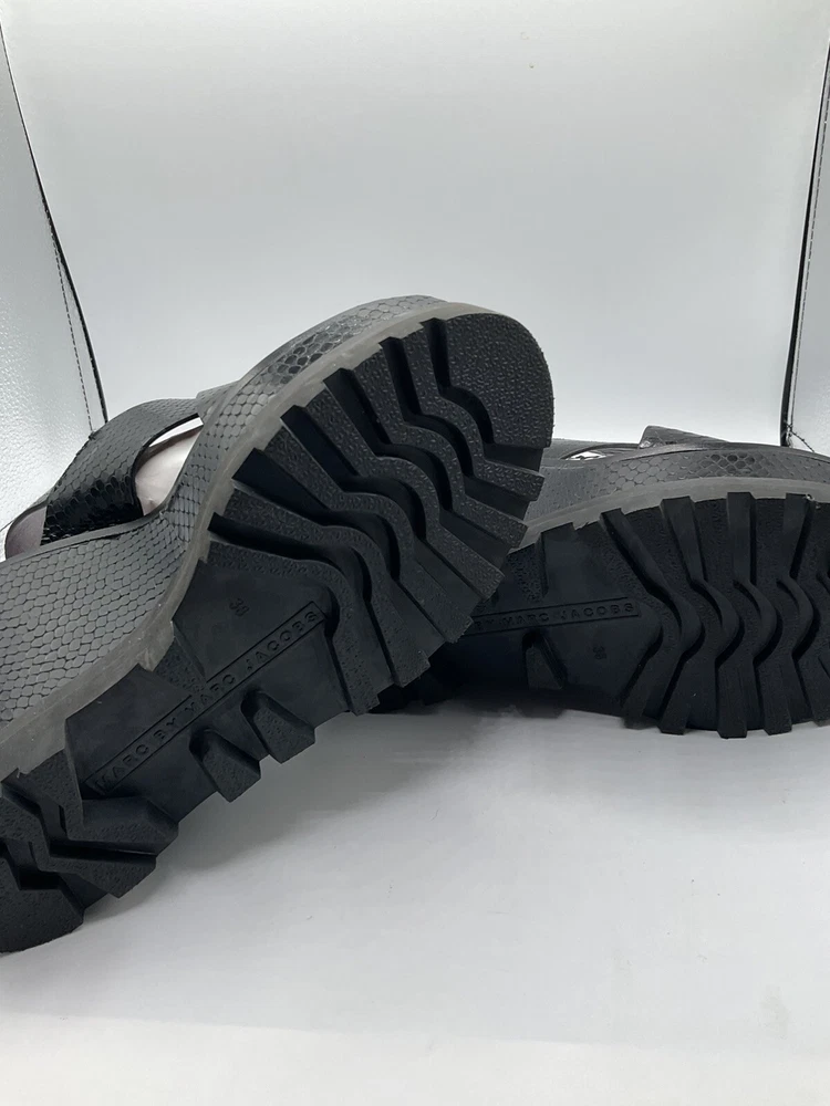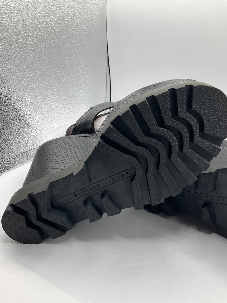 Elevate your shoe game with these stylish Marc By Marc Jacobs black patent leather wedges. With a snake look pattern and scalloped accents, these shoes are perfect for any occasion - from casual outings to cocktail parties. The adjustable ankle strap and buckle closure ensure a secure fit, while the 5 inch wedge heel provides a comfortable and trendy lift. These shoes are a must-have for any fashion-forward woman, and they come in a size 8. Made in Italy with high-quality materials, these shoes are built to last. Add a touch of designer flair to your wardrobe with these cute and stylish wedges.