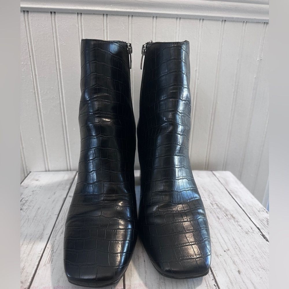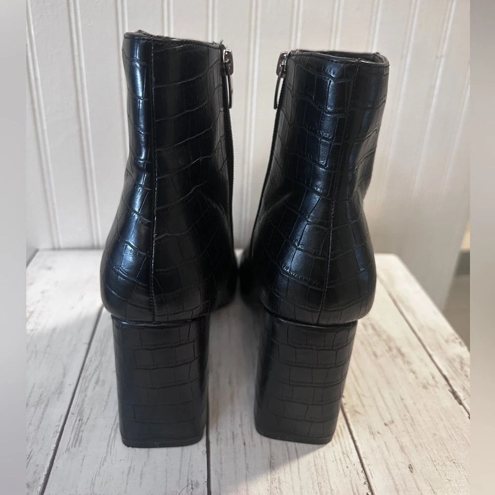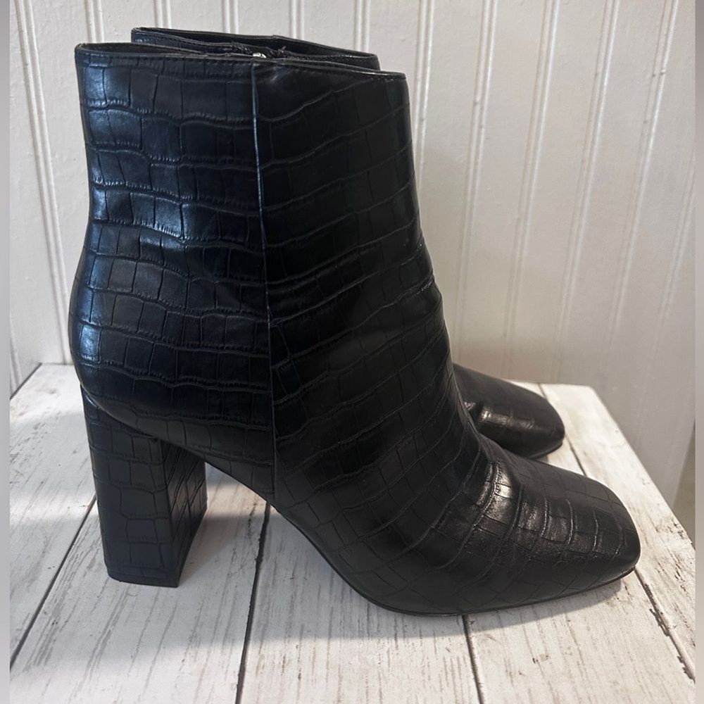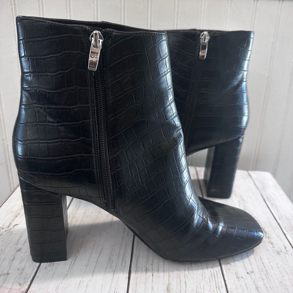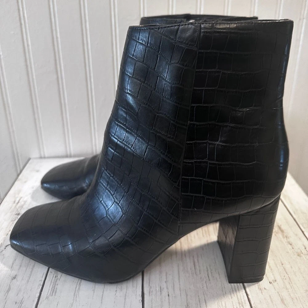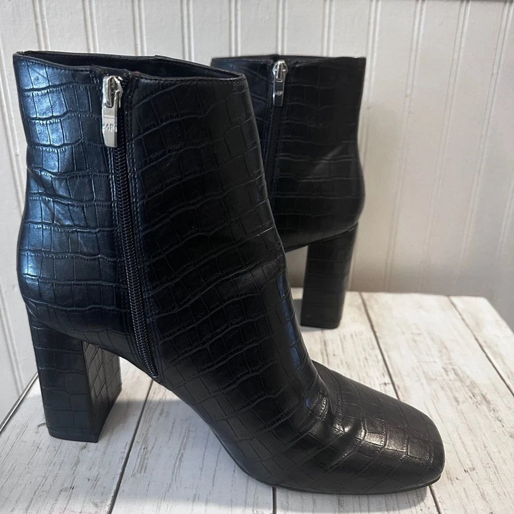 Step up your style with these Marc Fisher black croc-embossed ankle boots. Featuring a sleek crocodile-embossed pattern and silver-tone zip closures, these boots offer a sophisticated edge to any outfit. The sturdy block heel (3”) provides height and comfort, perfect for all-day wear. Made from high-quality man-made materials, they’re versatile for pairing with jeans, dresses, or skirts. These boots are in excellent condition, with minimal signs of wear. Marc Fisher boots, croc-embossed boots, black ankle boots, block heel boots, 3-inch heel, trendy boots, zip closure boots, women’s fashion boots, casual chic boots, sophisticated boots.