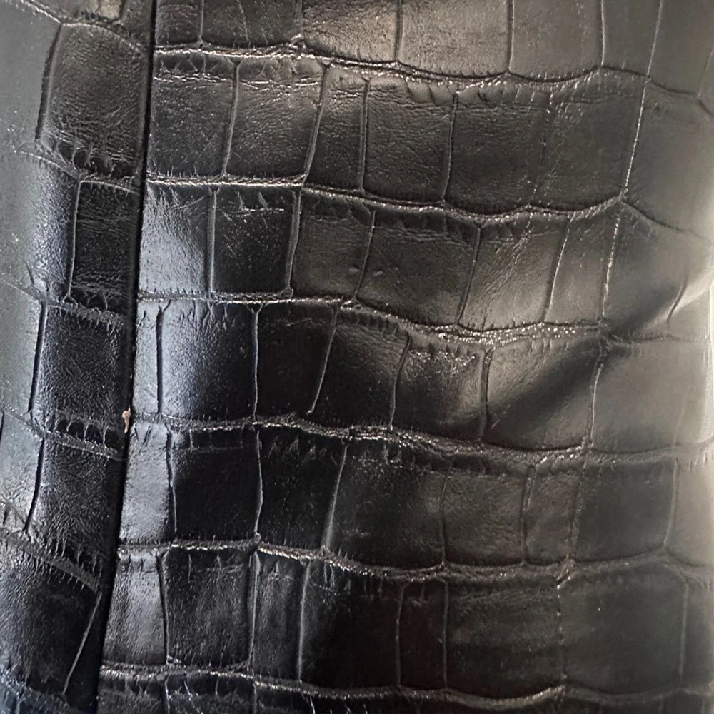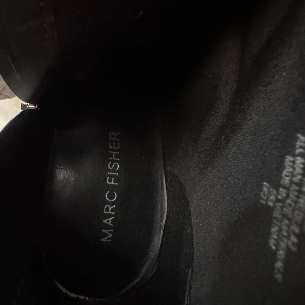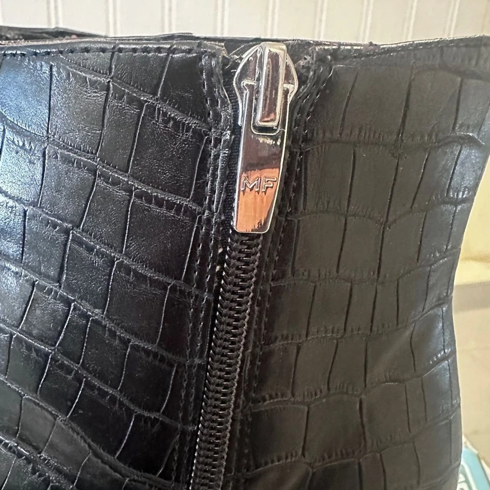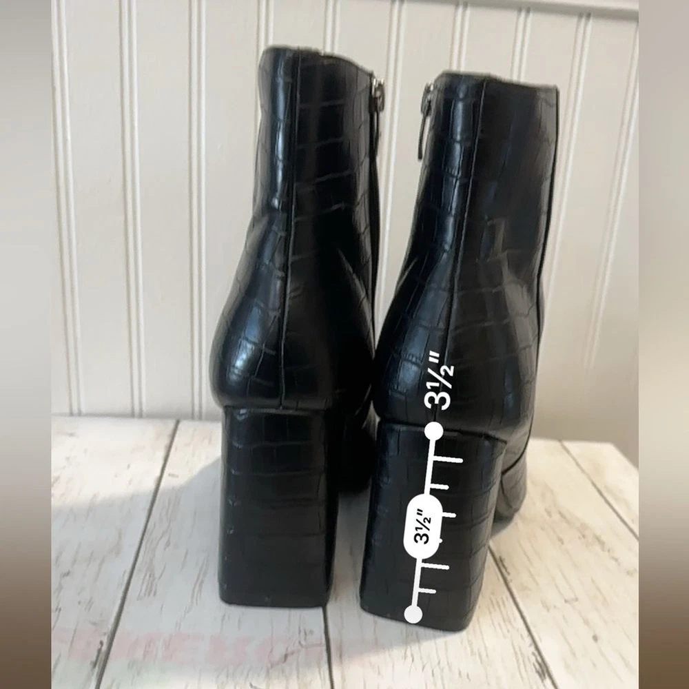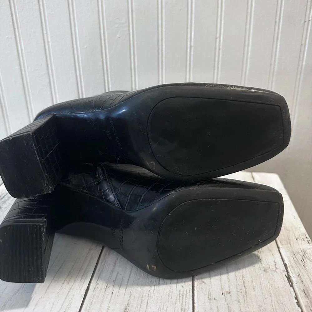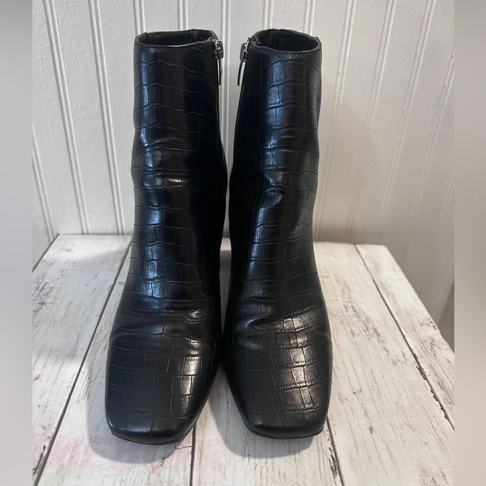 Step up your style with these Marc Fisher black croc-embossed ankle boots. Featuring a sleek crocodile-embossed pattern and silver-tone zip closures, these boots offer a sophisticated edge to any outfit. The sturdy block heel (3”) provides height and comfort, perfect for all-day wear. Made from high-quality man-made materials, they’re versatile for pairing with jeans, dresses, or skirts. These boots are in excellent condition, with minimal signs of wear. Marc Fisher boots, croc-embossed boots, black ankle boots, block heel boots, 3-inch heel, trendy boots, zip closure boots, women’s fashion boots, casual chic boots, sophisticated boots.