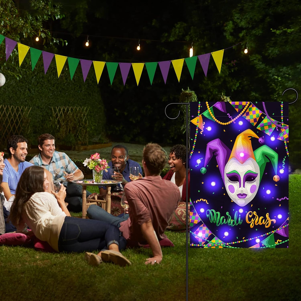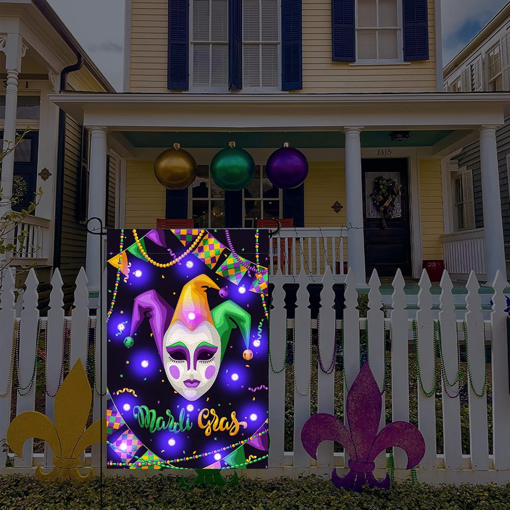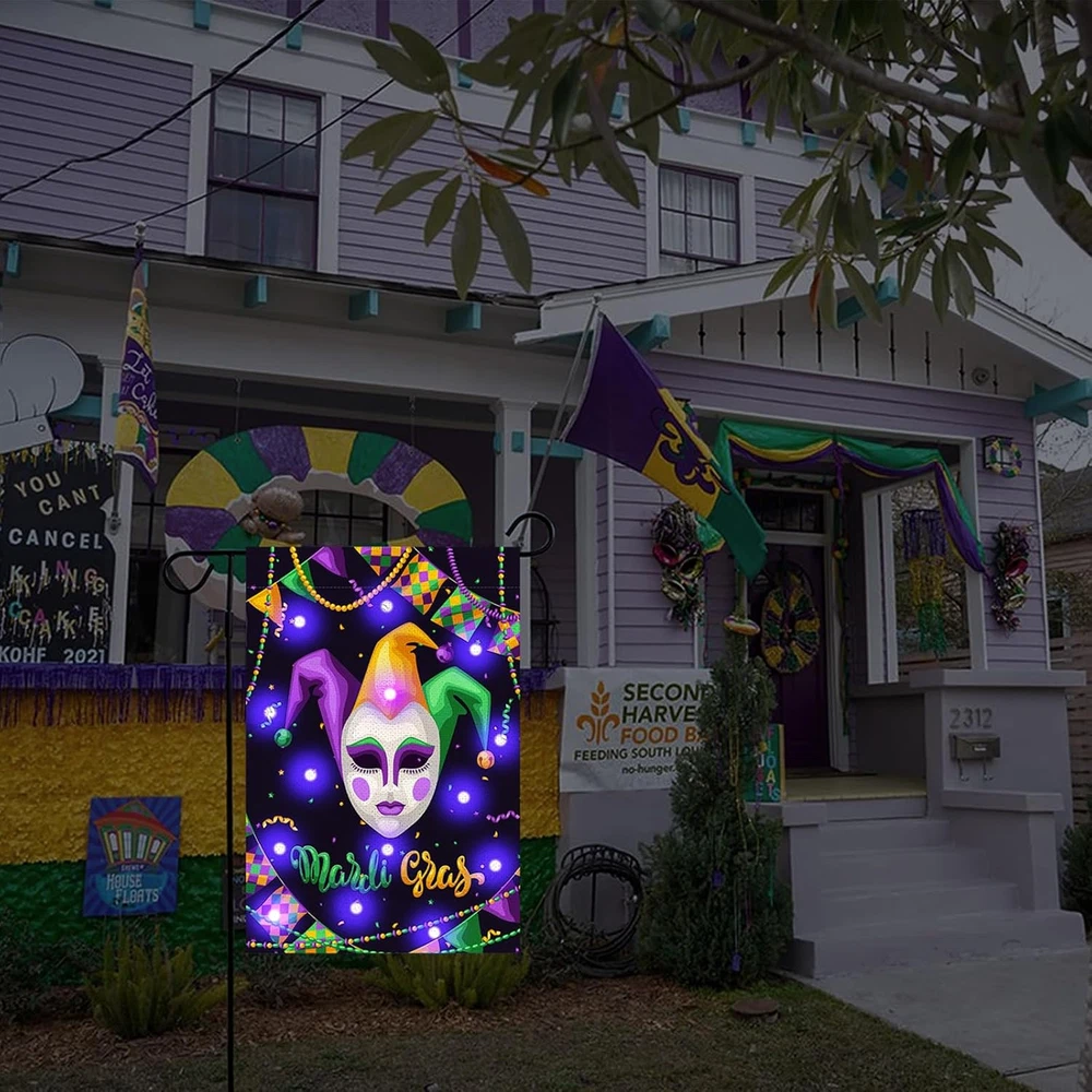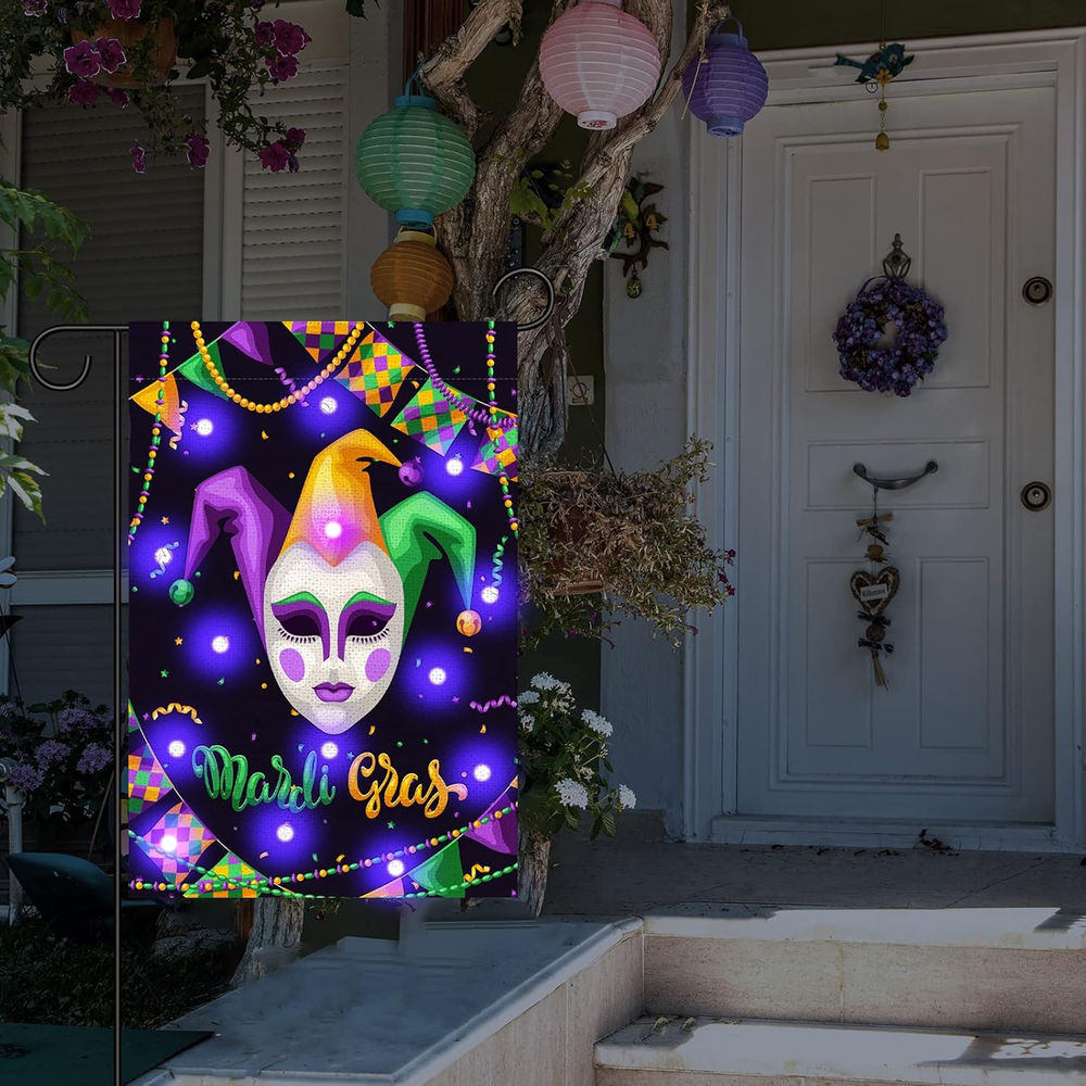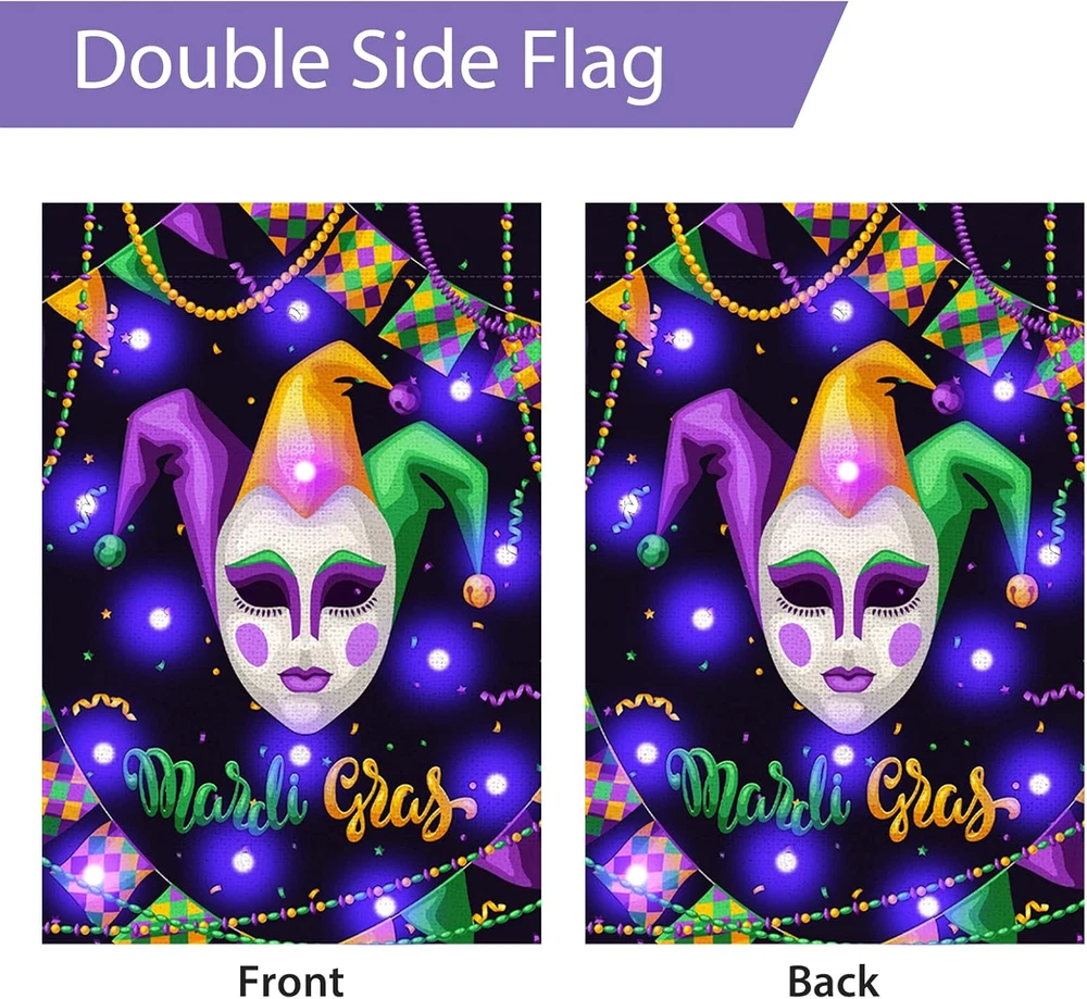 Menu Other Items Feedbacks About Us Contact Us Add To Favorites Mardi Gras Lighted Garden Flag 12X18 Double Sided Harlequin Mask Garden Flag Vertical Carnival Garden Flags for Mardi Gras Yard Outdoor Decoration Mardi Gras Lights Design: Our Mardi Gras garden banner is carefully designed by our designers, using classic elements of Mardi Gras. During the day, this Christmas outdoor garden banner will add eye-catching color to your outdoor patio decor. At night, this garden banner will emit lights to better create a festive atmosphere that complements your home garden. In addition, we have a variety of garden flags for you to choose from Quality Material: Our Mardi Gras Lighted Garden Flag is made of 100% durable burlap with double stitching all around for durability. The garden flag measures 12x18 inches and is suitable for decorating your home garden, flagpole not included Double Sided Printing: This Carnival Garden Flag Is Colorfast, Double Sided Design, Double Sided Printed Image, Visible On Both Sides, You Can Also Read The Text Correctly From Both Sides, So You Can Use It Again And Again Delightful Surprise: Our vertical holiday decoration yard banner consists of masquerade images and warm text, which are traditional elements of Mardi Gras, and can be a surprise for family and friends who love Mardi Gras decorations Great Decoration: This double-sided masquerade garden flag helps to create a joyful and warm holiday atmosphere, just hang it on your deck, patio, porch, backyard, lawn, garden or other places, it is also a good decoration for carnival parties, carnivals and more Features: Delightful Surprise: Our vertical holiday decoration yard banner consists of masquerade images and warm text, which are traditional elements of Mardi Gras, and can be a surprise for family and friends who love Mardi Gras decorations Great Decoration: This double-sided masquerade garden flag helps to create a joyful and warm holiday atmosphere, just hang it on your deck, patio, porch, backyard, lawn, garden or other places, it is also a good decoration for carnival parties, carnivals and more Specifications: Material: Sackcloth Size:16x12inch Theme:Mardi Gras Notes: Manual measurement, please allow slight errors on size. The color may exist a slight difference due to different screen displays. Item Specification Item model number -8 Color Style 2 Country of Origin China Item Weight 2.08 ounces Theme Christmas Recommended Uses For Product Outdoor Package Dimensions 11.89 x 9.06 x 0.75 inches Shipping FREE FREE SHIPPING We are always working hard to ensure your package arrives as soon as possible. Please understand that some factors like weather, high postal traffic, and the performance of shipping companies are outside of our control. We offer free shipping to the lower 48 states. We do not accept P.O. Boxes. Please provide a physical address. If you have a problem or question regarding your transaction please contact us immediately. We will work with you to resolve any problem you may have. Thank you