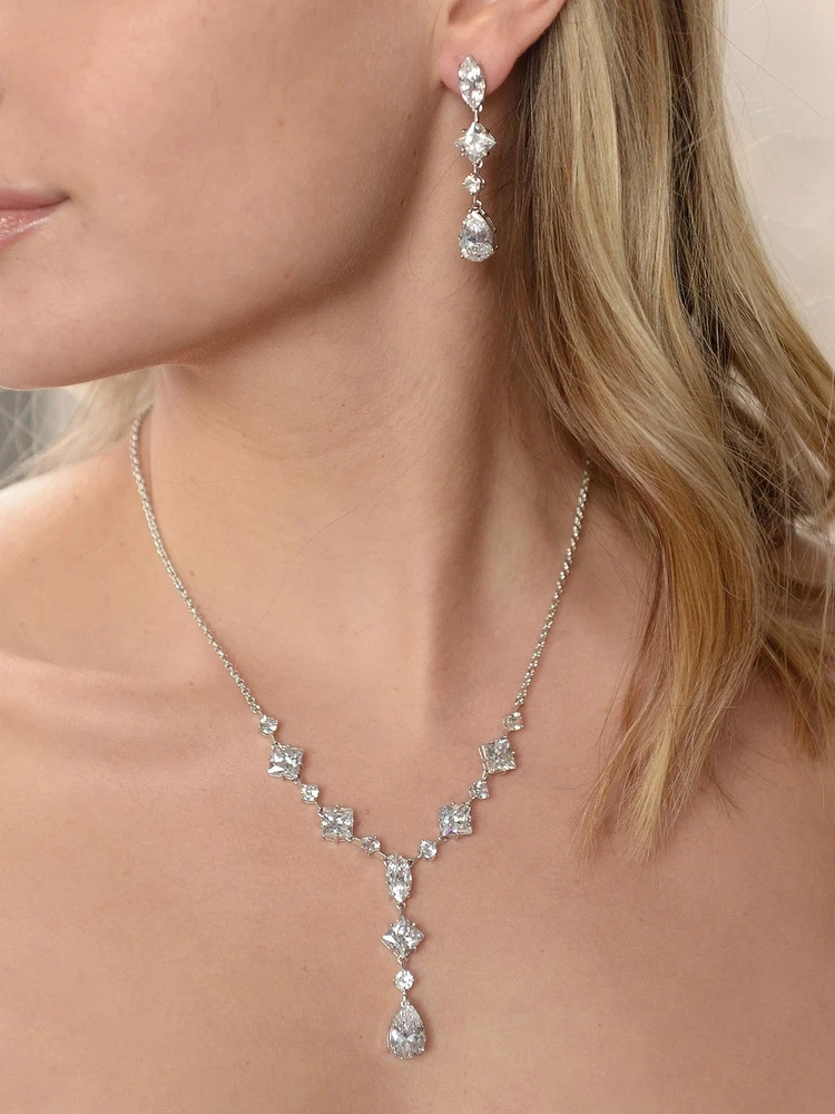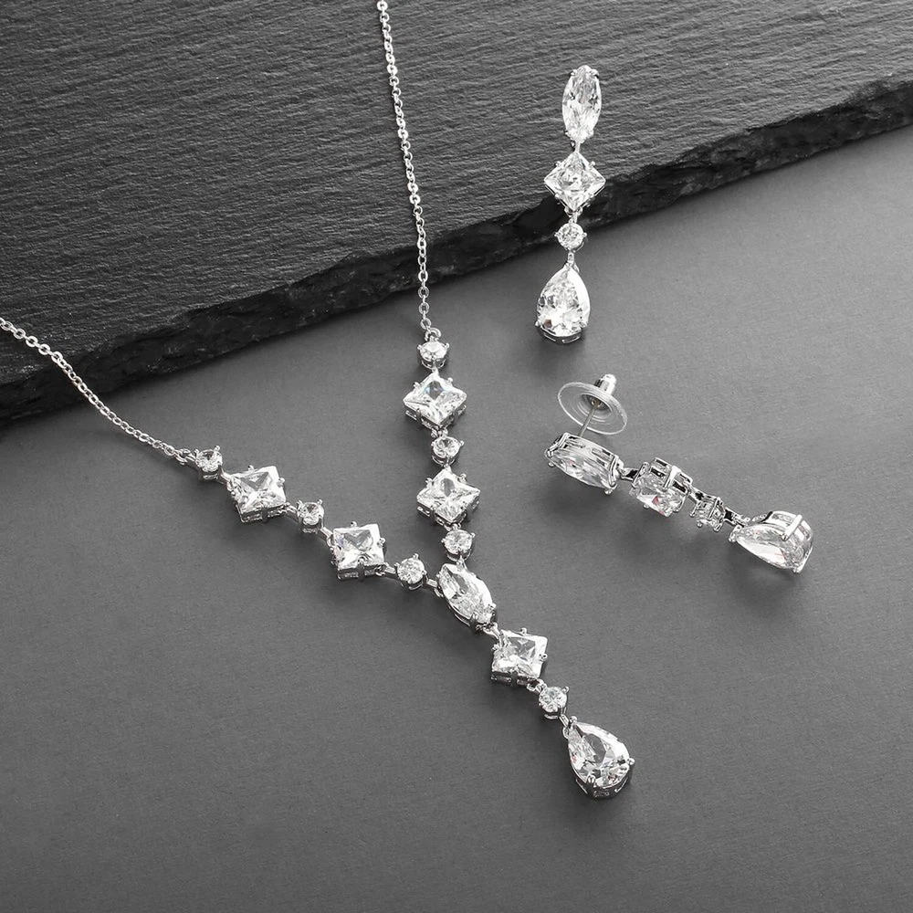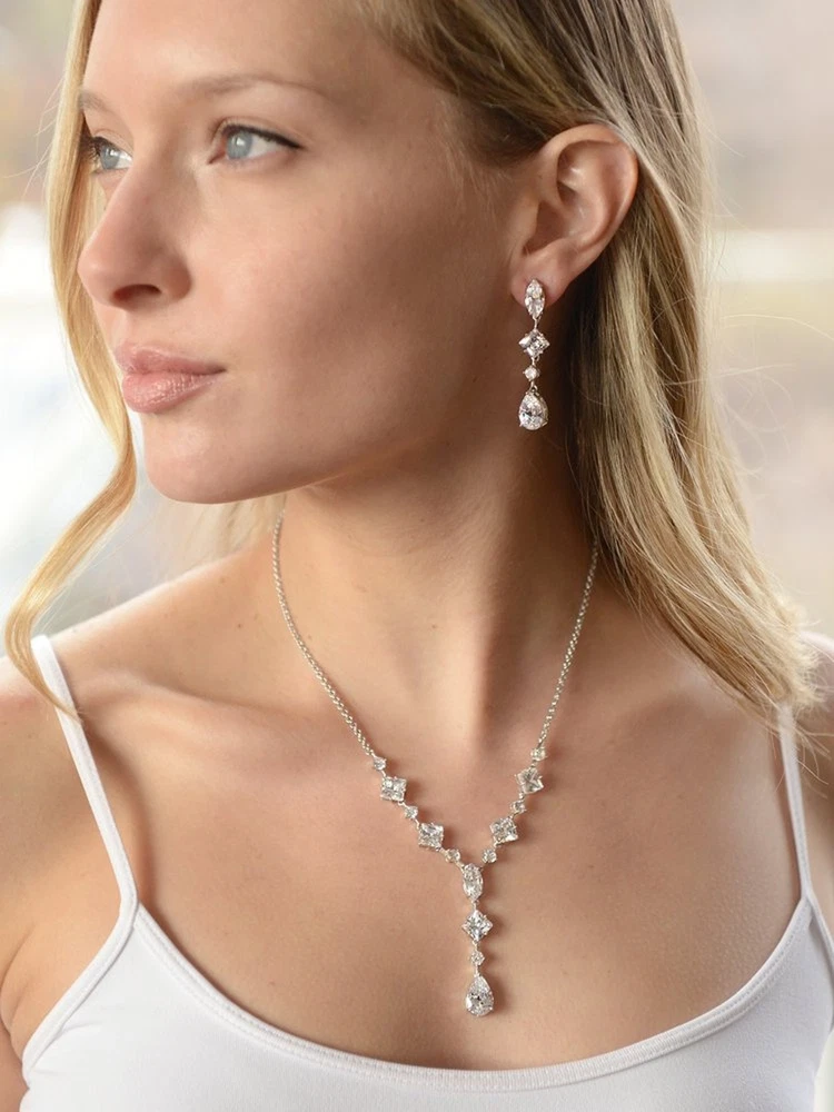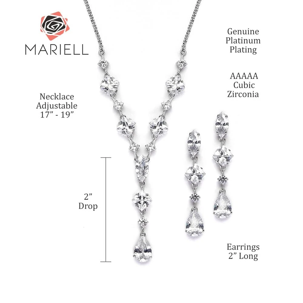 Mariell Cubic Zirconia Necklace & Earrings Bridal Jewelry Set, CZ Crystal Statement Necklace Set for Weddings, Formal Events, Mother of The Bride Product Details Is Discontinued By Manufacturer : No Product Dimensions : 19 x 0.39 x 2 inches; 1.76 ounces Item model number : 3564S Department : womens Date First Available : July 22, 2015 Manufacturer : Mariell Brand, Seller, or Collection Name: Mariell Metal stamp: Not stamped Metal: rhodium-plated-brass Material: Metal, Gemstone Gem Type: Cubic Zirconia Setting: 4prong Item Length: 19 inches Height: 2 inches Width: 0.39 inches Length: 19 inches Chain: Link Clasp: Lobster Clasp Resizable: No Number of stones: 24 Model number: 3564S Mariell's exquisite Wedding Necklace and Earrings set features a mix of pears, rounds, marquise and princess cut Cubic Zirconia stones. This glamorous bridal jewelry is guaranteed to turn heads at any special event! Seeking a fresh, contemporary wedding or high fashion special event showpiece? This set is the one! The necklace is adjustable 17" - 19" and plunges 2" at the center. The dangle earrings are 2" long. Treat yourself or someone you love to some seriously gorgeous sparkle.
