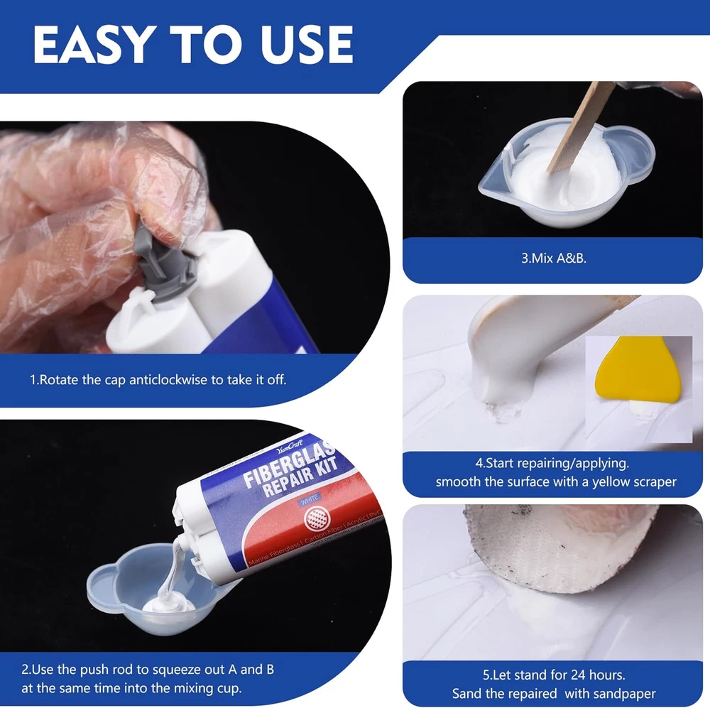 Multi-function: Our marine fiberglass repair kit is designed for the deep scratches, cracks, and holes of various water transportation devices such as repairing boats, yachts, and motorboats to ensure efficient and seamless repair effects and restore the original appearance. Excellent repair effect: This white gel coat repair kit uses high-performance epoxy fillings that have excellent anti-friction, waterproof, and ultraviolet capacity to ensure that the repair area can last long be durable under marine conditions, and maintain many years of attractiveness. Extensive applicability: Fiberglass resin and hardener kit is suitable for a variety of materials, including glass fiber, PVC, aluminum, acrylic acid, and ceramics, which can effectively fix different types of damage, and is widely used in the repair of ships and home items. This kit includes: 2 fiberglass repair kits, 1 silicone cup, 2 pairs of gloves, 1 scraper, 4 stirrers,1 push rod, and 2 sandpapers. Material safety: Our marine fiberglass resin uses non-toxic materials to ensure safety for users and the environment. If the purchased products are damaged or lacking tools, you can contact us at any time, and we will give the most effective solutions at the fastest speed. (Instruction on the box) Product Description